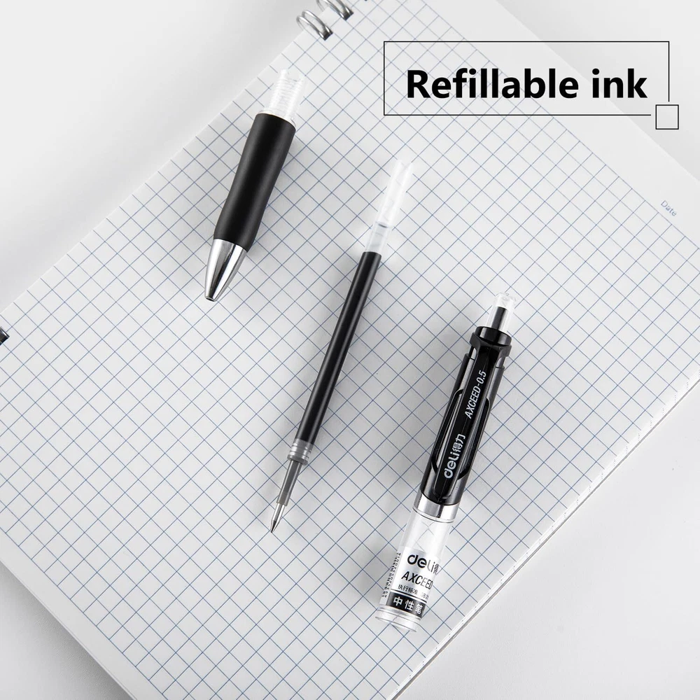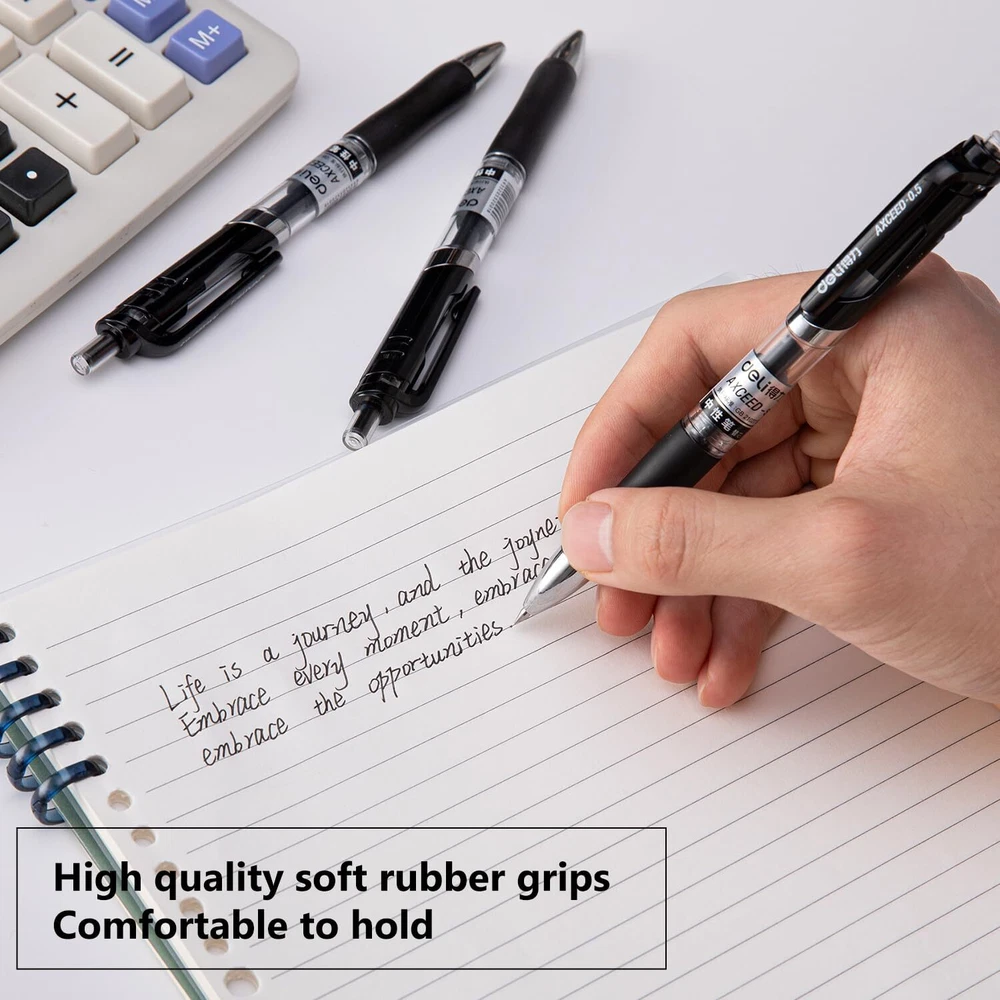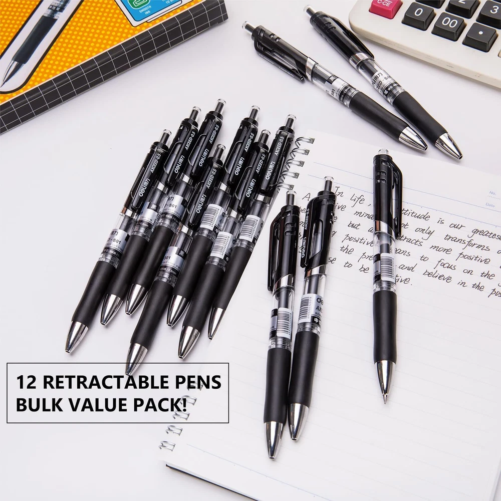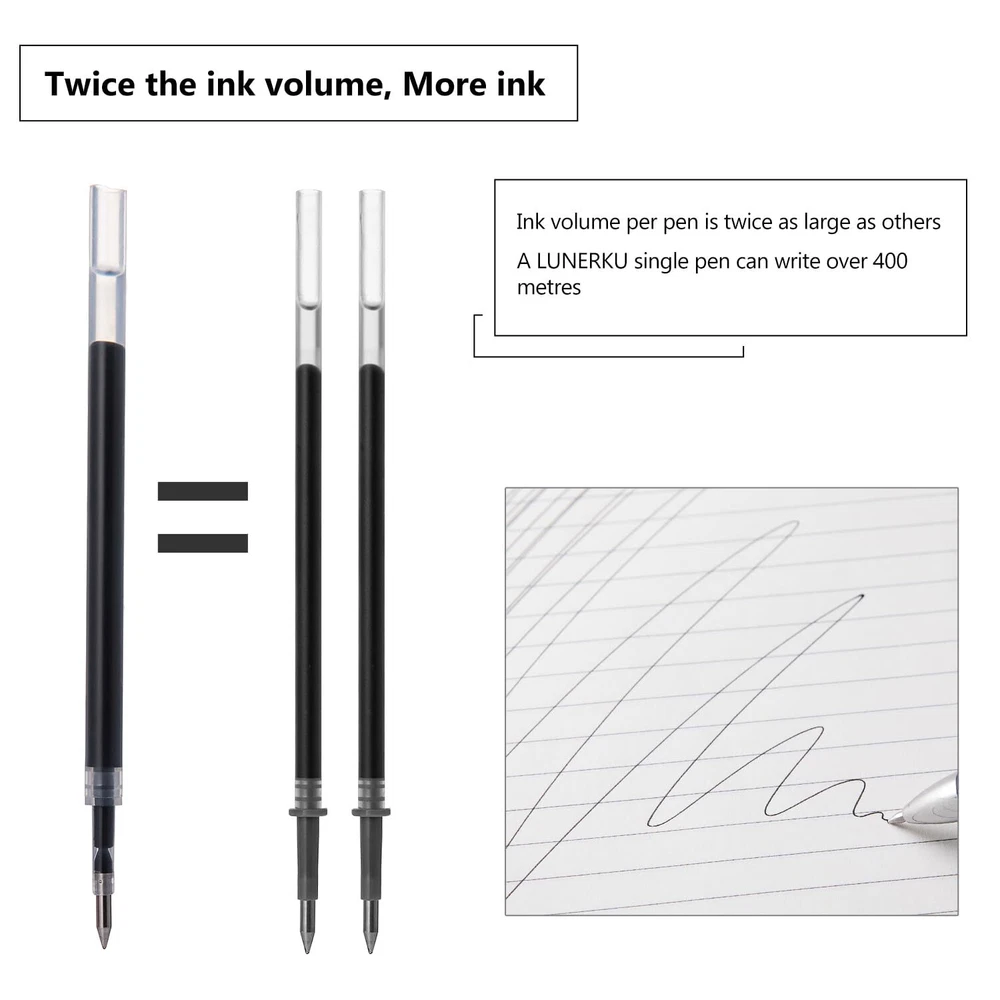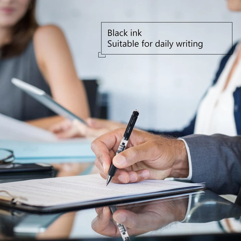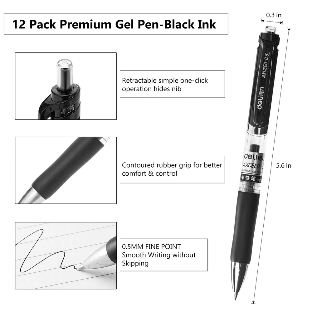 Overview: What your get: 12 pcs Premium LUNERKU Retractable Roller Ball Gel Pens. Specifications: Size: length: 5.6in/14.2cm, diameter: 0.3in/0.8cm. Refill: 0.5mm/0.2in-Black Ink. Color: Black Advantages: ✍️ Perfect Gifts stylish design style, make the pens a great gift for birthdays, back-to-school days, Children’s Day and Christmas Day. It’s good for men women kids girls nurses students teachers friends and co-workers. ✍️ Dry Quickly This journal pens dry quickly, with no leak, no smears, no smudges, and no globs. It's smooth and continuous when writing and drawing. ✍️ Multifunction These pens are great pens for aesthetic school supplies, office supplies, journaling, note taking, and planning. ✍️ Contemporary clip for modern convenience Never lose your pen again! Each LUNERKU pen features a stylish and sturdy clip designed for the fast-paced contemporary lifestyle. Attach it to your notebook, pocket, or bag, and have your writing tool handy whenever inspiration strikes. 12 Pack for Everyday Use- Never worry about running out of ink with the bulk pack of 12 gel pens. Perfect for all types of writing tasks, from drafting notes to detailed illustration or design work. 0.5mm Tip(Fine)- Achieve clean, precise lines with LUNERKU’s finely designed 0.5mm tip. Perfect for those needing precision in work, study, or creative pursuits. Quick-Drying Ink- No more smears or smudges with our quick-drying ink formula. Get peace of mind in every stroke as the ink dries instantly, keeping your words sharp and clear. Comfortable Grip-Our neutral pen is designed with a comfortable grip in mind. Long hours of writing won’t be a strain anymore, ensuring optimum comfort and control. Durble Pen Clip Design-You can clip the pens to the book or the file, which is convenient to carry and prevents loss.
