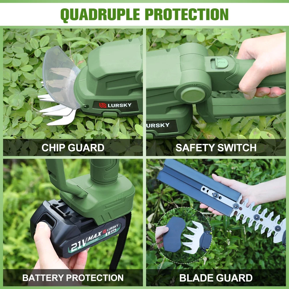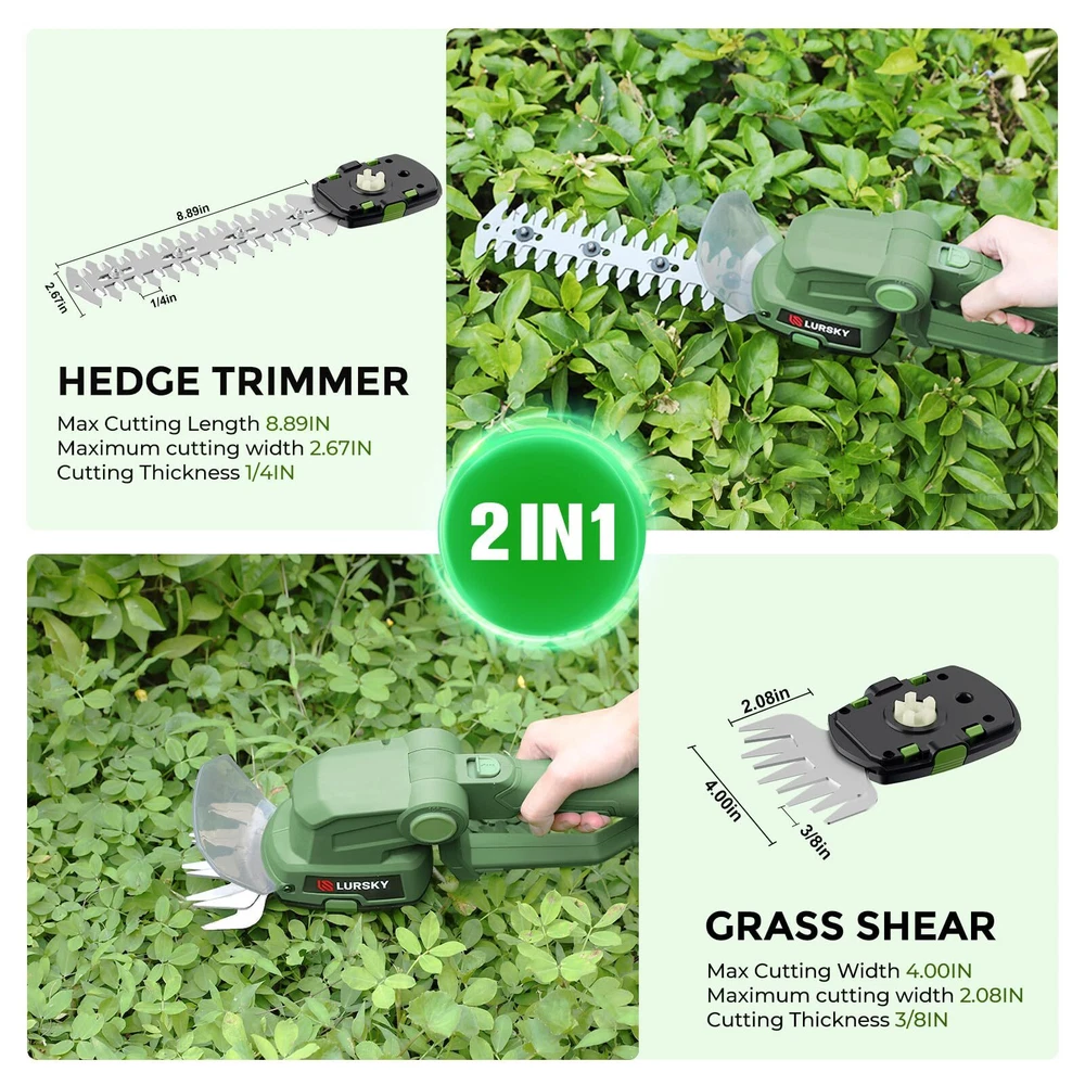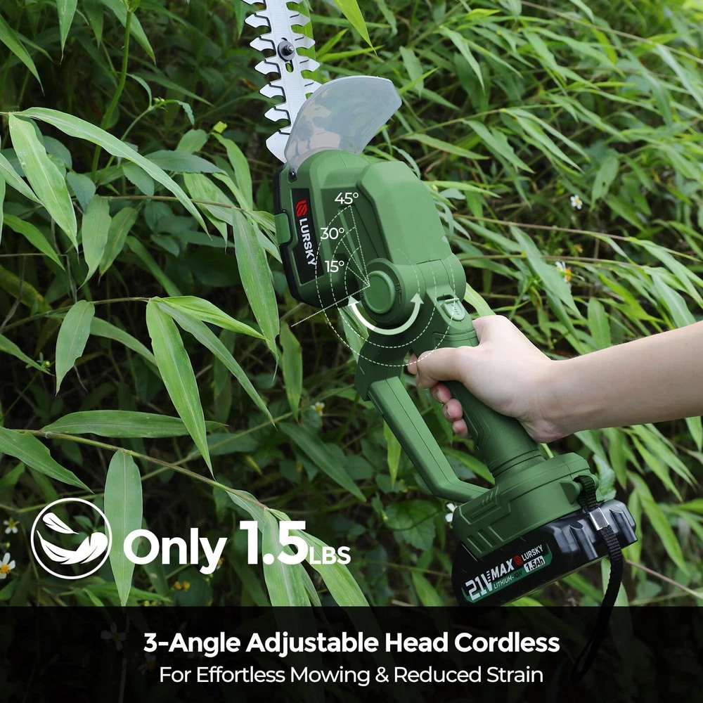 Effortless Cordless Operation:LURSKY's cordless hedge trimmers offer hassle-free use with no cords or gas required. The long blade is perfect for thin shoots on hedges, bushes, small trees, and ornamental plants, while the short blade is ideal for cutting grass, weeds, and small lawn areas. The 21V Hedge Trimmer, powered by a 1.5Ah lithium battery, provides cordless convenience for light garden trimming tasks, making yard maintenance effortless Dual-Function Design: LURSKY's electric hedge trimmer and grass shear boast a seamlessly integrated design. With blade release buttons enabling effortless transitions between functions, the 4-inch blade is tailored for lawn maintenance (max cutting thickness 3/8in.), while the 8.89-inch blade (max cutting thickness 1/4in.) excels at precise trimming of hedges and shrubs Safety First:Our safety-centric approach sets us apart, featuring an additional shield to prevent garden debris from causing any harm. With dual safety locks, a safety switch, and upper trigger lock-out, accidental starts are effectively prevented. Plus, our dual heads come equipped with high-quality covers, ensuring both your safety and the protection of the blades. Trim with confidence, knowing that safety is our utmost priority Durable and Portable Design:LURSKY's Hedge Trimmer offers easy single-handed operation for extended use. The ergonomic handle ensures a comfortable grip, making it a compact and flexible tool for small gardening tasks.Cordless grass shears feature an adjustable machine head with 3 angles (15°, 30°, and 45°) for cutting grass in tight areas, providing a comfortable mowing experience, reducing strain on the back and shoulders, and customizing mowing based on terrain and grass height Perfect Present for Gardening Enthusiasts:Great for keeping lawns, gardens, and outdoor spaces pristine. Ideal for homeowners, gardeners, landscapers, and gardening enthusiasts. Perfect for gifting on birthdays, housewarmings, Father's Day, Mother's Day, Thanksgiving, anniversaries, Valentine's Day, and Christmas Advanced Battery Technology: LURSKY's Hedge Trimmer, when fully charged, provides continuous use for 50-70 minutes. Featuring a rechargeable 1.5Ah lithium battery with a quick 2-hour charge time, this trimmer ensures uninterrupted garden pruning. The battery's capacity directly impacts cutting performance, so it's recommended to fully charge it before the first use. With a detachable design and battery level indicator, this tool offers reliability and efficiency for all your landscaping needs Effortless Efficiency:Experience the power and versatility of the LURSKY trimmer. A robust motor delivers a whopping 1200 strokes per minute, ensuring you can breeze through even the most demanding trimming jobs. Featuring an adjustable head with three distinct angle settings, this innovative trimmer offers exceptional maneuverability, allowing you to reach and trim grass in tight spaces and under landscaping obstacles that a traditional mower can't access
