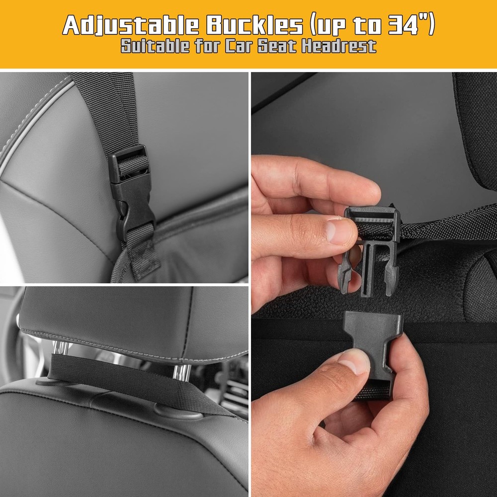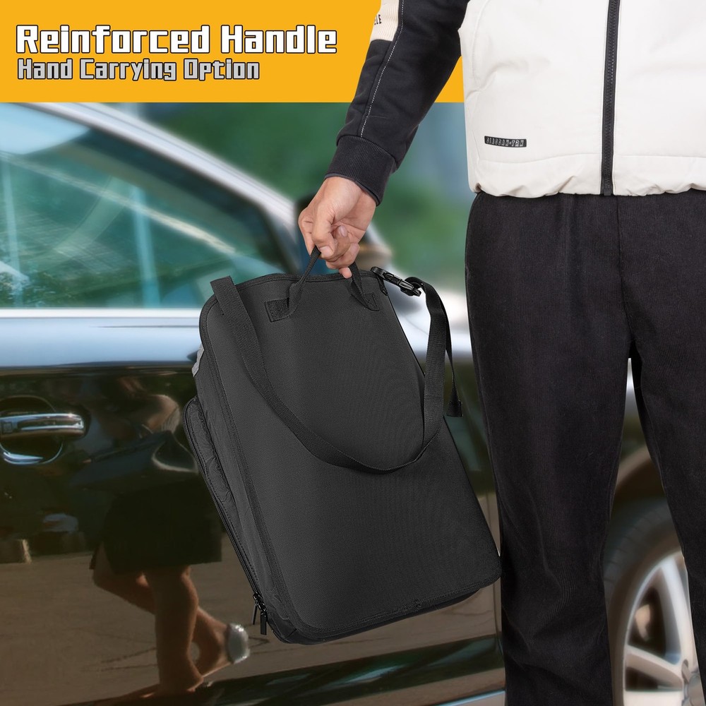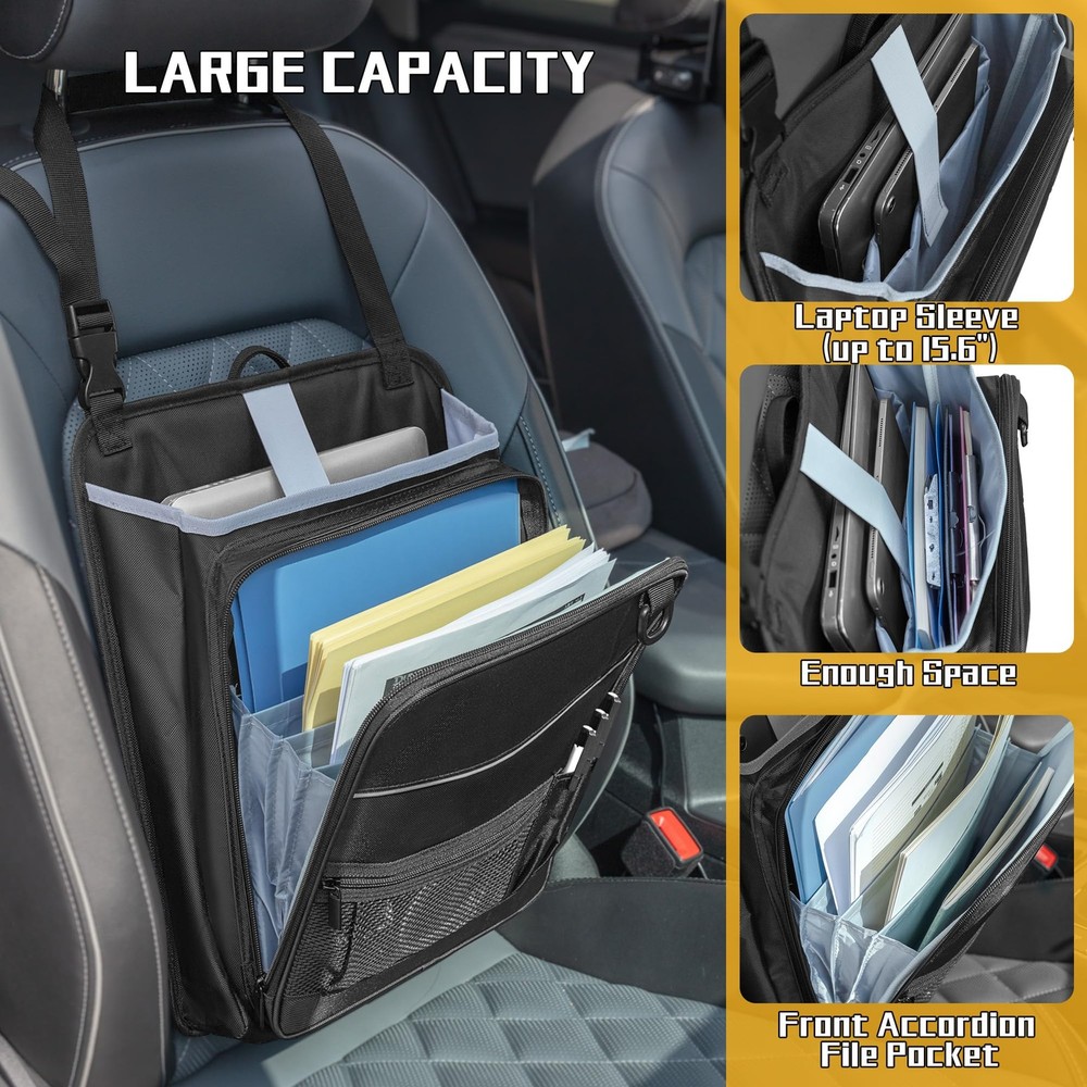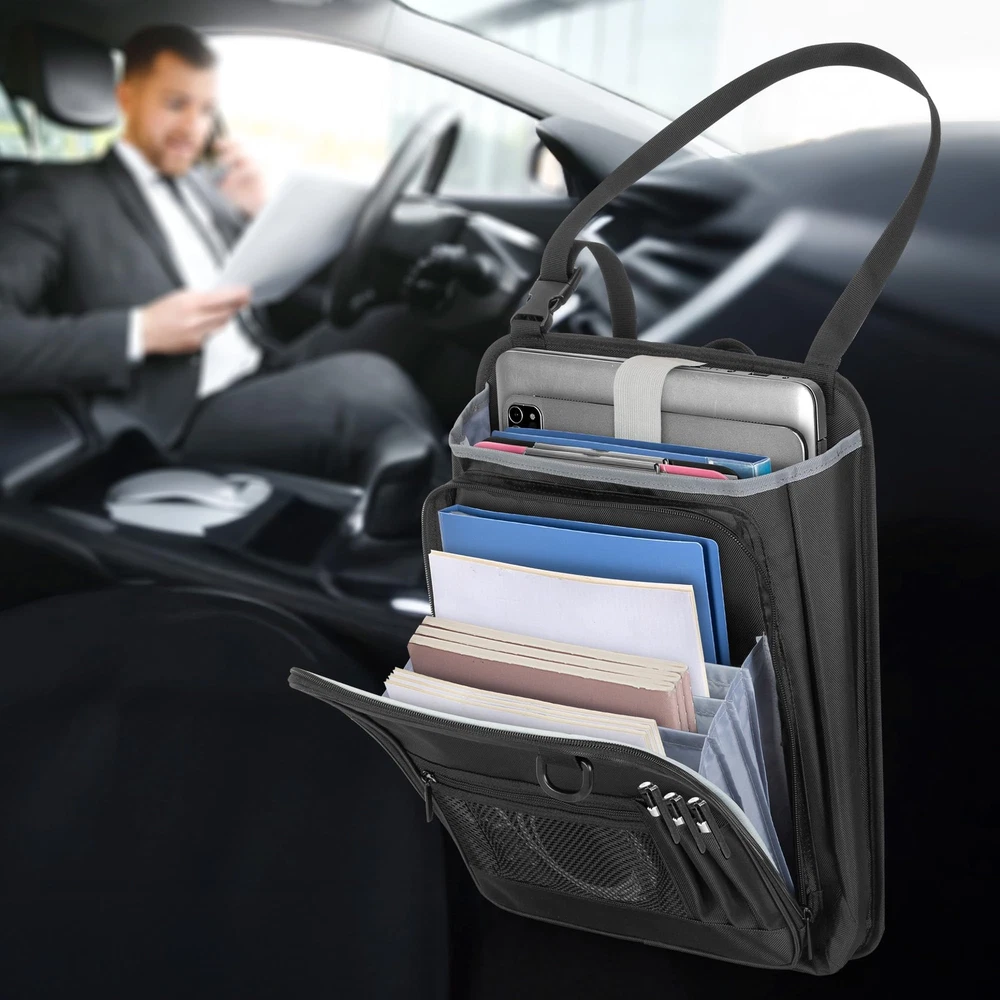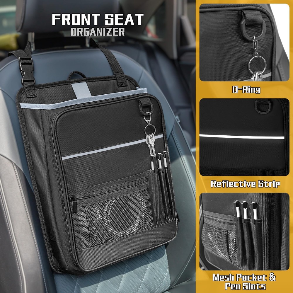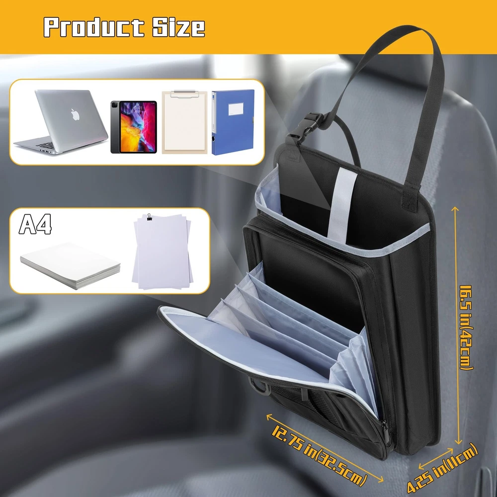 LUXJA Car Front Seat Organizer with Accordion File Pocket, Passenger Black LuxeFusion Product Description Features HIGH QUALITY:Made of premium oxford polyester, water resistant and abrasion resistant. Soft padded lining on the main compartment protects your truck stuff. ACCORDION DESIGN: The front accordion zipper pocket (total of 4 expandable pockets) for organizing files, A4 & letter size documents and more. LARGE CAPACITY:Main section includes two padded sleeves with an elastic strap fit tablet and laptop (up to15.6”). Spacious enough for folders, notebooks, clipboard and documents. A front mesh zippered pocket stores personal items, along with three dedicated pen slots. PORTABLE: A reinforced top handle and adjustable straps make it easy to carry and install. Includes a D-ring for keys and a reflective strip for added safety. DIMENSION: 12.75” X 4.25” X 16.5”. Adjustable buckle strap extends up to 34 inches. This truck seat organizer is good for keeping your vehicle neat and clutter-free on the go. Product Details Free Shipping All orders ship free and fast to your doorstep. Easy Returns Satisfaction guaranteed. 30-day returns, no questions asked. 24/7 Support Contact us anytime; we’re here to help, day or night. Brought to you by LuxeFusion – Quality you can trust.
