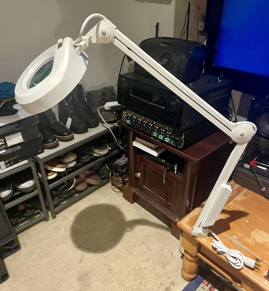 Illuminate your workspace with the Luxo Magnifier Lamp, a vintage workhorse designed to provide exceptional lighting for intricate tasks. With its articulating arm, this industrial lamp can be easily adjusted to focus light where you need it, whether you're repairing jewelry, drafting, or engaging in any detail-oriented activity. The lamp's large size, standing up to 45 inches extended, ensures a comfortable and efficient work environment. Crafted in the United States, the lamp showcases a mid-century industrial design, complete with a robust metal construction and a matte white finish that easily integrates into various settings. The round shade and flexible clip-on features make it an ideal addition for both professional workshops and home offices. This original Luxo piece, complete with a push-button control and a fluorescent tube lighting source, offers a timeless aesthetic and functionality. Luxo Vintage Magnifier Lamp is used, everything is working. Does not have clamp. Sold as is.