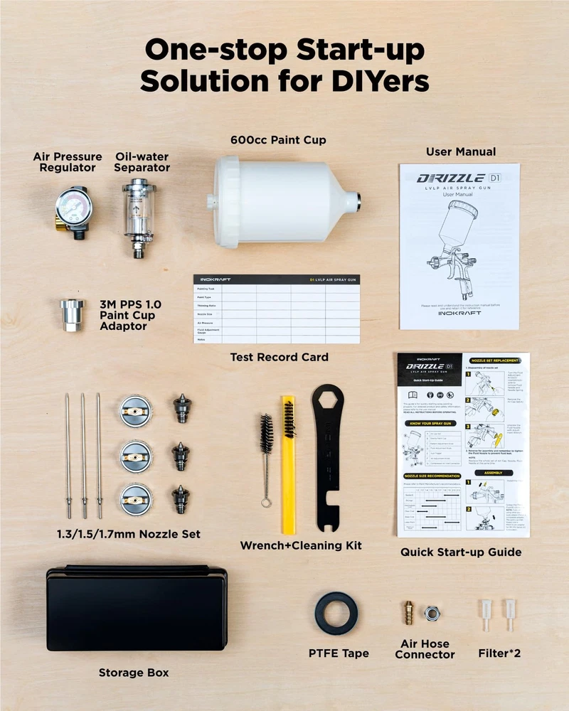D1-LVLP Spray Gun Premium Kit Spray Like a Pro with Ease: Drizzle D1 LVLP spray paint gun is designed for easy use, with clearly marked scales and labels on the body for quick operation. Our quick start-up guide, instruction manual and videos help you operate like a pro and start quickly. One-stop Start-up Solution for DIYers: D1 spray gun kit provides everything you need to start, pressure regulators, oil-water separators, frequently used nozzle sizes and more. You can start spraying projects right away. Superior Painting Quality & High Efficiency: Experience exceptional paint atomization and efficient transfer with D1 sprayer. Achieve professional and even finish with ease, while saving paint and reducing environmental pollution. Ideal for automotive, furniture and DIY painting projects. Easy to Clean & Built to Last: The D1 LVLP spray gun features a durable one-piece forged aluminum body with Teflon coating. This upgrade enhances wear resistance and makes cleaning a breeze. Your satisfaction is our priority!