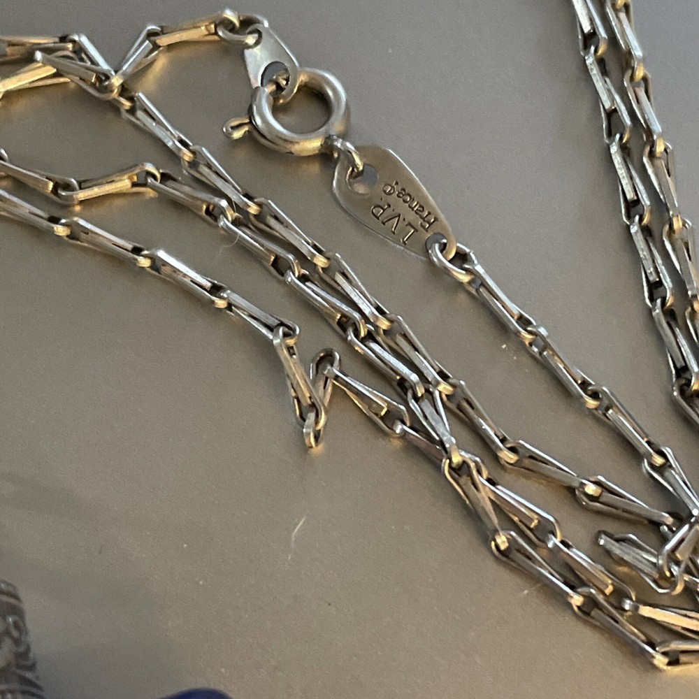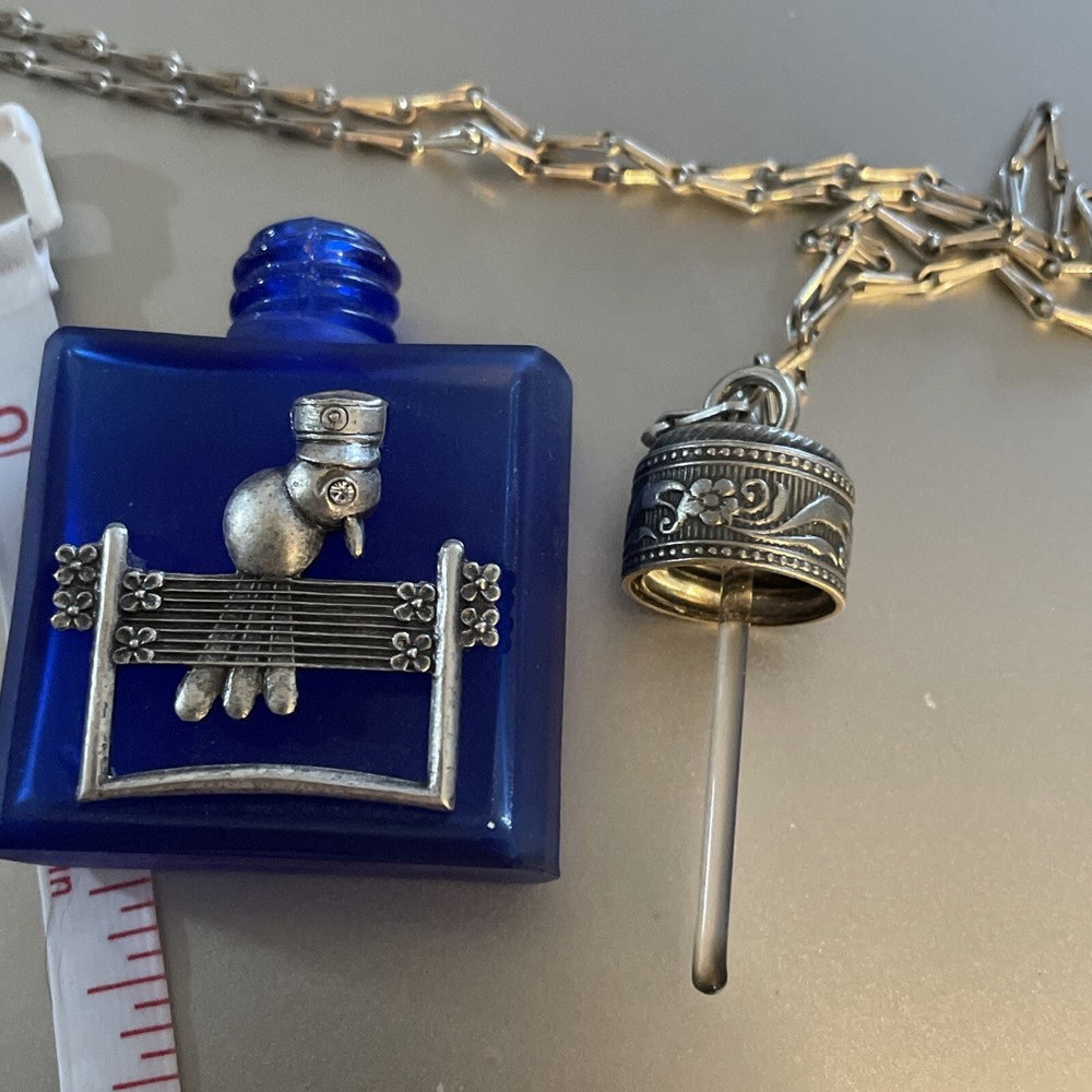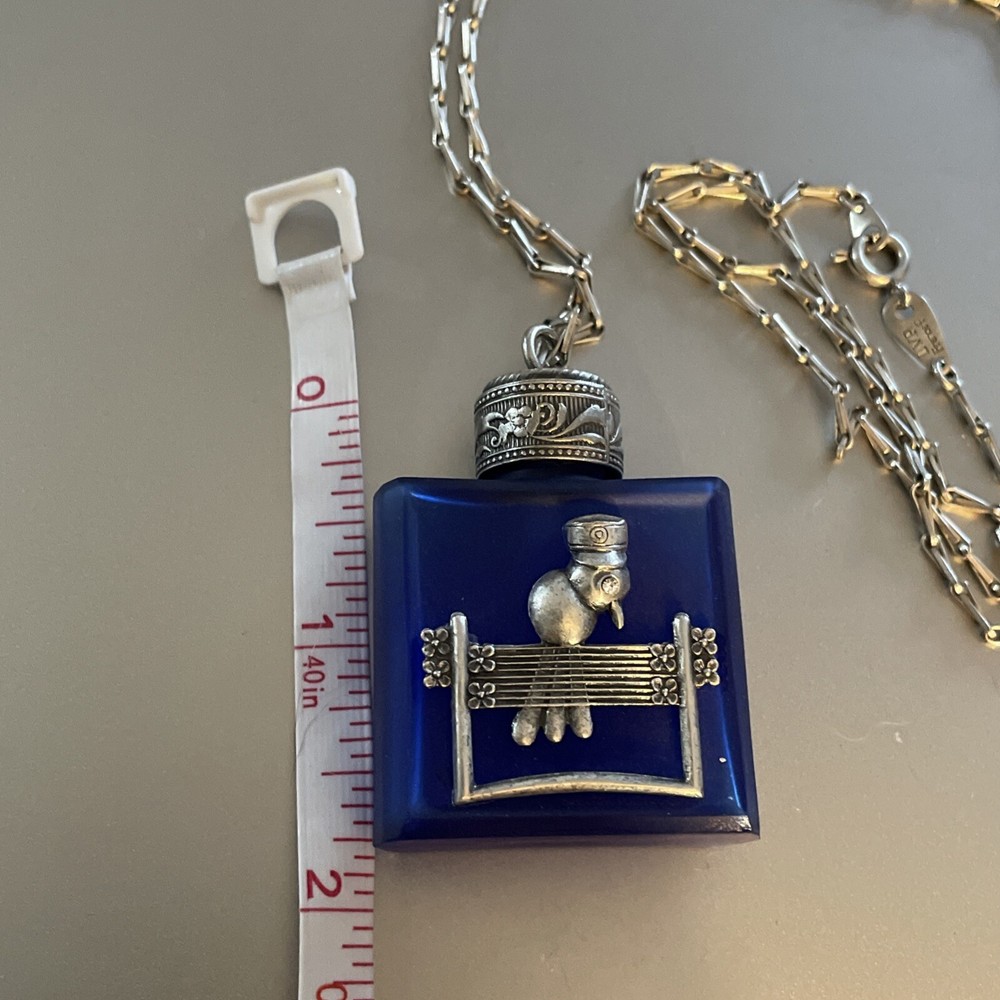 This is a LVP La Vie Parisienne France necklace featuring a perfume bottle pendant in cobalt blue. The necklace has a silver tone chain and measures 31 inches in length. It has a vintage vibe and is designed in a style that includes both a chain and a pendant. The pendant is an empty blue perfume bottle, ready to add your favorite scent. Please look at photos, as this is the exact item that you will receive! Pictures are the best description and feel free to ask questions of items before bidding. Please note that vintage items were cherished by a previous owner, and may have been worn. I clean and polish item but remember vintage items are rarely in "mint/perfect" condition. Each vintage item is closely looked at before listed, and it is described as detailed as possible. Please refer to the item pictures to view more about their condition Note that coin or any photo props in the pictures are not included.