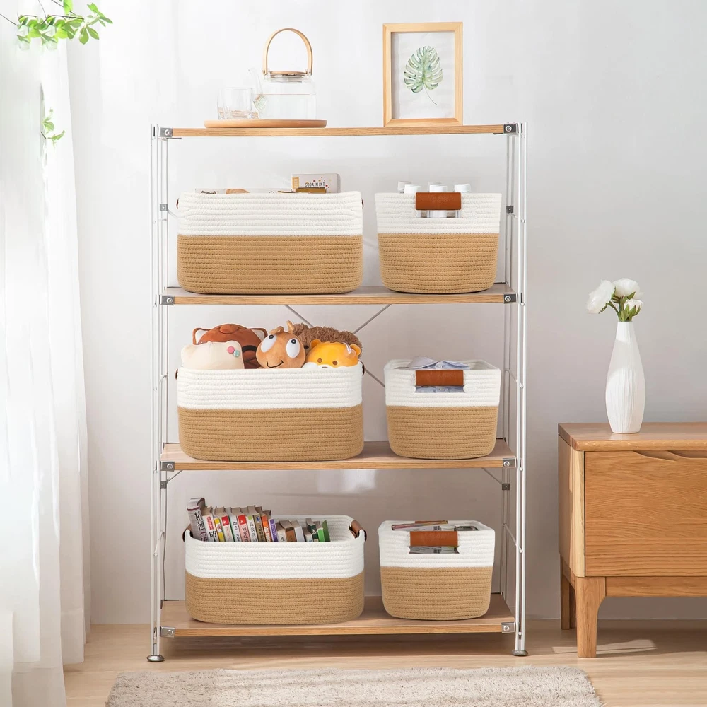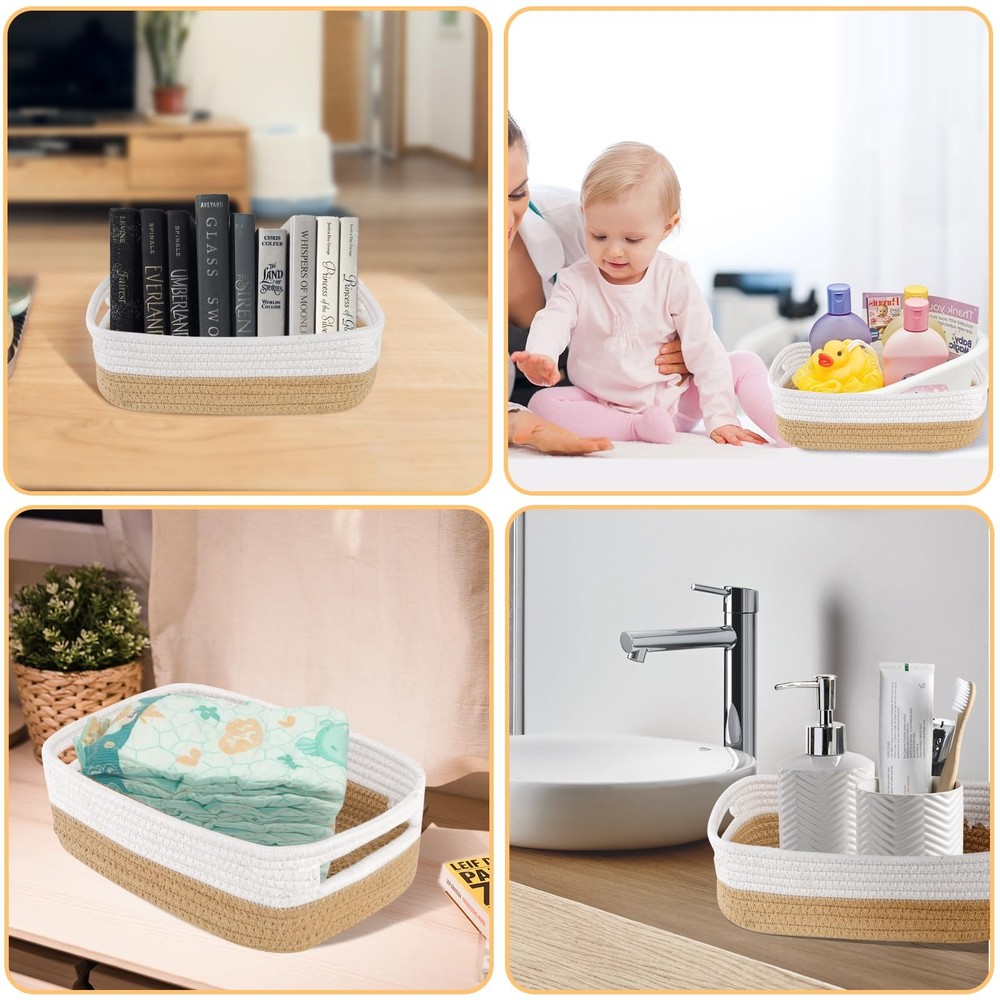 [ Cotton Rope Baskets for Storage ] The woven rope baskets for storage are the newest upgraded edition in Rectangular Base shape instead of the oval bottom that makes it more rigid, tight, and hold its structure. The handles of the small gift baskets empty on both sides are wrapped in brown natural leather, which is easy to carry and not harmful to your hand. No matter used for gift baskets, laundry basket, book basket, baby toy basket, dog toy basket, magazine basket, pantry baskets, easter baskets or decorative baskets, Our natural rope organizer bin is your perfect choice. [ Cotton Rope Baskets for Storage ] The woven rope baskets for storage are the newest upgraded edition in Rectangular Base shape instead of the oval bottom that makes it more rigid, tight, and hold its structure. The handles of the small gift baskets empty on both sides are wrapped in brown natural leather, which is easy to carry and not harmful to your hand. No matter used for gift baskets, laundry basket, book basket, baby toy basket, dog toy basket, magazine basket, pantry baskets, easter baskets or decorative baskets, Our natural rope organizer bin is your perfect choice. [ High-quality Material & Baby Safety ] Woven Storage Bins are made of thick cotton rope braids and pliable fabric that can be the baby basket; woven baskets for storage are soft, yet sturdy enough to stand up. The natural texture is safe for babies or toddlers. Decorative storage baskets have decent height and storage capacities, which perfect for baby organizers and storage. [Boho Stylish & MultiFunctional Baskets ] The weave of our rope baskets is tight and smooth, very decorative in the two-tone pattern which combines with white and yellow. The decorative baskets of the color is chic and fits seamlessly into any decor. These storage baskets for shelves can be used in the living room, nursery, playroom, laundry, bathroom, bedrooms, gym and your office, which could be used to store kids' toys, plush dog cat toys, pet supplies, books, blocks, bath Towels rolled up, clothes, yarn etc. Your imagination is the limit for using these. [ Nice Gift baskets ] Baby gift wrap for baby shower, wedding shower, new home/house warming gifts, Easter Basket, Cafe Home Decor; a gift bag for baby toddler kids wife housewife, toy organizer declutterer, creative designers and craftspersons, pet-keeper; a gift for her, girlfriend mother's day/teachers' day/Valentine's Day/Christmas Day [ Tips Before Order ] Pay attention to the size. They're two different storage-shelf size, small basket or large basket, to your choose. The basket comes folded and pre-squished in its packaging, please see the directions on "How to Reshape". If you are not satisfied or have any questions about our storage baskets, please contact us. We will help you solve your worries and difficulties.