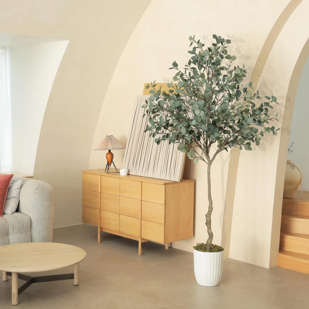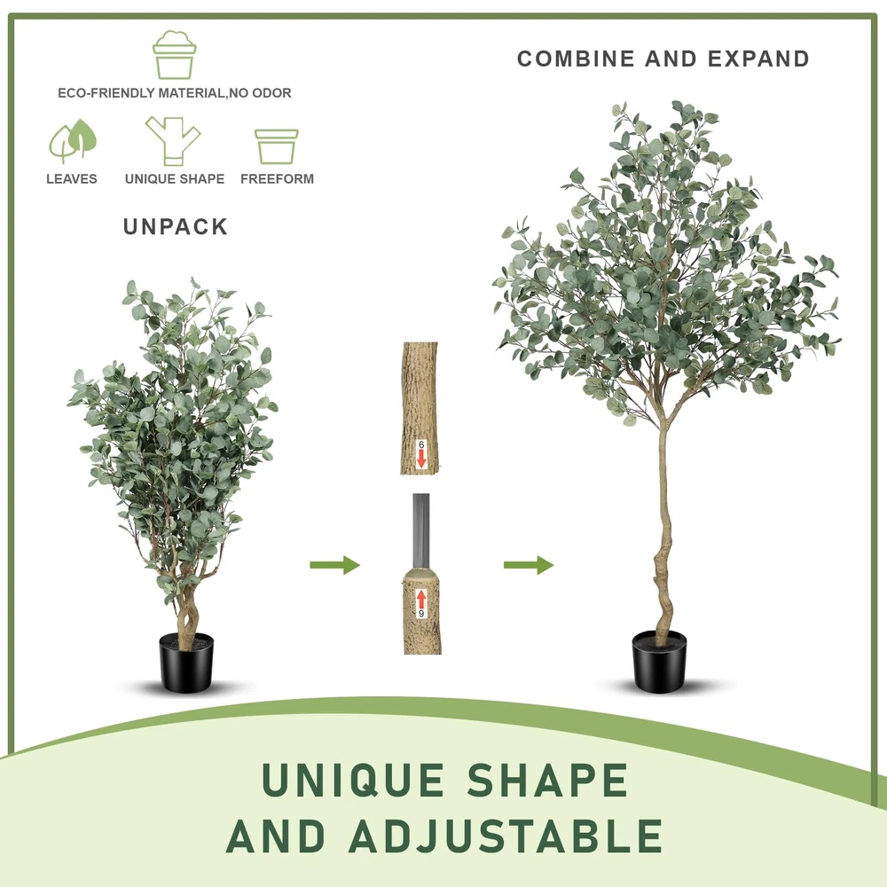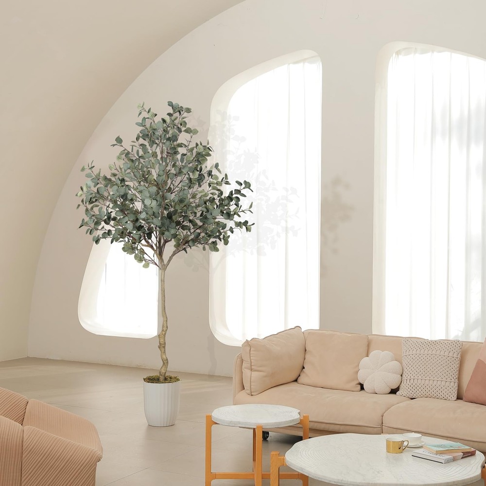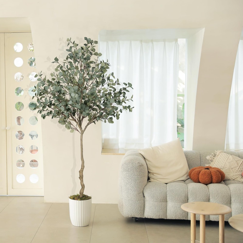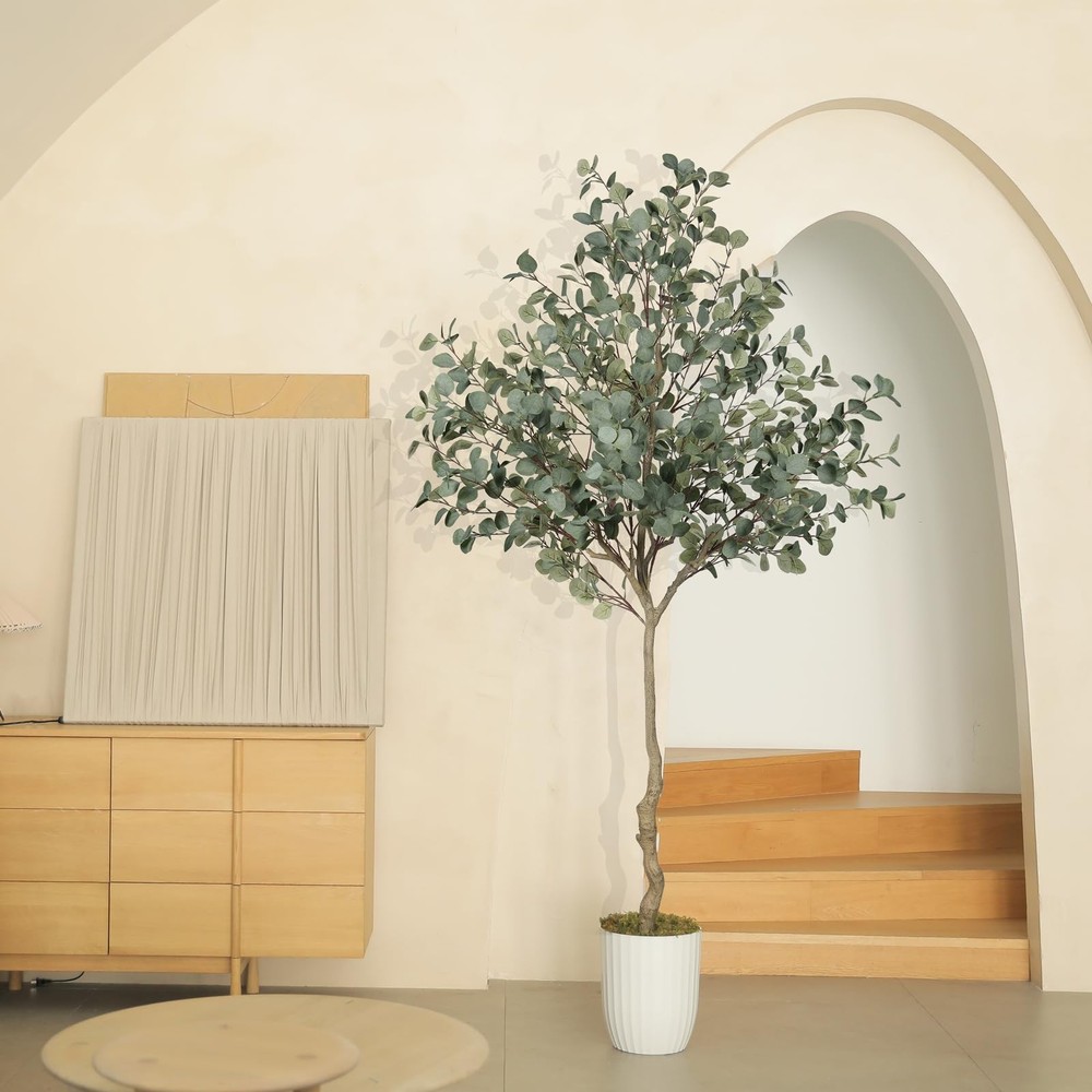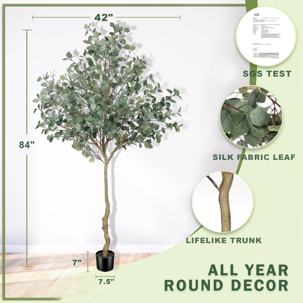 LYERSE 7ft Eucalyptus Tree Artificial. They are eternally deep green and full, leaves never fall, maintenance-free, no watering, no mosquito, simply wipe clean with a damp cloth or duster when it get dusty. It will create a natural atmosphere wherever you place it. For outdoors, we recommend to place it in a covered area to avoid direct sunlight. Notice: 1. When you receive the package, please open the package from bottom to top. 2. The trunks and the plastic nursery pot can not be separated. 3. The height of tree may have a little error due to your adjusting way. 4. During shipping, a few leaves may fall off, however, they can easily be placed back on. Nice corner decor plants. Greenery plant tree. 【Realistic and lush looking】Our lifelike faux eucalyptus tree will give your home a real boost. They never wilt and look fresh year after year. During the design process, we added more branches and leaves to make the overall appearance more natural and lush. It's a lovely faux corner plant decoration for office houses homes indoors & outdoors 【Free Maintenance】 Do you always forget to water your real plants? Try these 7ft eucalyptus trees artificial! You don't have to worry about watering or pruning, just wipe it with a damp cloth when the fake tree gets dusty, and it will stay spring-like and vibrant. You'll love the life it brings to your room without the extra maintenance of a live plant 【Sturdy and Adjustable】Our eucalyptus trees outfitted with sturdy inner metal wires, the branches and leaves themselves are adjustable. When you receive, artificial tree is divided into two sections. please align the arrows according to the stickers and splice them together, adjust and unfold the branches and leaves to create the ideal fake eucalyptus tree 【 Effortless Assembly 】This faux eucalyptus tree 7ft arrives with clear step-by-step instructions, allowing you to set it up effortlessly—no tools or complicated steps required. We suggest placing it in a bigger decorative planter to make the fake tree perfect. 【Perfect Dimension and Customer Service】This artificial eucalyptus tree overall tree is 7ft height. We suggest to placing it in bigger decorative planter to make the fake tree be more perfect.If you have any questions about tree installation or dimensions, please feel free to contact us. Your satisfaction is our top priority