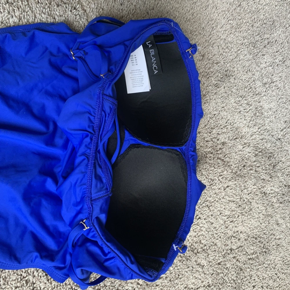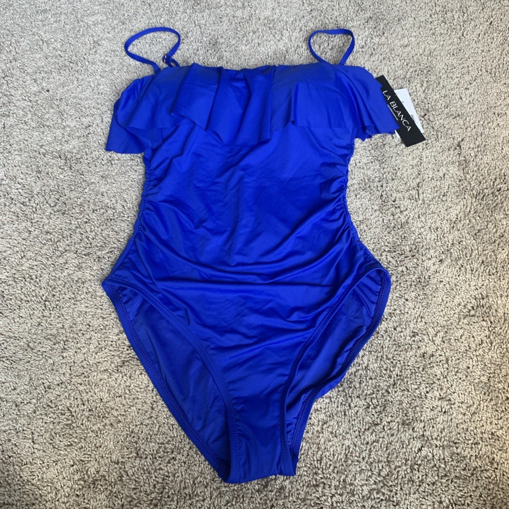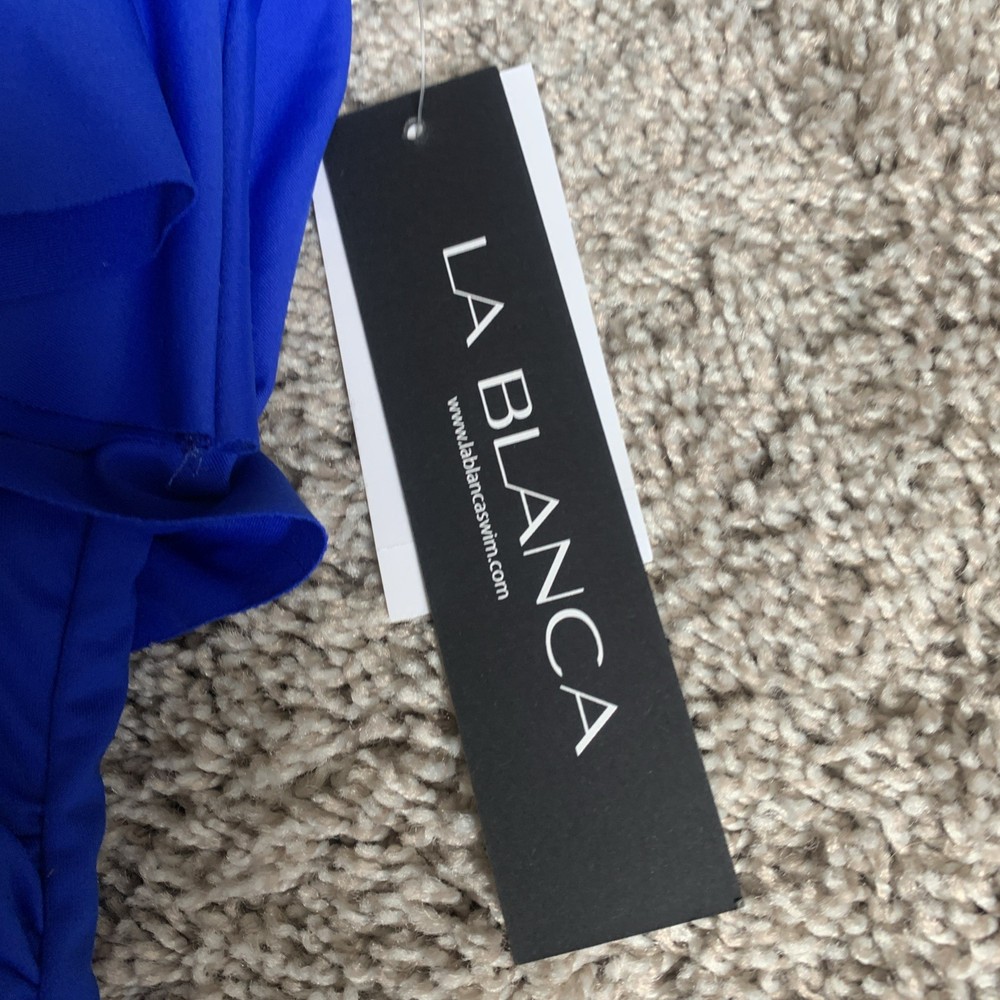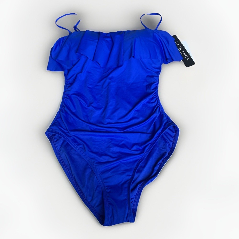 The La Blanca Island Goddess Ruffle Bandeau One Piece Swimsuit in Sapphire, size 6, is a stylish and sophisticated choice for women looking to make a statement at the beach or pool. This swimsuit features a bandeau style with ruffle accents, a flattering one-piece design, and a fun, vibrant blue color. The removable spaghetti straps add a touch of elegance, making it a chic and fashionable option for any water activities. B2
