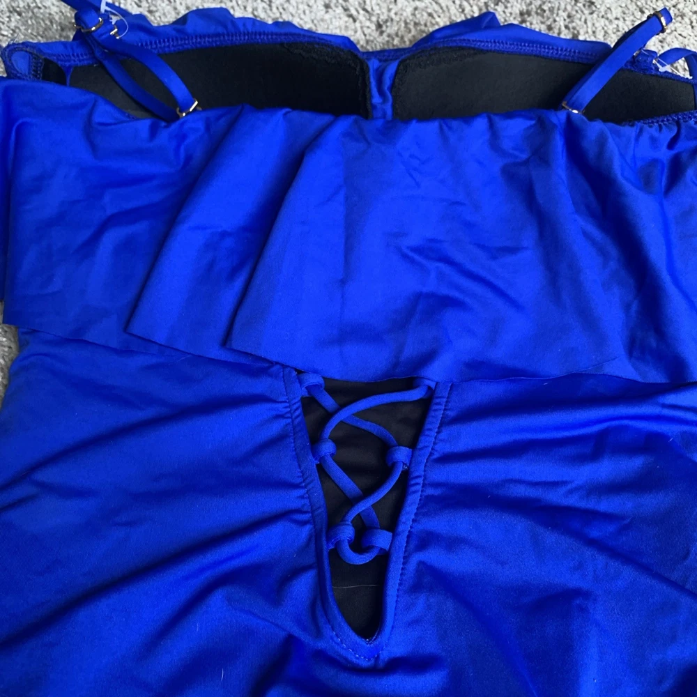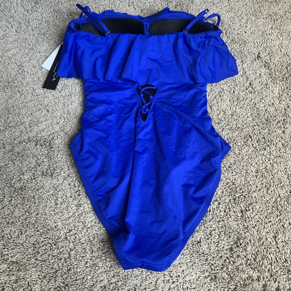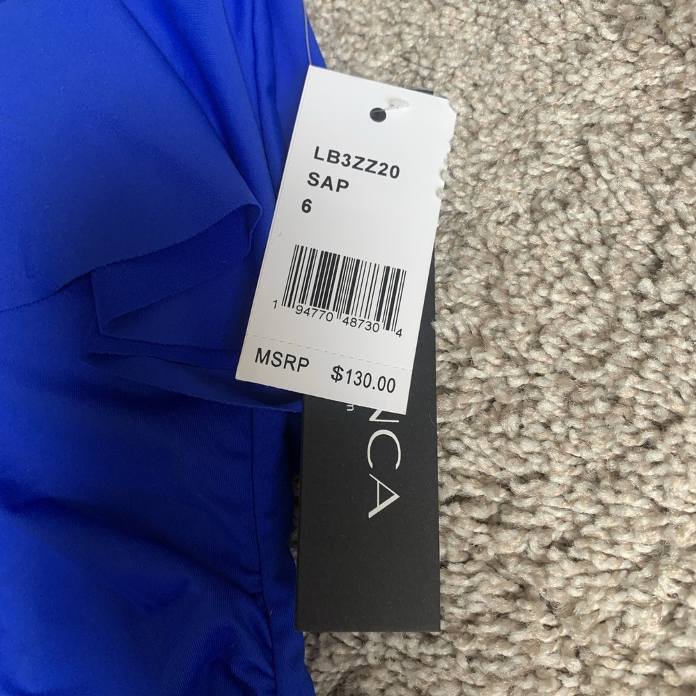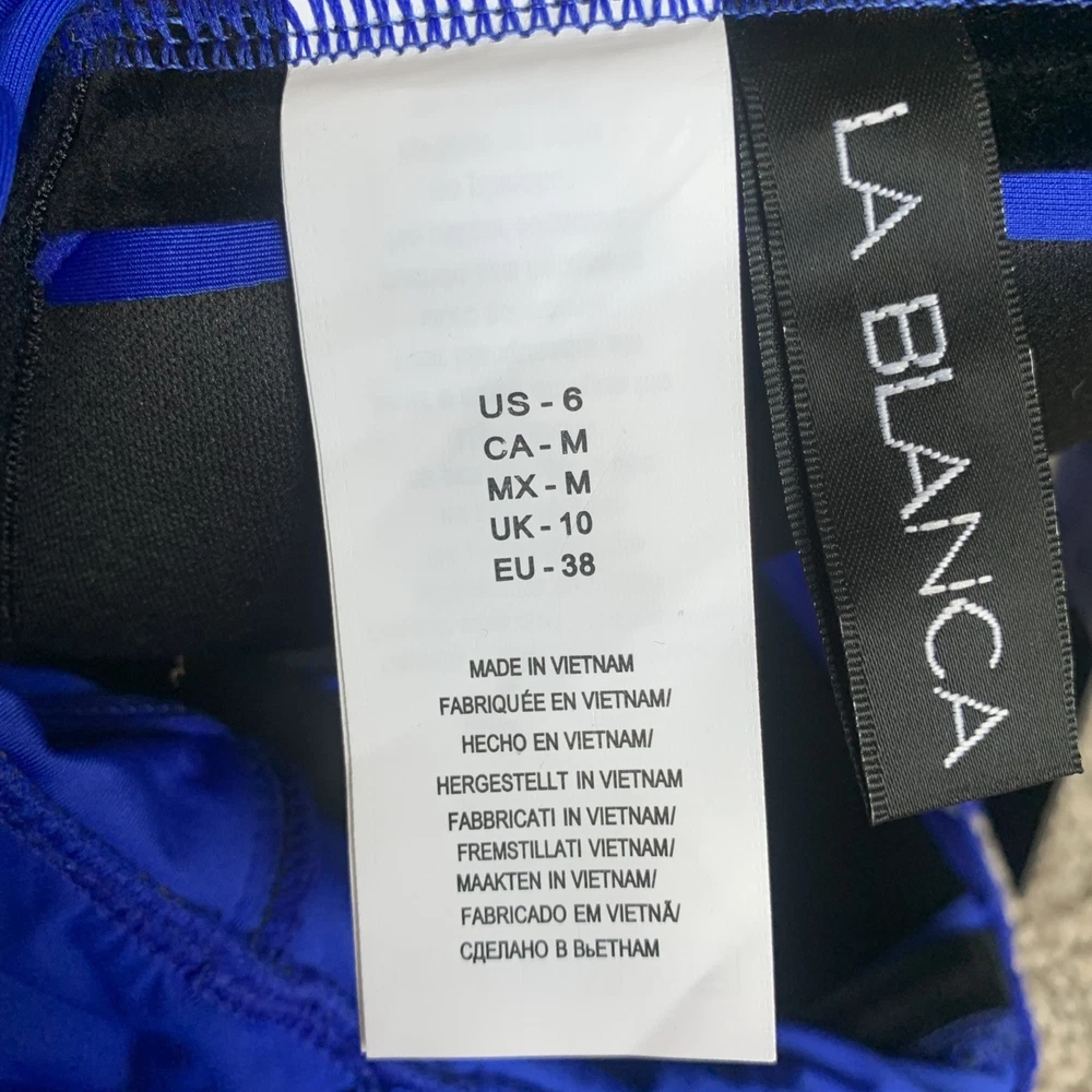 The La Blanca Island Goddess Ruffle Bandeau One Piece Swimsuit in Sapphire, size 6, is a stylish and sophisticated choice for women looking to make a statement at the beach or pool. This swimsuit features a bandeau style with ruffle accents, a flattering one-piece design, and a fun, vibrant blue color. The removable spaghetti straps add a touch of elegance, making it a chic and fashionable option for any water activities. B2