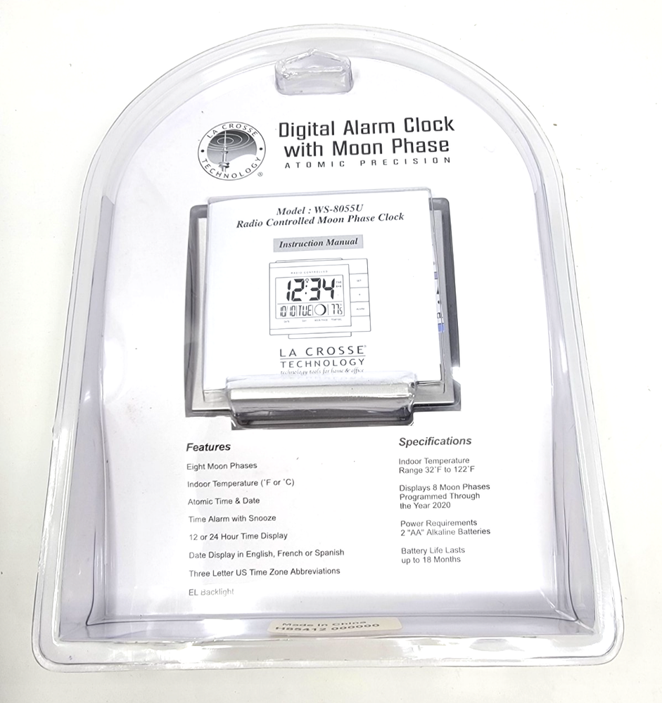 La Crosse Technology Alarm Clock Moon Phase Temp WS-8055U Atomic SEALED Condition is New. See pictures for condition. Fast Shipping. Shipped with USPS Ground Advantage or equivalent
