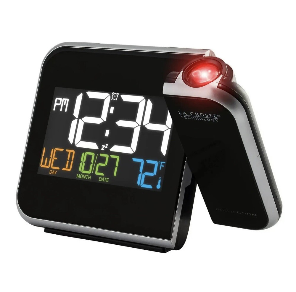 Enhance your bedside experience with the La Crosse Technology W85923 Color Projection Alarm Clock. This sleek device not only displays the time in vibrant colors but also projects it onto your ceiling or wall for easy viewing. Monitor indoor temperatures and stay informed with the integrated calendar feature.  Features: • Projects time onto wall or ceiling with adjustable focus and rotation • Displays indoor temperature in °F or °C • 12/24-hour time formats • Full calendar display: month, date, and weekday • Alarm with snooze function • Backlight with adjustable brightness • Compact design suitable for nightstands or desks     Dimensions: 5.91” L x 2.17” W x 4.33” H