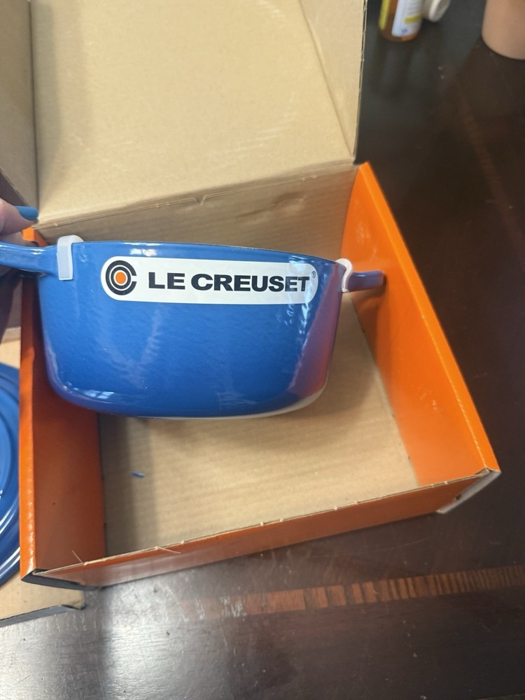 **NEW never used, in its original box**. The La Crueset 2.0 QT Cocette Dutch Oven in Marseilles (blue) is a high-quality kitchen essential that is perfect for cooking on any stove type - induction, electric, or gas. Made of durable cast iron with a ceramic surface coating, this Dutch oven offers excellent heat resistance up to 500°F. With a stylish round shape and a capacity of 2 quarts, it comes in a two-piece set that includes a lid, making it easy to use and clean. Backed by a lifetime warranty, this Dutch oven is a reliable and versatile option for home cooks looking for a reliable and long-lasting cookware piece.