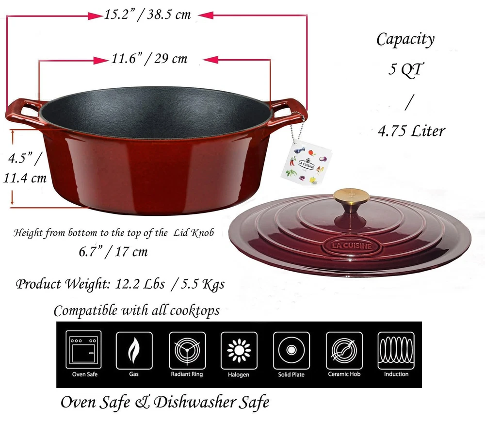 Our La Cuisine series is a range of classically, designed by the much lauded Marcus Notley, that is aesthetically beautiful, with gorgeous colors. Our Pro-Range (Interior Matte Black Enamel coating finish)is by using state of the art Japanese enamel glaze, that allows a patina to develop on the surface, with time it develops non-stick properties, the more it is used the better it gets. Our Cast Iron cookware is intrinsically safe and, even at high temperatures, doesn’t emit any dangerous toxins. It also retains its composition and shape under extreme conditions, unlike some softer materials. PATENTED SURE-GRIP, WIDE-ANGLE WEDGES PROFILE HANDLES for the most secure and comfortable grip possible. Golden-Plated #304 Stainless Steel Knob SUPER TOUGH INTERNAL COARSE MATT BLACK ENAMEL COATING FINISH: Scratch and stain resistant, it is also designed to withstand high temperatures, up to 500°F. The internal coarse matt black surface enhances grease absorption during cooking, allowing a patina to develop over time. As the patina builds, the cast iron Dutch oven naturally acquires non-stick properties—the more you use it, the better it performs. 3 LAYERS PORCELAIN ENAMEL COATING EXTERIOR: Extremely durable and resistant to colorization. Easy to clean and perfect for transferring directly from the kitchen to the table. MULTI-FUNCTIONAL: Ideal for searing meat, broiling, braising, sautéing, simmering on the hob, as well as baking and roasting. C𝐀𝐒𝐓 𝐈𝐑𝐎𝐍 𝐈𝐒 𝐅𝐔𝐍𝐃𝐀𝐌𝐄𝐍𝐓𝐀𝐋𝐋𝐘 𝐀𝐁𝐎𝐔𝐓 𝐒𝐎𝐋𝐈𝐃𝐈𝐓𝐘: Offers excellent heat retention, even heat distribution, and flavor enhancement. Absolutely perfect for dishes that require slow cooking. COMPATIBLE WITH ALL STOVETOPS Includes induction, ceramic, halogen, and gas.