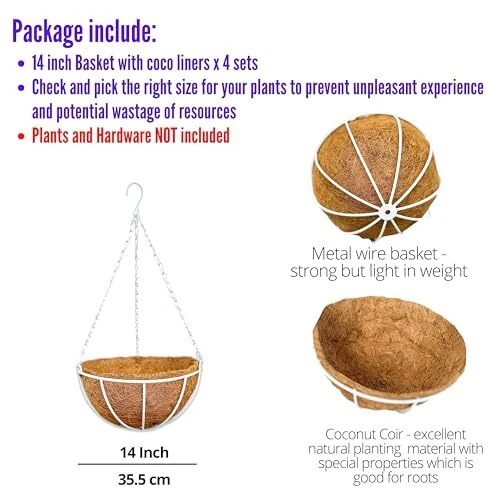 Return Policy Fast Delivery Trusted seller LaLaGreen Hanging Baskets Outdoor for Plants (4 Pack, 14 Inch) Large Hanging Planter with Coco Liner Round Flower Pots, White Metal Wire Plant Holder Hook Deck Porch Farmhouse Garden Balcony Decor Product Description 4-PACK SET: 14 inch, large size. Pick the right size for your plants to prevent unpleasant experience and potential wastage on resources. Flowers and Plants are NOT included. These outdoor hanging planter are ready to hang with coco liners, metal hanging chain and hook. Assembly not required STRONG AND LIGHTWEIGHT: This hanging plant pot is coated with PVC which prevents it from rusting and suitable for indoor & outdoor. It is sturdy and suitable to hold real live plants or artificial (fake or faux) plants for home decorations MATERIAL FROM COCONUT: This metal hanging planter is filled with coco coir liners, which is excellent planting material for plants as it holds a good deal of water, provides superior drainage and good air ventilation for the roots EXCELLENT DECORATIONS: With its rustic and natural style, these outdoor hanging baskets for plants can create a great indoor or outdoor decorations for living room, kitchen, patio, garden, balcony, deck, porch, farmhouse. It also can be used to create a modern and trendy minimalist theme home decoration or even for special venue like wedding SHOP WITH CONFIDENCE: We have the 30 days money back policy for this special hanging pots with coco coir liner . They are carefully inspected before shipped. Also, a pair of gardening gloves is included in this package. If t is any problem with the product or just a simple change of mind, you can always return these hanging pots for plants outdoor to us with a refund or exchange of a new set Shipping Returns Payment Shipping Shipping is FREE to all addresses other than APO/PO boxes in the lower 48 states. All our stock ships from US-based warehouses. Shipped via USPS or UPS (depending on location and package weight) Unless stated otherwise, all orders will ship within 24-72 hours of your payment being processed. Check our feedback to see the great reviews of FAST shipping we offer. Returns Seller does not accept returns Payment We currently accept payment via eBay managed payments only. Once payment is cleared, we will dispatch your shipment within 1-3 business days. Please refer to the "Shipping" tab for more information regarding shipping speed to your destination.