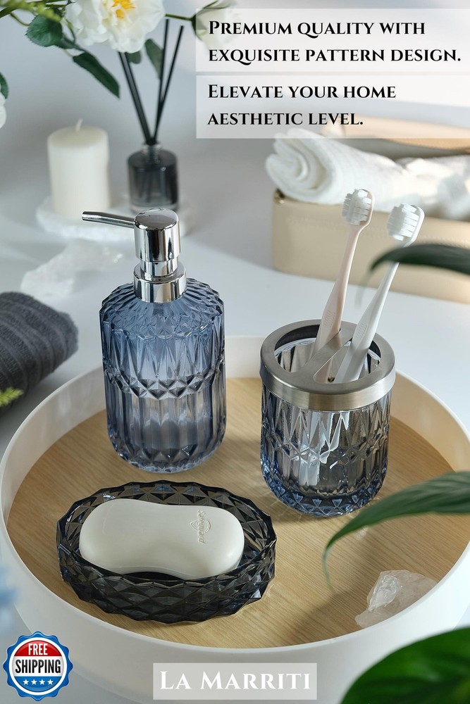 LaMarriti Blue Bathroom Accessories Set, 4Pcs Clear Glass Bathroom Accessories, Bathroom Hand Soap Dispenser Set, Soap Dish, Toothbrush Holder Set, Vanity Bathroom Decor, Gift Set Features 【Create a Coastal Oasis with Navy Blue & Brass Accents】Inspired by coastal design, this 5-piece bathroom set combines serene navy blue glass with brass-tone pumps, transforming your vanity into a beachside retreat. Perfect for modern, nautical, or master bathroom decor 【Maximize Vanity Storage & Organization】The bathroom cup set declutters bathroom essentials effortlessly. Use the toothbrush holder for razors or makeup brushes, the soap dish for jewelry, and the jar for cotton pads—ideal as a restroom organizer for small spaces 【Premium Quality】Crafted with 6mm-thick ocean-blue lead-free glass, these bathroom organizers resist cracks and daily wear—no chipping ceramic edges or yellowing plastic. The weighted base prevents tipping on cluttered vanity counters, while the brass-tone ABS withstands humid environments without rusting 【Easy to Clean】No more stubborn water spots or soap scum! The smooth glass surface repels toothpaste splatters and makeup stains – simply rinse with water or wipe with a damp cloth (no scrubbing needed!). Resists yellowing and grime, even in steamy bathrooms. Less cleaning time, more spa time 【Thoughtful Gift for Home Lovers】The soap and toothbrush holder set arrives in a gift-ready box, perfect for New Year gift, housewarmings, weddings, birthdays, Christmas, or any occasion. Blending practical storage with stylish decor, it’s a present they’ll use daily 【Notice】 1. The metal holder for the toothbrush holder is securely tucked into the top foam layer, rather than being lost. Please check the top layer of the foam for it. 2. The color of the glass may vary under different lighting conditions. The more abundant the light, the more translucent the glass will appear. Enjoy the unique beauty of your glass product under various lighting to fully appreciate its charm Shipping Free & Fast Shipping: We offer free shipping to most of the USA with a normal delivery time of 3-7 days. However, due to the current situation, additional delivery time (up to 3 weeks) may be required for some items. Alternative Carriers: We may use alternative carriers (e.g., USPS, FedEx, UPS) to ensure your package arrives safely and on time. Due to the use of multiple carriers, we are unable to provide a tracking number automatically. Handling Time: Orders are processed and shipped within 1-2 business days of receiving cleared payment. Shipping Restrictions: Shipping to Alaska, Hawaii, Puerto Rico, Guam, and other US territories may incur shipping charges or delivery restrictions. Please contact us before ordering, or your order can be refunded/cancelled. State Restrictions: Certain items may not be shipped to California due to state regulations. Contact for Tracking Updates: If you require tracking updates or have any concerns about the delivery of your order, please feel free to contact us, and we will be happy to assist you. Return Policy 30-Day Hassle-Free Returns: If you are not completely satisfied with your purchase, you can return the item for free within 30 days of receiving it for a full refund or exchange. Easy Return Process: Contact us, and we will provide you with a prepaid return shipping label and detailed instructions. No Restocking Fee: There are no restocking fees for returns. However, the buyer is responsible for return shipping costs if the return is not due to a seller"s error. Refund Processing: Refunds will be processed within 1 business day of receiving the returned item in its original condition. Feedback Your feedback is extremely important to us. We strive to provide the best products and customer service possible. If you are satisfied with your purchase, please take a moment to leave us a positive review. If you have any concerns or issues with your order, please contact us before leaving negative feedback. We are committed to resolving any problems and ensuring your satisfaction. Contact Us If you have any questions or concerns, please feel free to reach out to our customer support team. You can contact us through the eBay messaging system. We are available Monday to Friday, 9:00 am to 5:00 pm EST, and we will do our best to respond to your inquiry within 24 hours. Thank you for supporting our small family business!