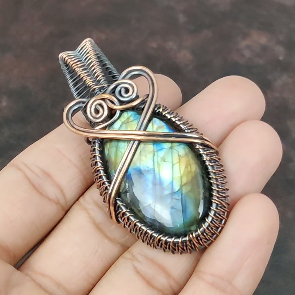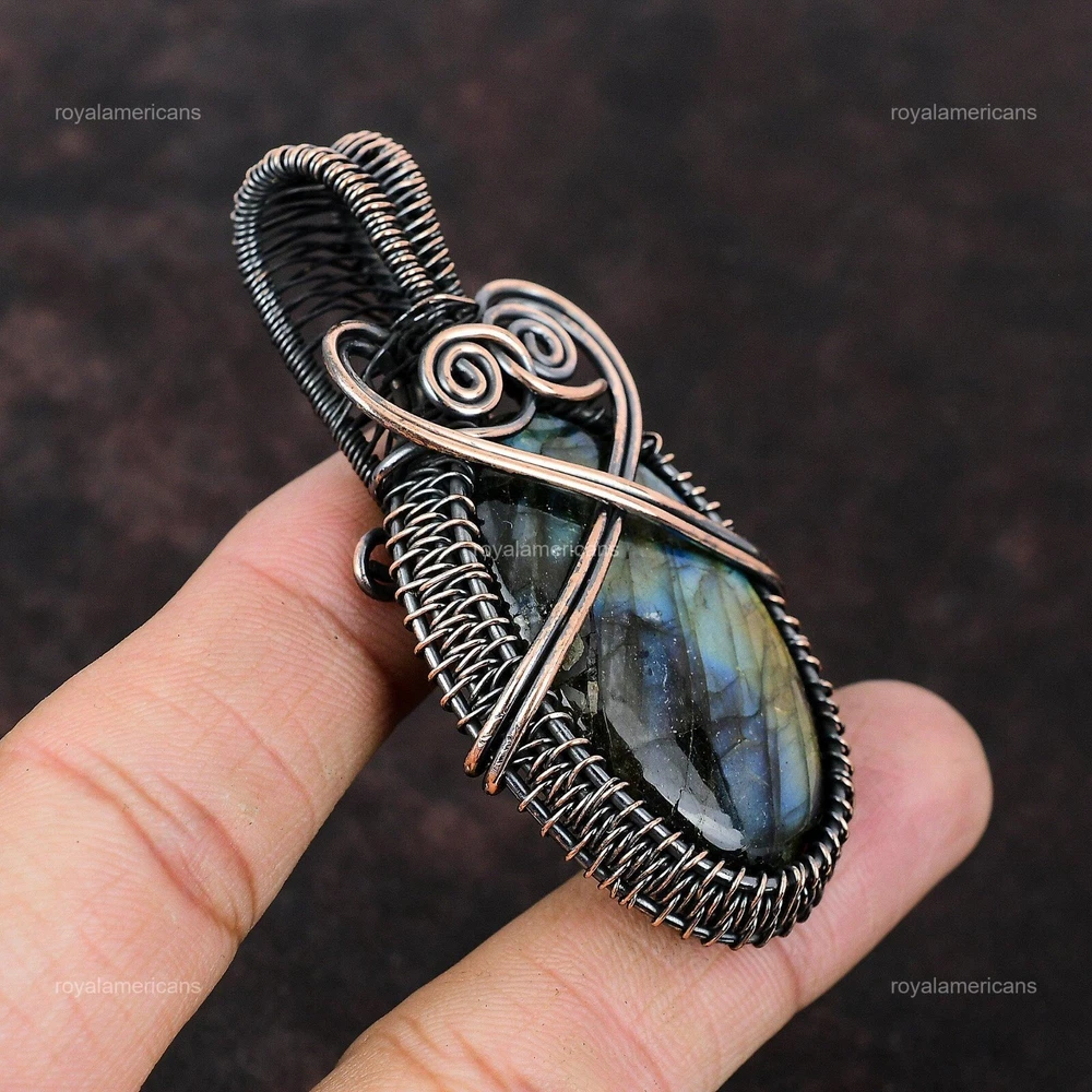 Note : Due to the natural formation of this gemstone. Slight variation in design and color are to be expected. Welcome to Royalamericans Mothers day Deal Labradorite Gemstone Wire Wrapped Sister Pendant Jewelry Copper Handmade Pendant, Wire Wrapped Pendant, Wire Wrapped Jewelry, Copper Pendant, Copper Wire Pendant, Wrapped Jewelry, Wire Wrap Pendant, Wire Wrap Jewelry SKU : UWP-545 Gemstone : Labradorite Stone Shape : Oval Metal Purity : Unknown Copper Length : Millimeters Width : Millimeters Copper has been used for jewelry making for thousands of years, dating back to ancient civilizations such as the Egyptians, Romans, and Aztecs. Copper was valued for its beauty, versatility, and durability, and was often used to make everything from jewelry and coins to cookware and tools. In addition to its historical significance, copper jewelry also offers several benefits. Copper is a natural conductor of heat and electricity, which makes it ideal for energy healing and therapeutic purposes. Wearing copper jewelry is believed to have various health benefits, such as improving circulation, reducing inflammation, and boosting the immune system. Some people also believe that copper jewelry has the ability to balance energy and improve mood. For Mother's Day Gift For Father's Day Gift For Promise For Valentine's Day For Halloween Party For Christmas Day Gift For New Year Party For Mom For Her If you can't find the information you need or need some advice for your design? Feel free to contact us. We are fast to reply :) All our work is made by hand with Love and Care in our workshop Thank you so much for visiting and hope you enjoy shopping with us Royalamericans is committed to delivering the best quality sterling silver jewelry to customers. As a handmade jewelry manufacturer, we offer an extensive selection of copper gemstone jewelry that showcases the brilliance of our craftsmanship. We are an experienced handmade jewelry supplier with expertise in embellishing gemstones to suit every style. We offer you the liberty to create your jewelry ensemble with sparkling, earthy, and pure gemstones. Our Talented artisans masterfully handcraft each piece of jewelry you see here. Our pieces are made with genuine gemstones.