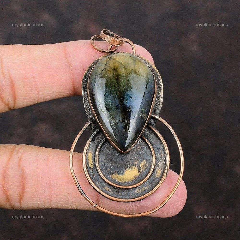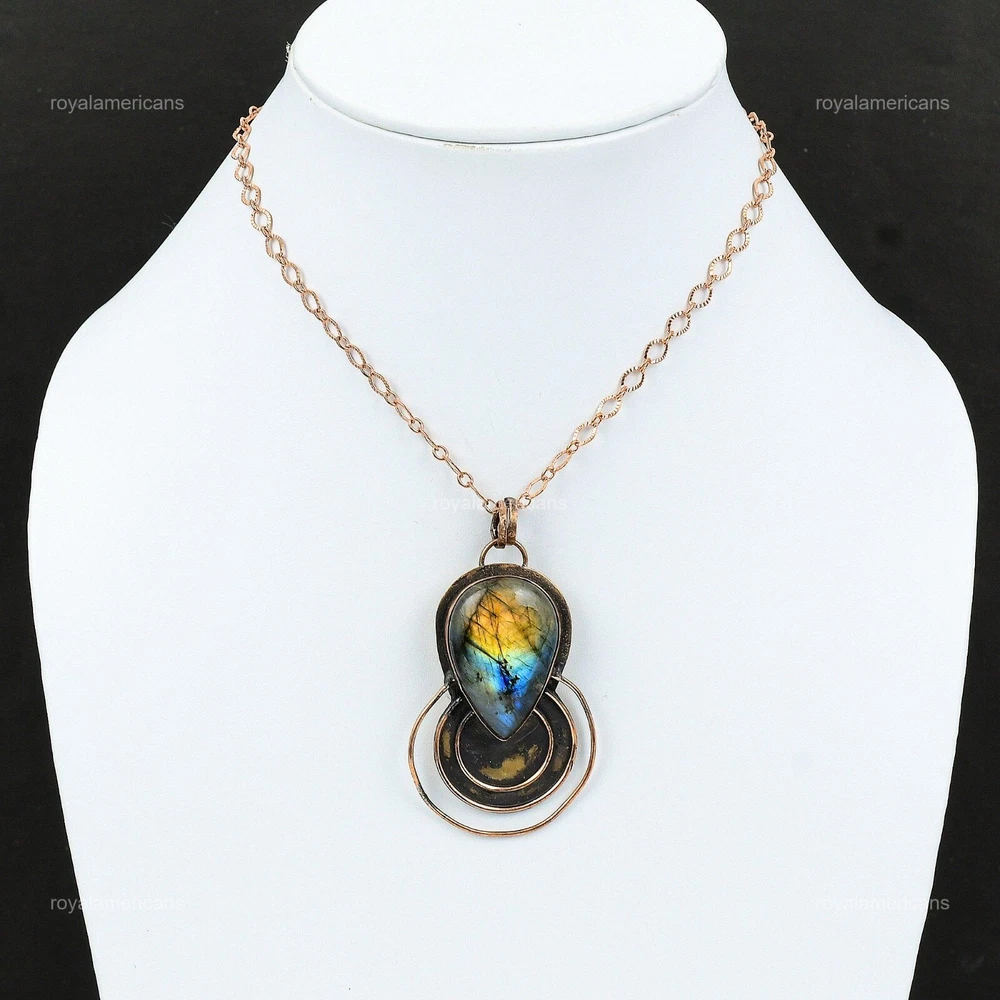 Note : Due to the natural formation of this gemstone. Slight variation in design and color are to be expected. Welcome to Royalamericans Mothers day Deal Labradorite Stone Copper Wife Handmade Art Deco Pendant Jewelry Handmade Pendant, Wire Wrapped Pendant, Wire Wrapped Jewelry, Copper Pendant, Copper Wire Pendant, Wrapped Jewelry, Wire Wrap Pendant, Wire Wrap Jewelry SKU : WP-913 Gemstone : Labradorite Stone Shape : Pear Metal Purity : Unknown Copper Length : 66 Millimeters Width : 39 Millimeters Copper has been used for jewelry making for thousands of years, dating back to ancient civilizations such as the Egyptians, Romans, and Aztecs. Copper was valued for its beauty, versatility, and durability, and was often used to make everything from jewelry and coins to cookware and tools. In addition to its historical significance, copper jewelry also offers several benefits. Copper is a natural conductor of heat and electricity, which makes it ideal for energy healing and therapeutic purposes. Wearing copper jewelry is believed to have various health benefits, such as improving circulation, reducing inflammation, and boosting the immune system. Some people also believe that copper jewelry has the ability to balance energy and improve mood. For Mother's Day Gift For Father's Day Gift For Promise For Valentine's Day For Halloween Party For Christmas Day Gift For New Year Party For Mom For Her If you can't find the information you need or need some advice for your design? Feel free to contact us. We are fast to reply :) All our work is made by hand with Love and Care in our workshop Thank you so much for visiting and hope you enjoy shopping with us Royalamericans is committed to delivering the best quality sterling silver jewelry to customers. As a handmade jewelry manufacturer, we offer an extensive selection of copper gemstone jewelry that showcases the brilliance of our craftsmanship. We are an experienced handmade jewelry supplier with expertise in embellishing gemstones to suit every style. We offer you the liberty to create your jewelry ensemble with sparkling, earthy, and pure gemstones. Our Talented artisans masterfully handcraft each piece of jewelry you see here. Our pieces are made with genuine gemstones.