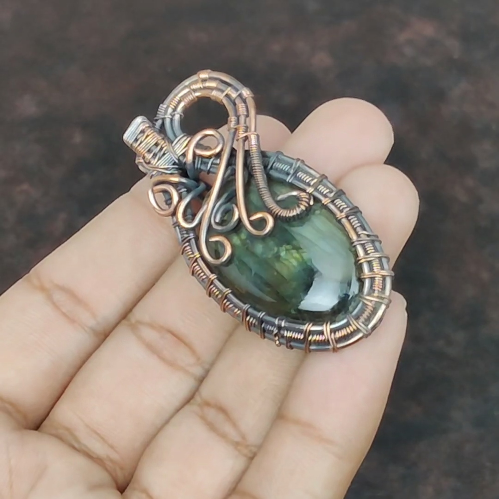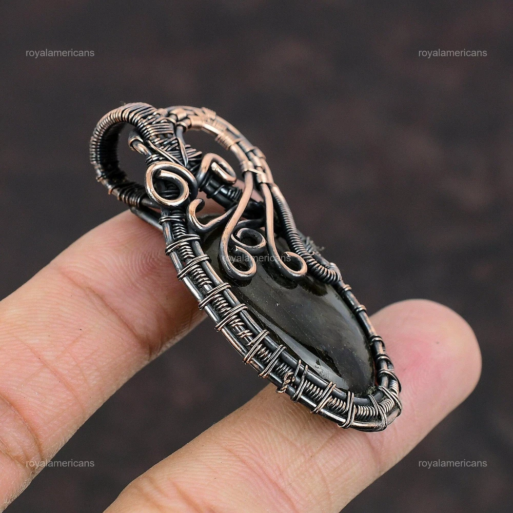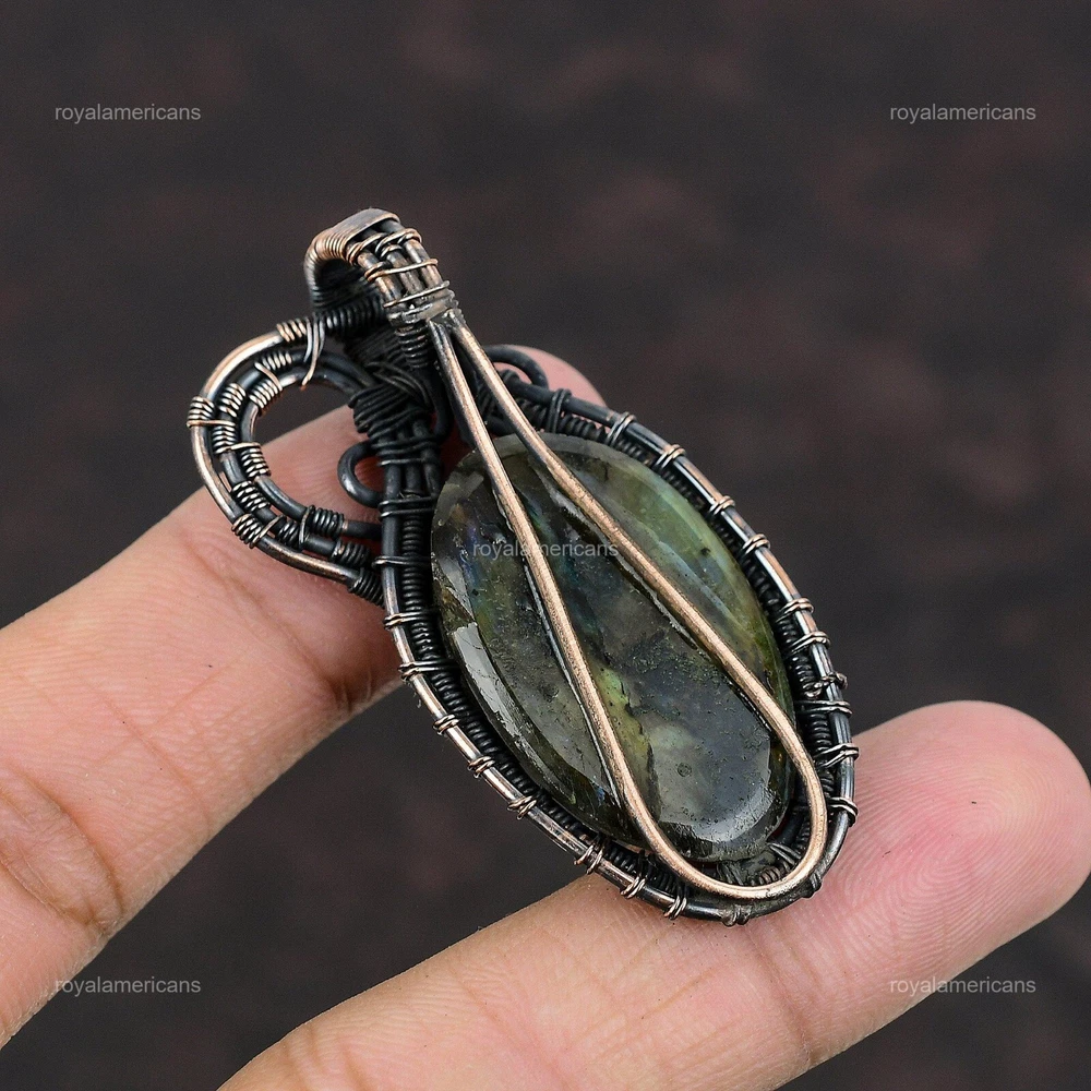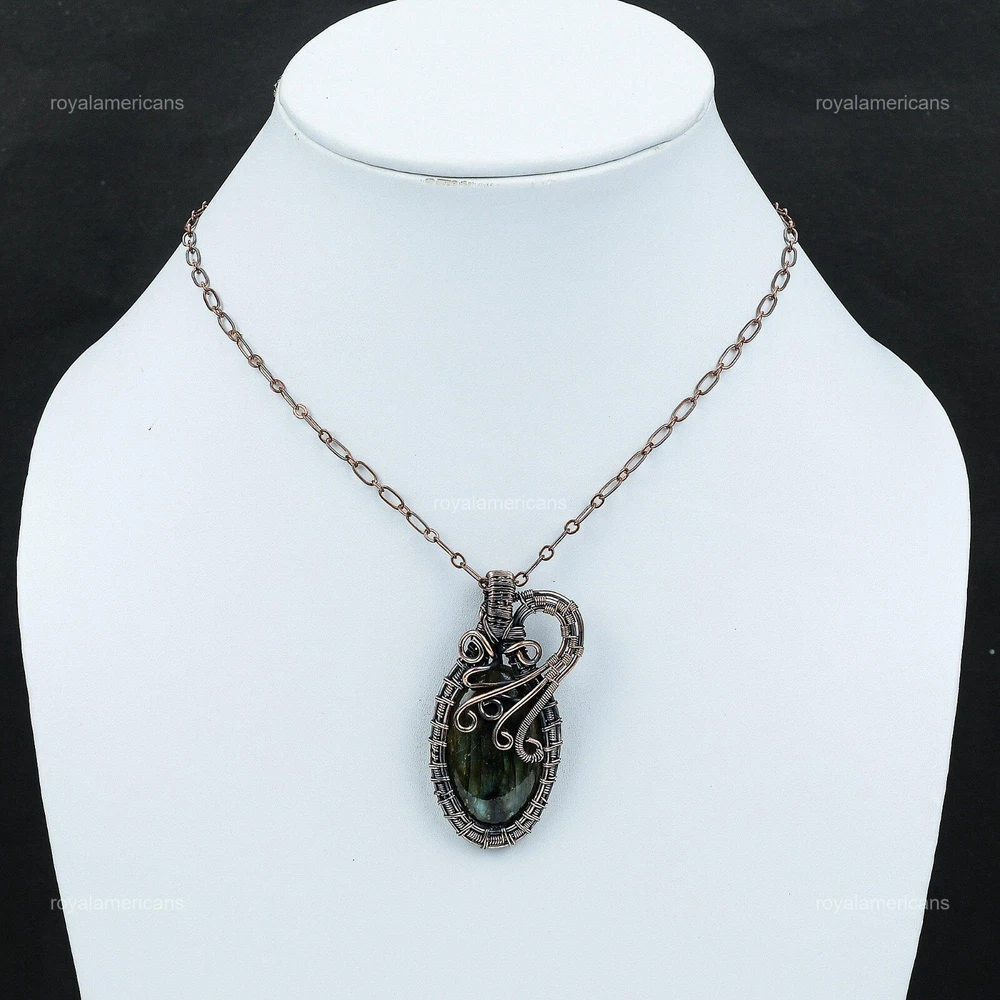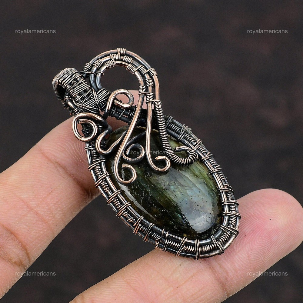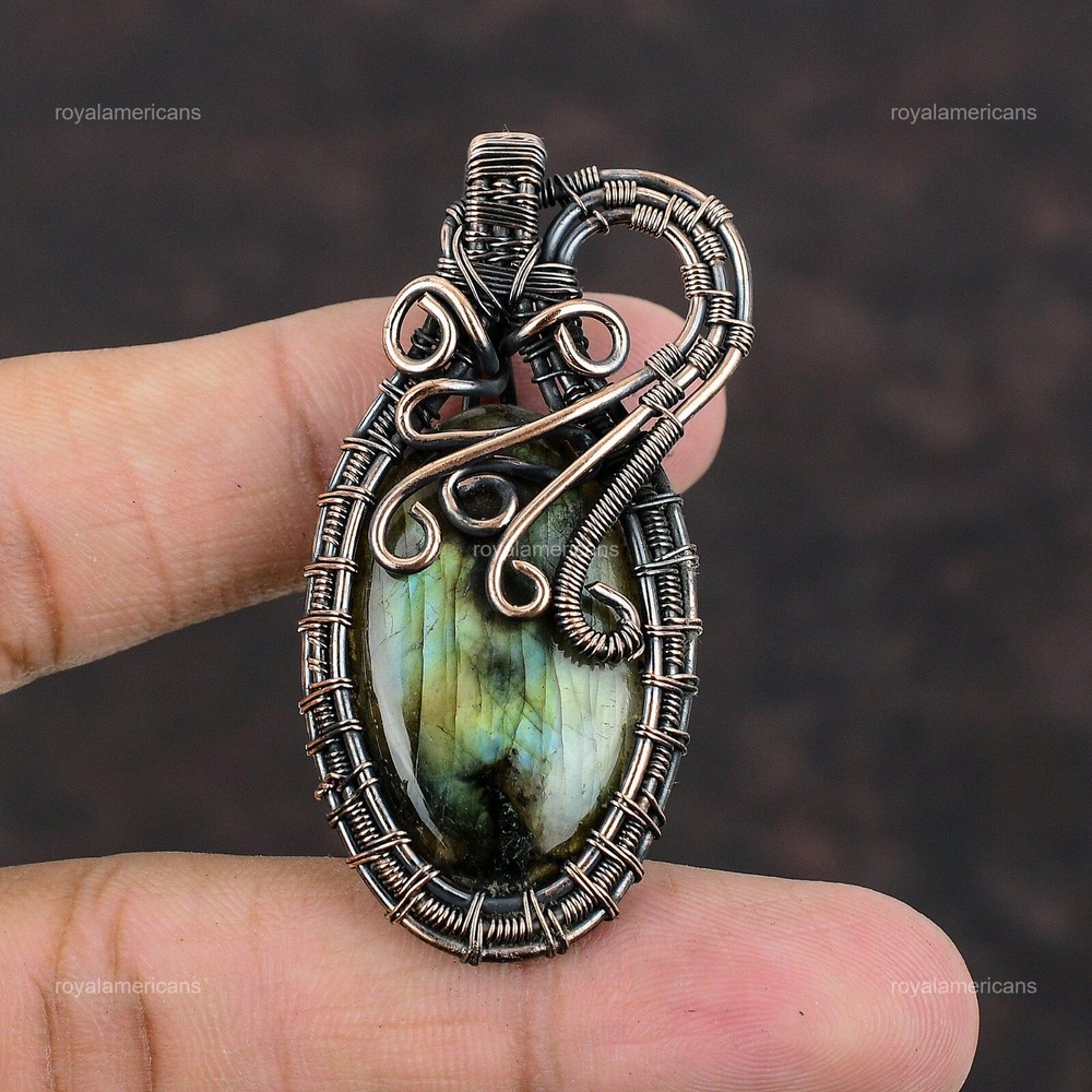 Note : Due to the natural formation of this gemstone. Slight variation in design and color are to be expected. Welcome to Royalamericans Mothers day Sale Oval Labradorite Stone Wife Artisan Engagement Pendant Copper Handmade Pendant, Wire Wrapped Pendant, Wire Wrapped Jewelry, Copper Pendant, Copper Wire Pendant, Wrapped Jewelry, Wire Wrap Pendant, Wire Wrap Jewelry SKU : UFWP-318 Gemstone : Labradorite Stone Shape : Oval Metal Purity : Unknown Copper Length : 59 Millimeters Width : 28 Millimeters Copper has been used for jewelry making for thousands of years, dating back to ancient civilizations such as the Egyptians, Romans, and Aztecs. Copper was valued for its beauty, versatility, and durability, and was often used to make everything from jewelry and coins to cookware and tools. In addition to its historical significance, copper jewelry also offers several benefits. Copper is a natural conductor of heat and electricity, which makes it ideal for energy healing and therapeutic purposes. Wearing copper jewelry is believed to have various health benefits, such as improving circulation, reducing inflammation, and boosting the immune system. Some people also believe that copper jewelry has the ability to balance energy and improve mood. For Mother's Day Gift For Father's Day Gift For Promise For Valentine's Day For Halloween Party For Christmas Day Gift For New Year Party For Mom For Her If you can't find the information you need or need some advice for your design? Feel free to contact us. We are fast to reply :) All our work is made by hand with Love and Care in our workshop Thank you so much for visiting and hope you enjoy shopping with us Royalamericans is committed to delivering the best quality sterling silver jewelry to customers. As a handmade jewelry manufacturer, we offer an extensive selection of copper gemstone jewelry that showcases the brilliance of our craftsmanship. We are an experienced handmade jewelry supplier with expertise in embellishing gemstones to suit every style. We offer you the liberty to create your jewelry ensemble with sparkling, earthy, and pure gemstones. Our Talented artisans masterfully handcraft each piece of jewelry you see here. Our pieces are made with genuine gemstones.