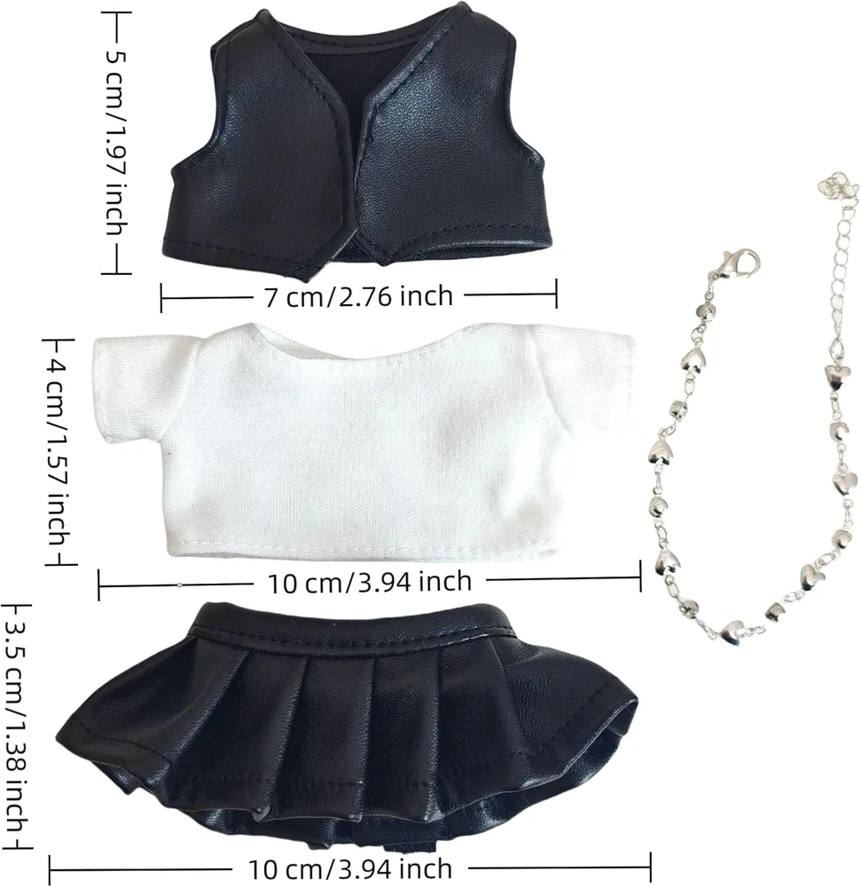 Product Description 8-Piece Skirt Outfit Set for 17cm(6.7 Inch) and All Generation Dolls - Hat, T-Shirt, Leather Jacket, Shoes, Mini Skirt & Silver Necklace (Doll Clothes & Accessories) Fashion-Forward Combo – Rocker-chic outfit set includes: basic white tee, cropped leather jacket, A-line mini skirt, and layered heart pendant necklace. Universal Compatibility – Fits 1st/2nd/3rd Gen and 17cm Doll figures perfectly. Smooth zippers & elastic waistbands ensure hassle-free outfit changes. Detail-Oriented Design – Realistic stitching on jacket, wrinkle-resistant skirt, and secure necklace clasp for long-lasting use. Versatile Styling Options – Pair pieces separately or together for concerts, daily wear, or themed doll dioramas. Safe & Non-Damaging – All materials tested to prevent color bleeding or surface scratches on dolls.