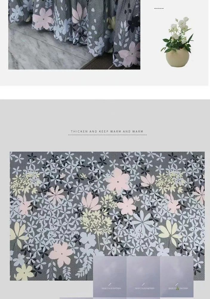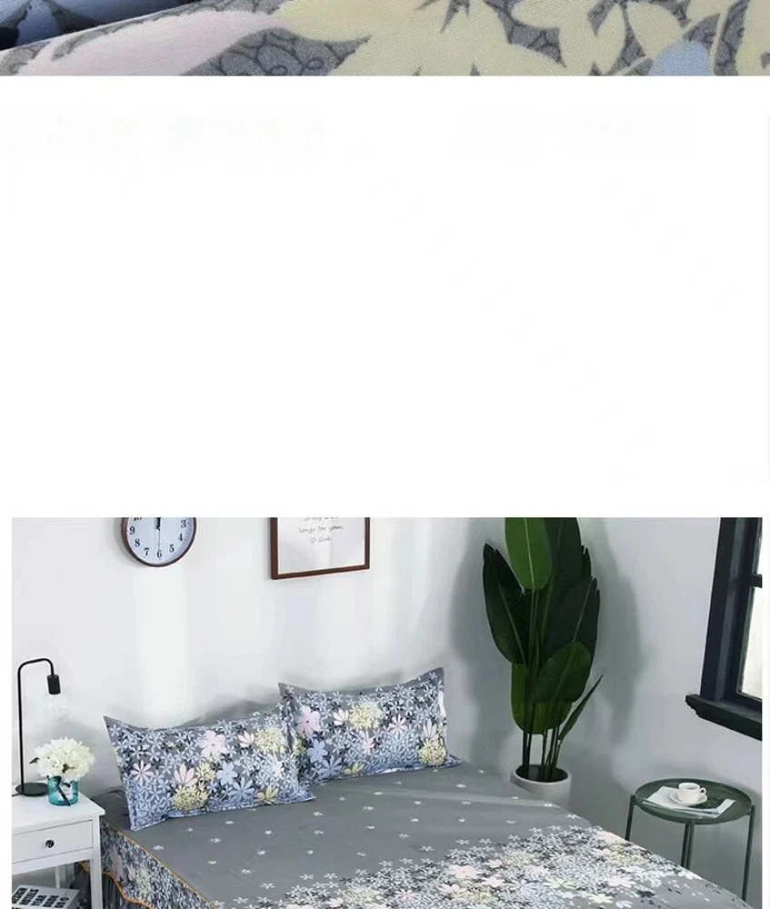 MULTIPLE SIZES(Width x Length ) 120x200cm / 47x79 inch (Full/Double Size) 150x200cm / 59x79 inc 160x200x30cm / 63x79x12 inch 180x200cm / 71x79 inch 180x220cm / 71x87inch 200x220cm / 79x87inch Pillowcase Free Send Thickened brushed bed skirt Fashionable and bright, high quality bed skirt Life is not compromised, only the original design and careful selection of materials are worthy of your home Skin-friendly soft, care for the skin, moisture absorption and breathable, natural health, no shrinkage, not breathable Selected high-quality brushed fabric, soft and comfortable to fit the skin, breathability and moisture absorption, comfortable throughout the night From this moment, have a different kind of sleep Raised bed skirt design, skirt height of about 40cm, soft and comfortable, soft touch Eco-friendly printing and dyeing Not easy to fade, not easy to pilling, high color fastness, no color loss, no formaldehyde Product Information Washable and durable, soft and breathable, green Raised bed skirt design, beautiful and generous, warm and romantic Active printing and dyeing process, fashionable and bright colors, safe and healthy With a wide edge pillowcase, exquisite and beautiful, strong and durable, as new for a long time With non-slip elastic band, firmly fixed mattress, peace of mind sleep Lace Trim Trilateral,Heightening,Bed Skirt Pillowcase Three-piece Set,Anti-slipn Mattress Cover,Soft Comfortable,Cotto Double