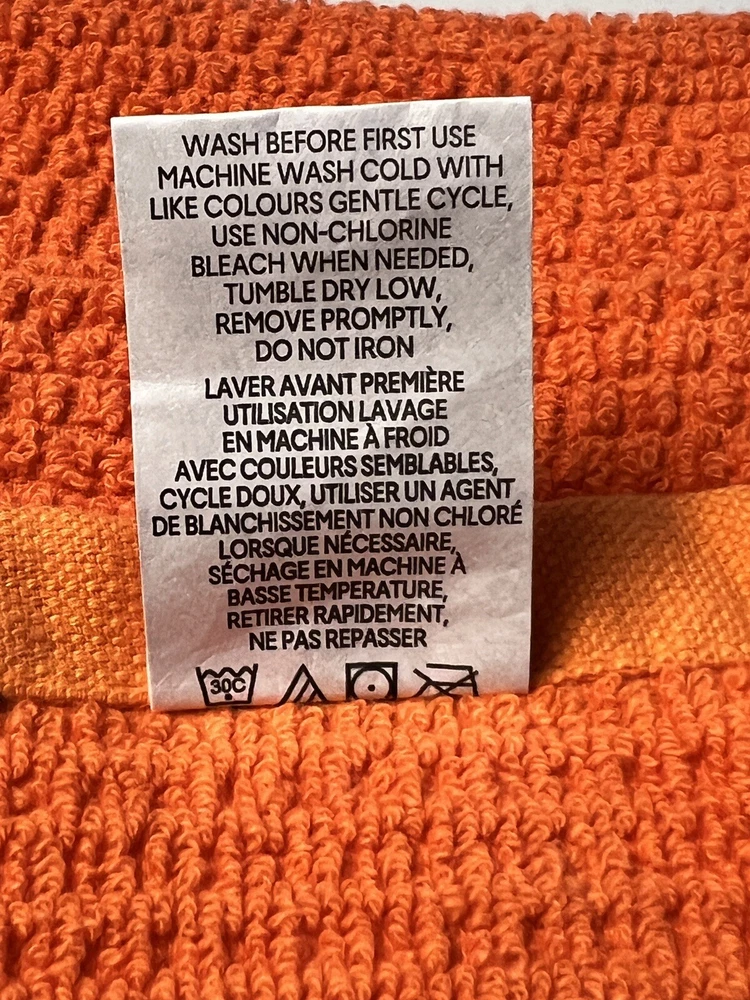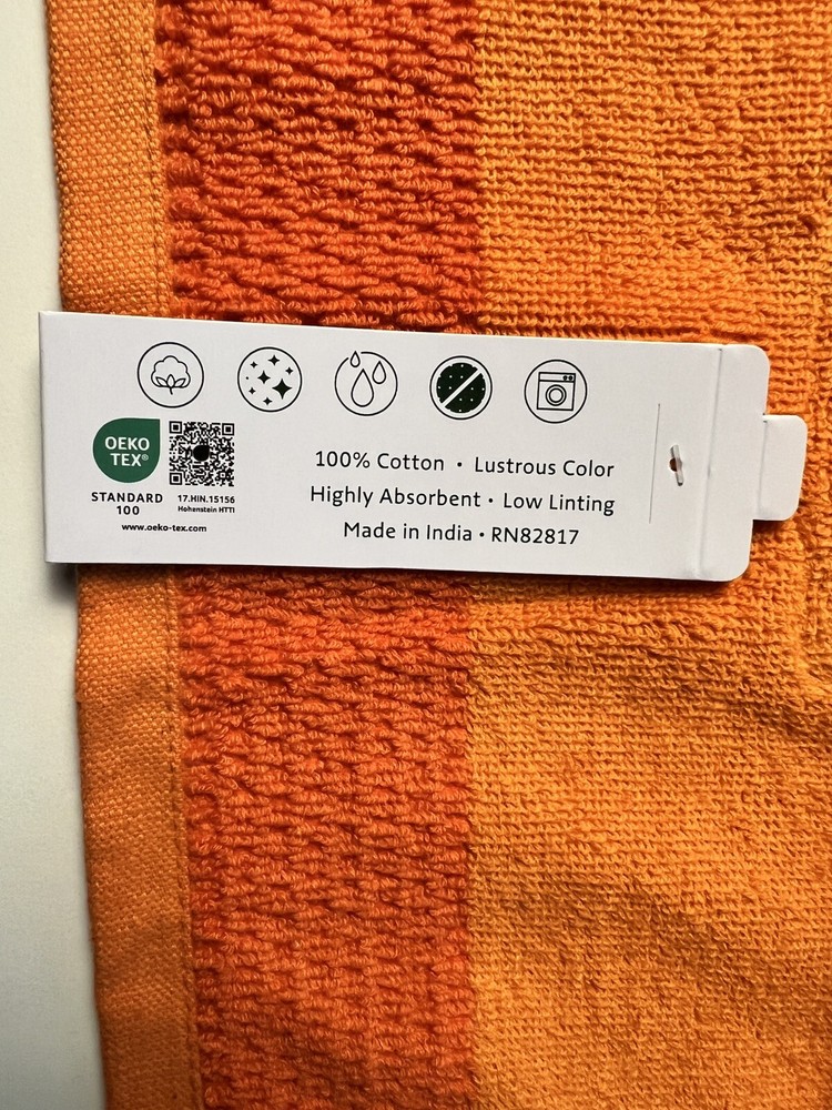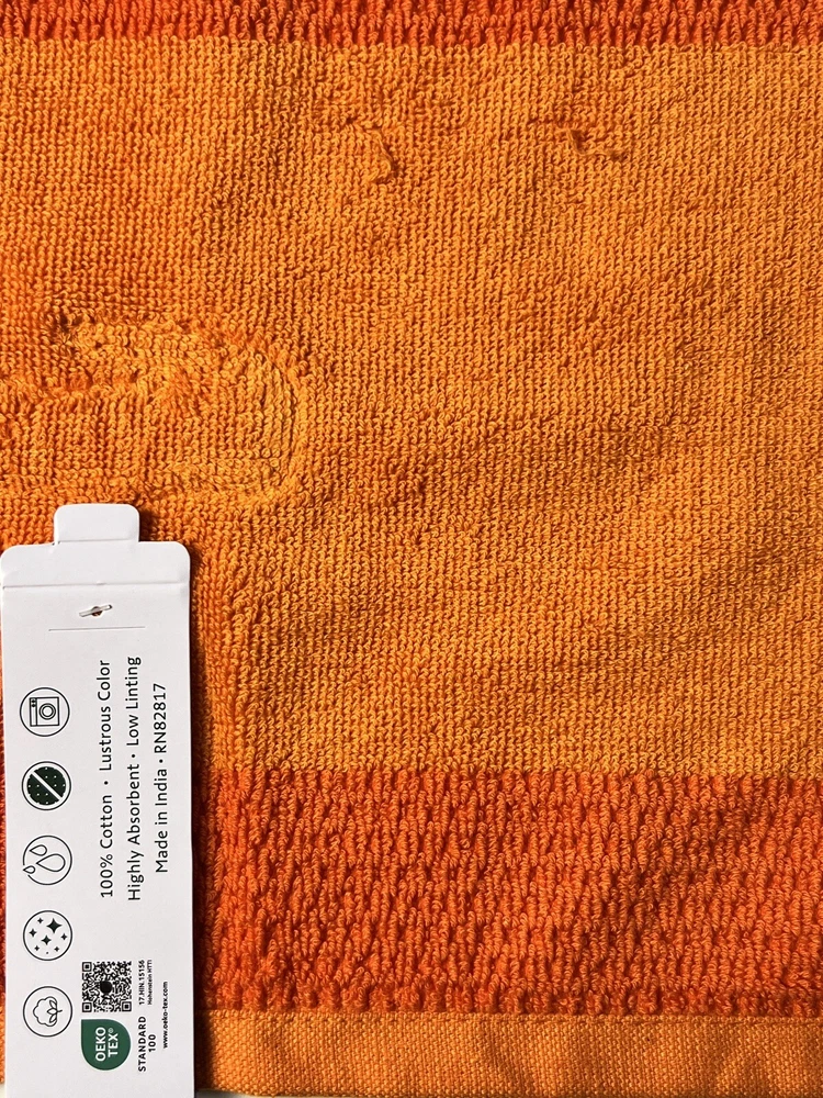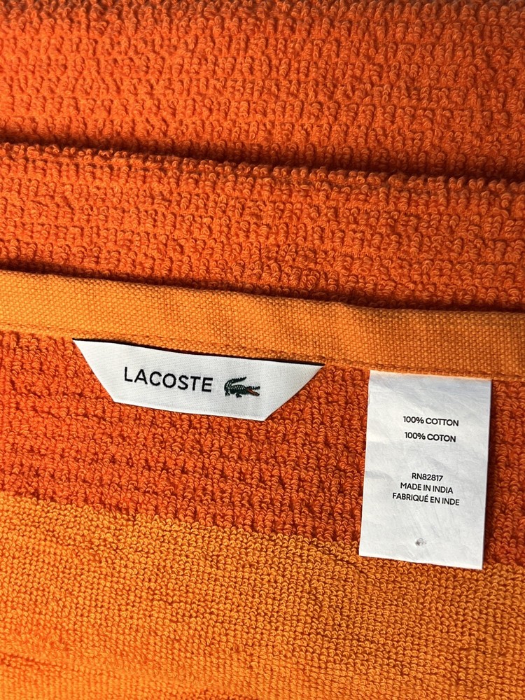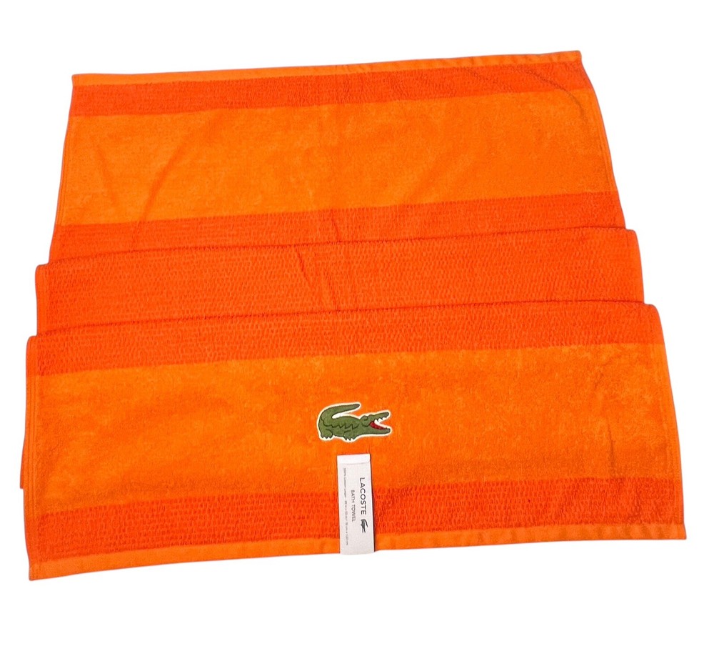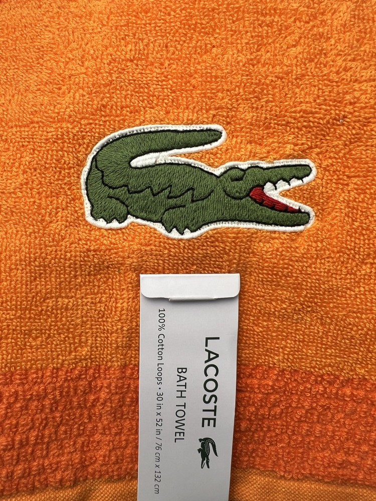 This Lacoste bath towel features a striped pattern with an embroidered Big Crocodile logo in orange. Made of soft 100% cotton, it is a 30" x 52" rectangle, ideal for adults. The set includes one bath towel, suitable for the bathroom. Made in India. There are a couple of pulls shown in the last photo.