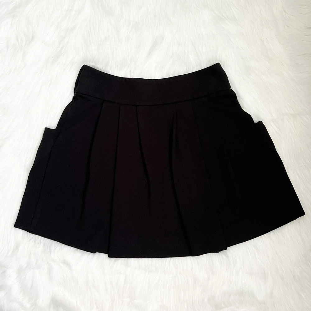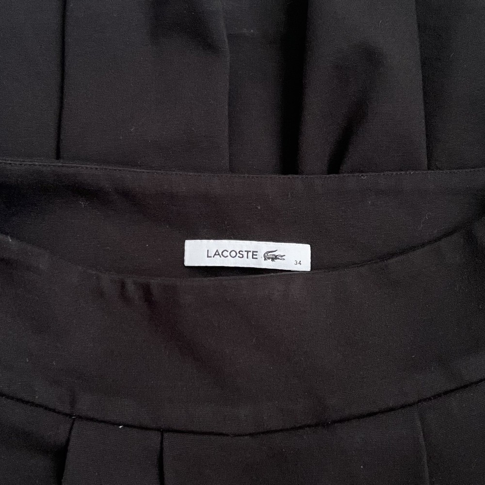 Lacoste Black Pleated Mini Skirt with Side Buttons Detail & Deep Pockets Size 34 71% Viscose 23% Nylon 6% Elastane Side Zipper #miniskirt #lacoste #preppy #chic #skirt Approximate Measurements (straight across): Waist 13.5” Length 16.5” 14.9 pleated skirt, side button detail, high-waist, black mini, chic fashion, preppy style, deep pockets, zipper closure, viscose blend