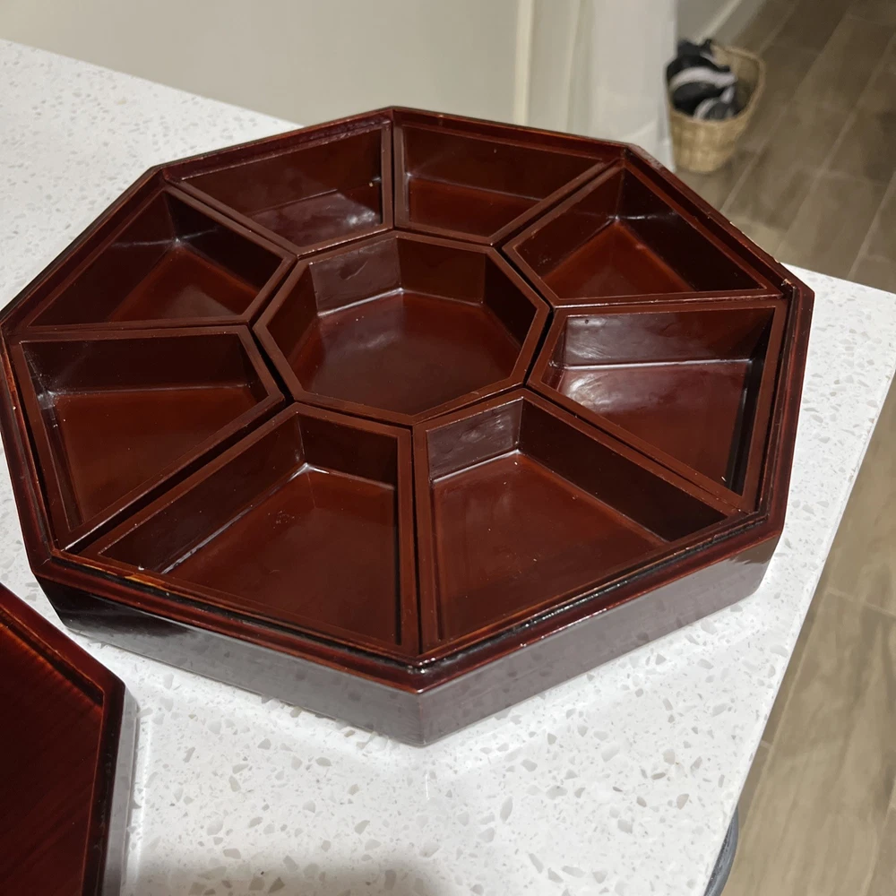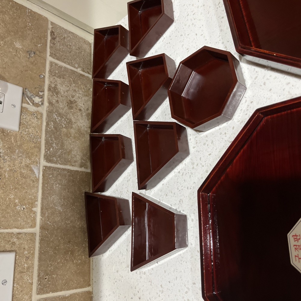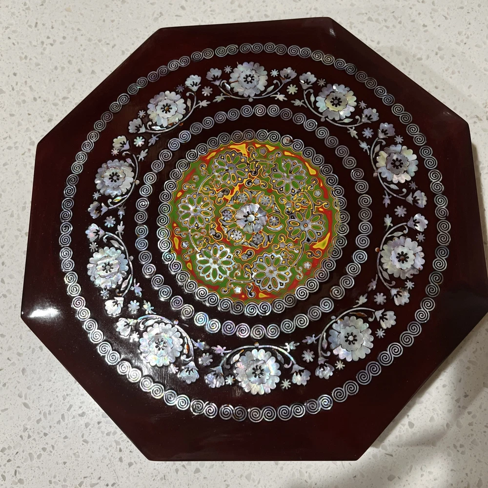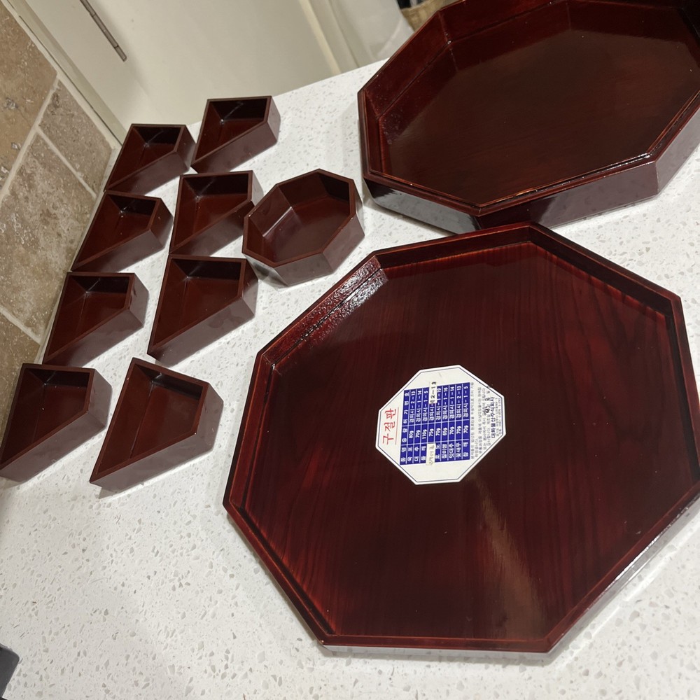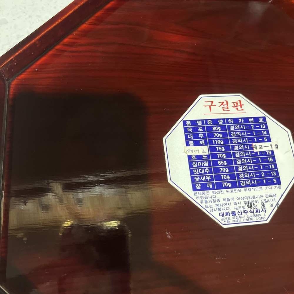 This image appears to be a label for a product called "Gujeolpan." It lists the ingredients in Korean, their weights and permit numbers. The label also includes the company information, including their address and phone number. It’s a very very beautiful piece. I’d see no damage just a little scrape on the side and it’s in the pictures. Also, I’ve known that they can use them for jewelry box. It’s a great present for for an anniversary or wedding present and measurements is 12 x 12  it is not a small piece again it’s a beautiful piece. I can’t say more whoever buys it. They’re gonna be very happy with this purchase ENJOY!