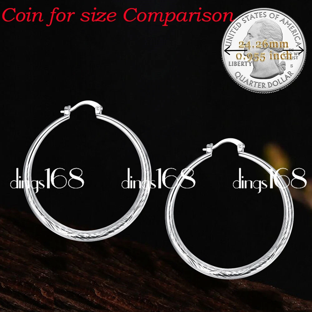 Product Description: Made with love and attention to every detail from shiny 925 Sterling Silver. These elegant hoops are properly stamped "925" for authenticity. It can be easily matched with everyday wear. Each earrings is 38mm/1.5 inch wide and weighs 3.3 gram. The earrings are Hypoallergenic and tarnish-resistant. It does not flake off, lose luster or discolor. *** Free gift box included. Metal 925 Sterling Silver Product Dimension Diameter (including clasp): 45 mm*38 mm (1.75*1.5 inch) Diameter (including clasp): 38 mm*38 mm (1.5*1.5 inch) Thickness: 3mm (0.12 inch) *** Please always refer to the description for the measurement of the product. Please do not judge the size based on the picture on your screen. The product may look larger or smaller based on your screen size. Weight 6.6 gram Main Color Silver Product SKU E19 Shipping Policy (U.S, APO, FPO, Puerto Rico, Virgin Islands) All products will be shipped from our warehouse in Morgan Hill, California, USA For USA buyers, we will ship your order by USPS (Postal Office) First Class Mail or Priority Mail (Please make your choice when you make payment). We ship within one working day once payment received. Payments received before 1:00PM will be shipped on the same day. We ship to all address, including physical address, P.O. Box address, Puerto Rico, Virgin Islands, Guam, APO, FPO etc. International Buyers We ship worldwide. Flat Rate shipping to all countries regardless of quantity. For packages of such small size, most countries usually do not charge importing tax. However, in case there is any in importing tax, Please Note: Import duties, taxes, and charges are not included in the item price or shipping cost. These charges are the buyer's responsibility. Please check with your country's customs office to determine what these additional costs will be prior to bidding or buying. Customs fees are normally charged by the shipping company or collected when you pick the item up. These fees are not additional shipping charges. We can not guarantee the exact delivery date for international orders. Customer Service & Return Policy We care about our valued buyers, if you have any questions, our Customer Service staffs will be very glad to help you. We try our best to reply to your emails as soon as possible, however, due to high volume of daily incoming emails and time zone difference, we may not be able to reply your emails immediately. You satisfaction is always our No. 1 concern. Our success is 100% based on your satisfaction and continuous support. No matter for whatever reason, if you are not 100% satisfied, you may always return the product for refund or exchange. Please e-mail us with a brief reason before returning a package. Feedback and Detailed Seller Ratings Dear buyers, we appreciate your business, if you are satisfied with our product and service, please leave us a positive feedback. Your recognition will make us more confident to develop business and serve you better. Our goal is to make sure you are a happy buyer and pleasant shopping with us. Please email us before leaving any 1 or 2 ratings, negative feedback or open any dispute. We understand the concerns and frustrations you might have, and will do our endeavor to resolve the issues. Please give us the opportunity to resolve any problem. For international buyers, when you rate the shipping time part please take international transit into consideration. Click Here for this week's Special Offers!
