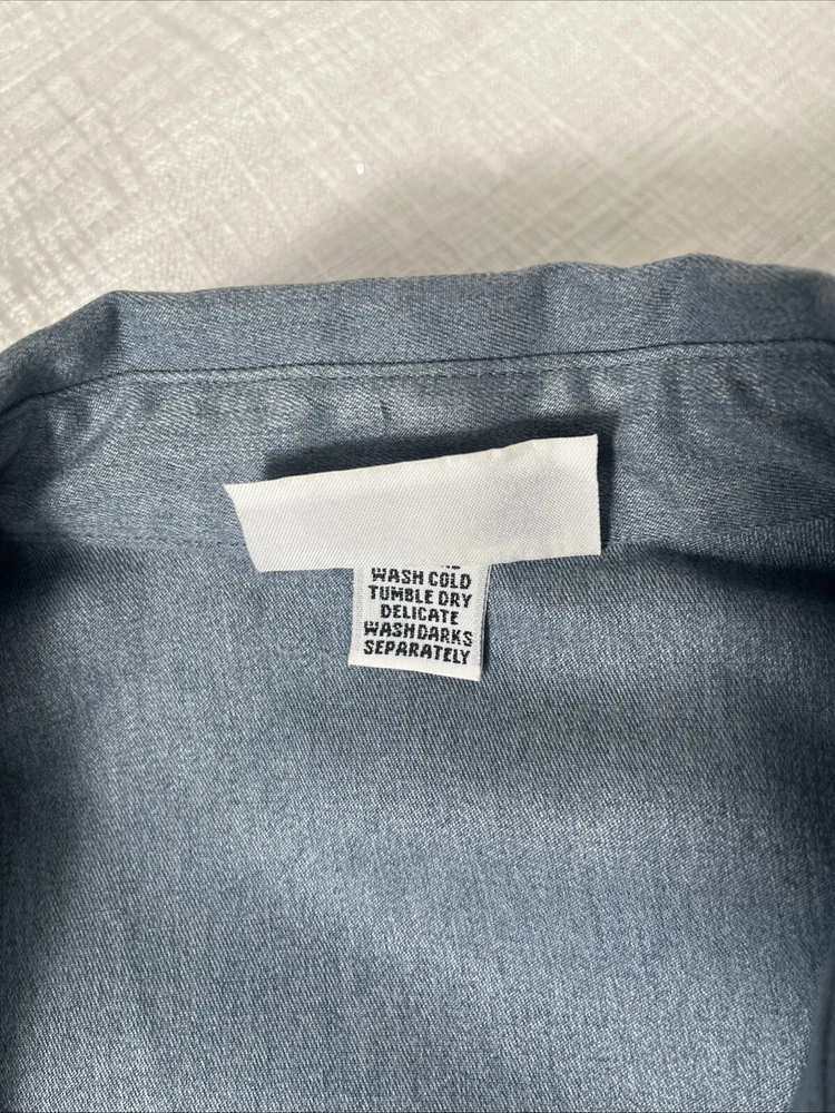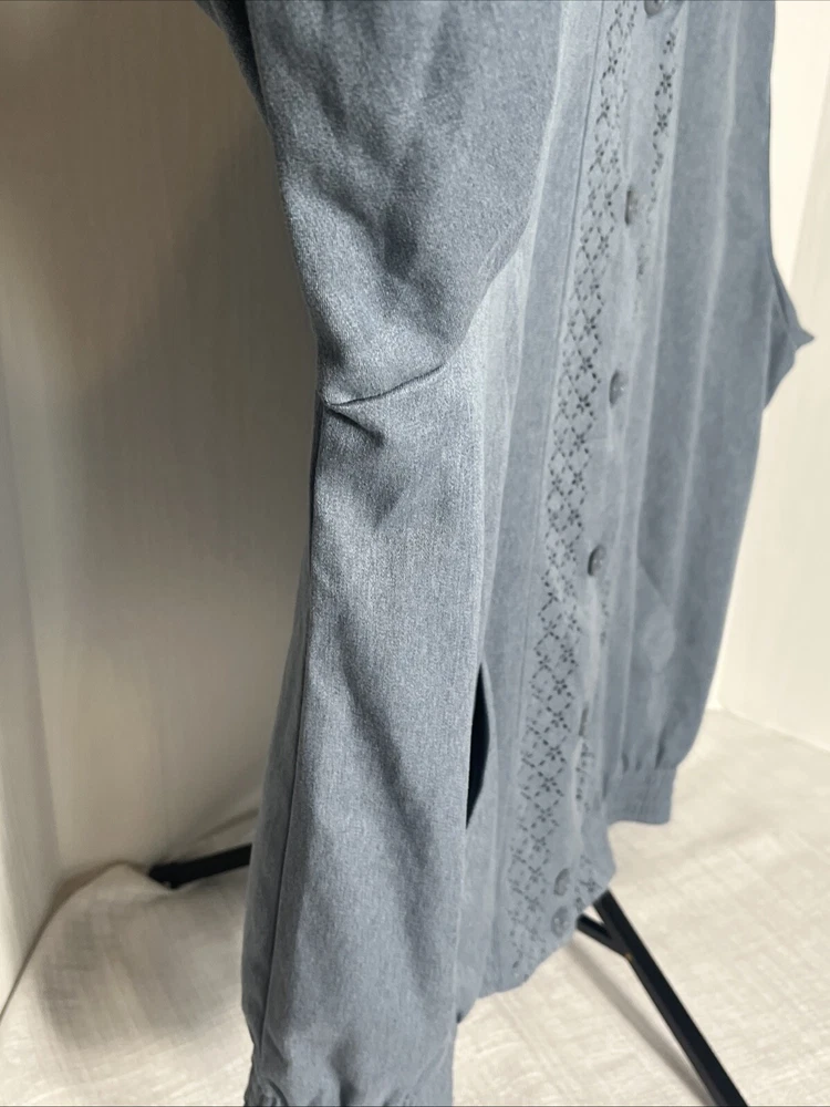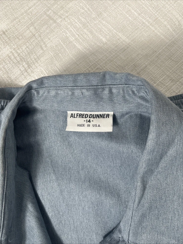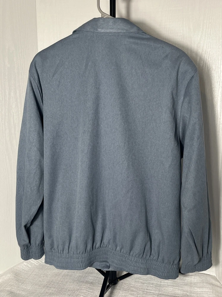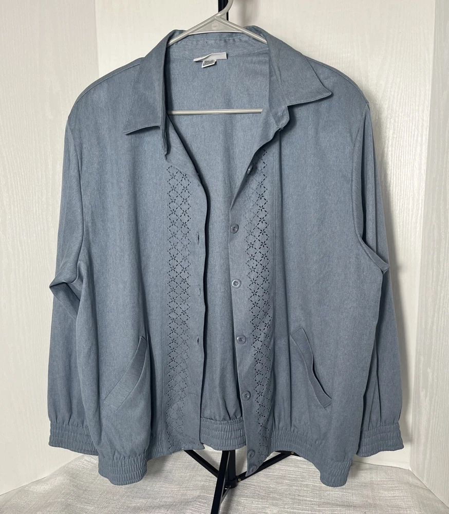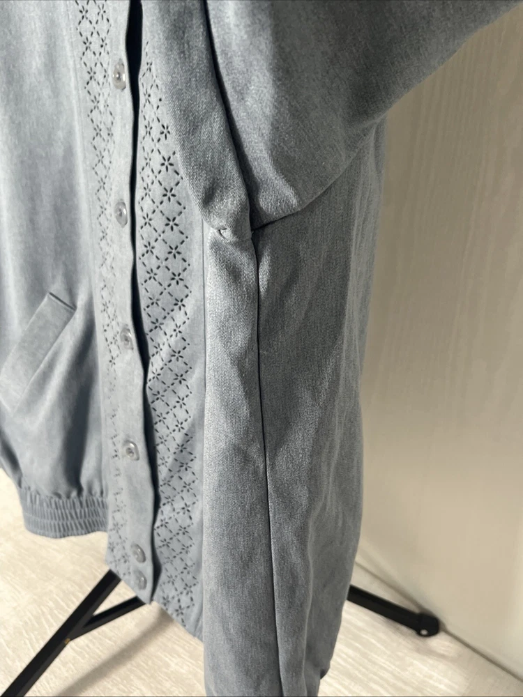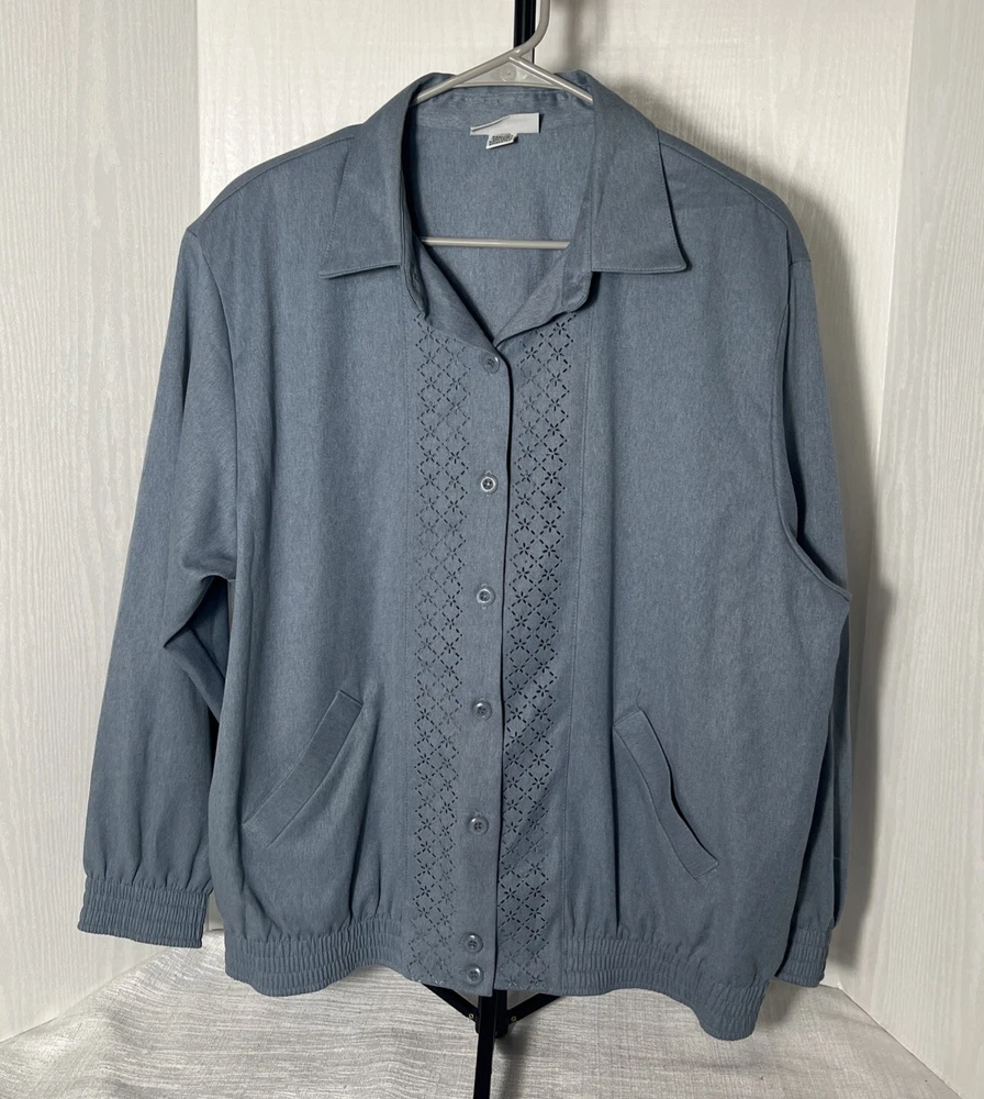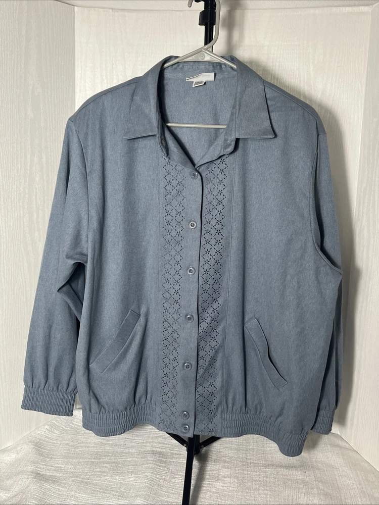This Alfred Dunner ladies' jacket in slate blue color with geometric laser cutting design. The jacket features: *Button front *collared neckline *full button front, *two front pockets, *shoulder pads, *elastic cuff and hemline. Made in the United States, machine washable, lightweight and is size 14. Preowned. No material tag, however similar jacket lists maters as polyester and cotton. Very good condition. **Returns accepted within 30 days! 🎉🎉 Returned items must be returned in original condition received, buyer pays return shipping cost. Measured flat: Length 27 inches P2P: 24.5 inches Bicep 9 inches Shipping USPS ground advantage Take a peek at SweetShine’s other listing. Thanks for viewing.