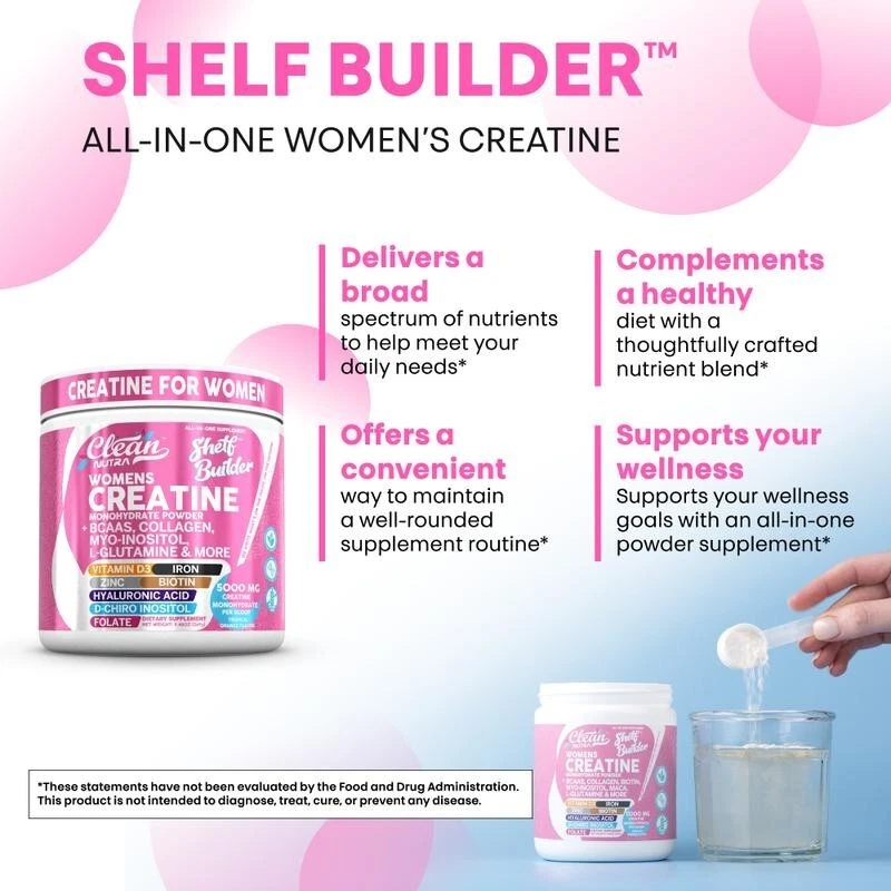 Clean Nutra Women’s Creatine – Shelf Builder™ | All-in-One Support for Strength, Recovery & Beauty Revolutionize your supplement routine with Shelf Builder™ by Clean Nutra , an advanced 15-in-1 creatine formula crafted specifically for women. Boost energy, enhance recovery, and nourish your hair, skin, and nails—all in one scoop! What’s Inside Each Scoop (9g / 30 Servings): Creatine Monohydrate – 5000mg for strength and performance BCAAs & L-Glutamine – Muscle repair and post-workout recovery Collagen Peptides – Supports healthy skin, hair, and nails Myo-Inositol & D-Chiro Inositol – Hormonal and metabolic balance Folate, Biotin, Iron, Zinc, Vitamin D3 – Immune and energy support Hyaluronic Acid – Hydration and joint care Maca Root & Digestive Enzymes – Hormonal and gut health Flavor: Clean Tropical Orange Suggested Use: Mix 1 scoop with your favorite beverage daily. Why Choose Shelf Builder™? Combines 15 supplements in 1 easy scoop Designed for active women who want strength, recovery, and beauty support Gluten-Free | Non-GMO | Made with Natural Ingredients USA Company | Purity & Potency Standard
