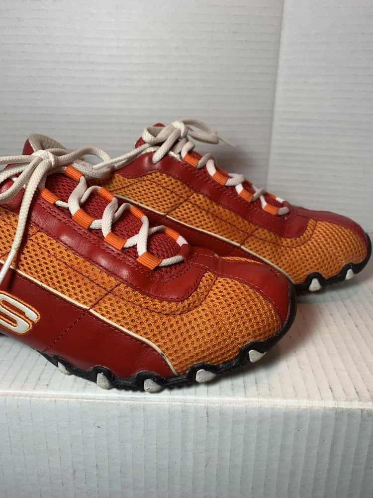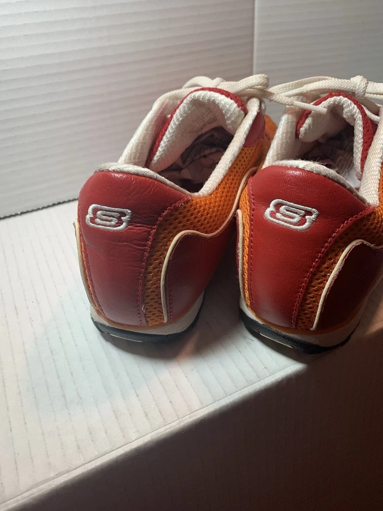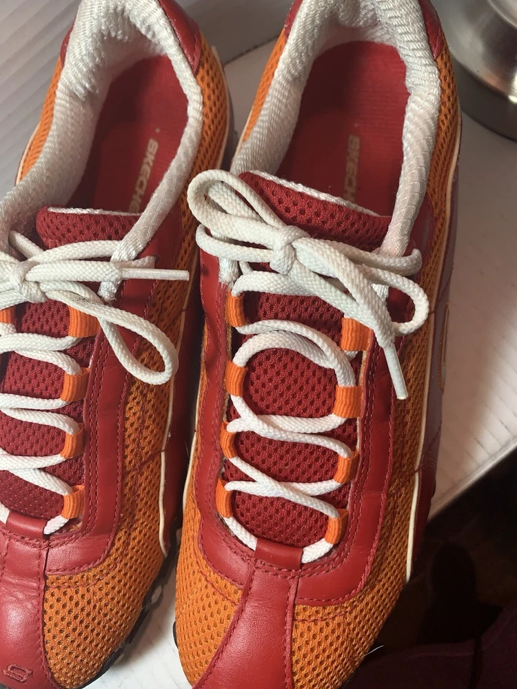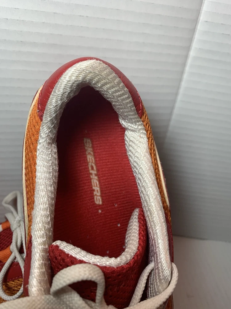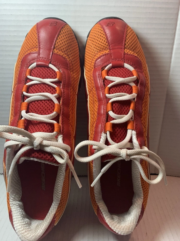 Step up your shoe game with these vibrant orange and red Sketchers sneakers! Made with leather and featuring a slip-resistant rubber cleat, these athletic shoes are perfect for any occasion - whether it's for activewear, casual workwear, or just for everyday casual wear. The breathable fabric insole ensures your feet stay cool and comfortable, while the insulated feature keeps them warm in the winter and cool in the summer. These size 9 1/2 shoes are perfect for any sports or performance activity, including bowling, baseball, and basketball. The Sketchers Street product line is known for its colorful and trendy designs, and these sneakers are no exception. With a medium shoe width and a comfortable fit, these shoes are a must-have addition to any wardrobe.