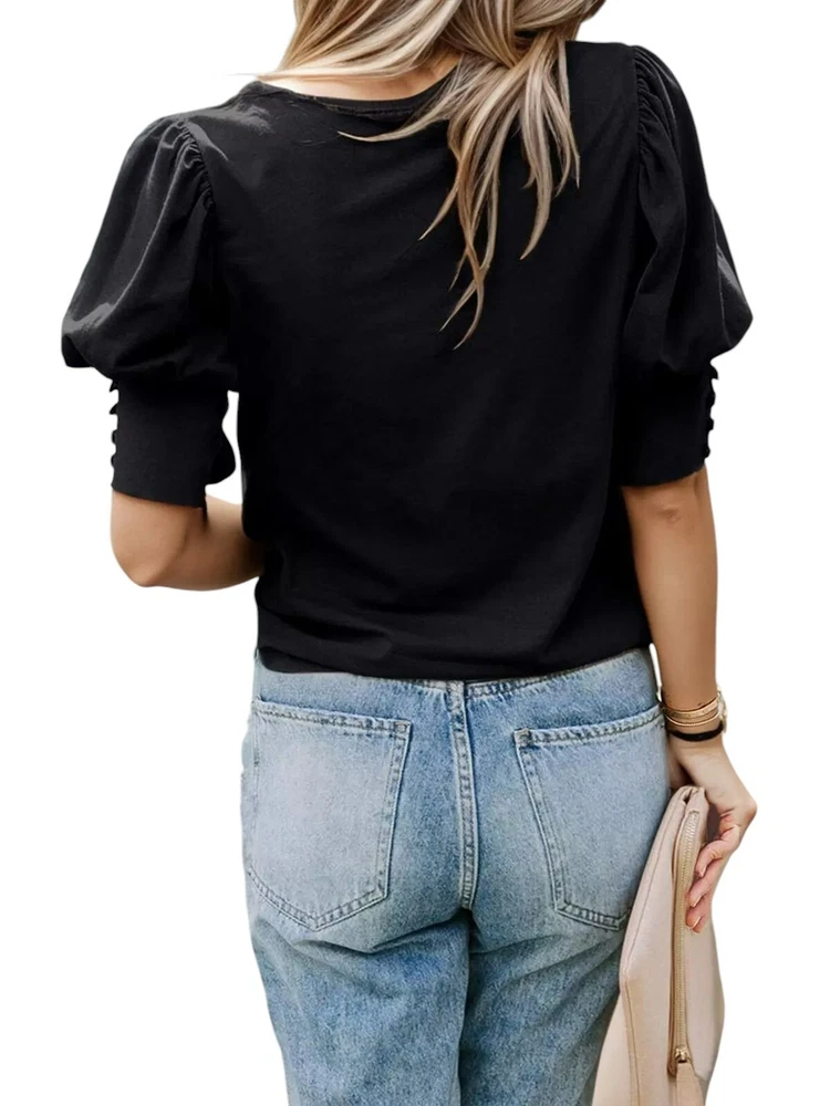 Women's top Black Stretch knit 72% Polyester, 25% Cotton, 3% Spandex Puff Sleeves Elastic button-accent cuffs Follow The Style Outpost for more deals! Big Deal: Buy 2 or more items for EXTRA savings! FREE 60 day returns! 10% restocking fee applies.