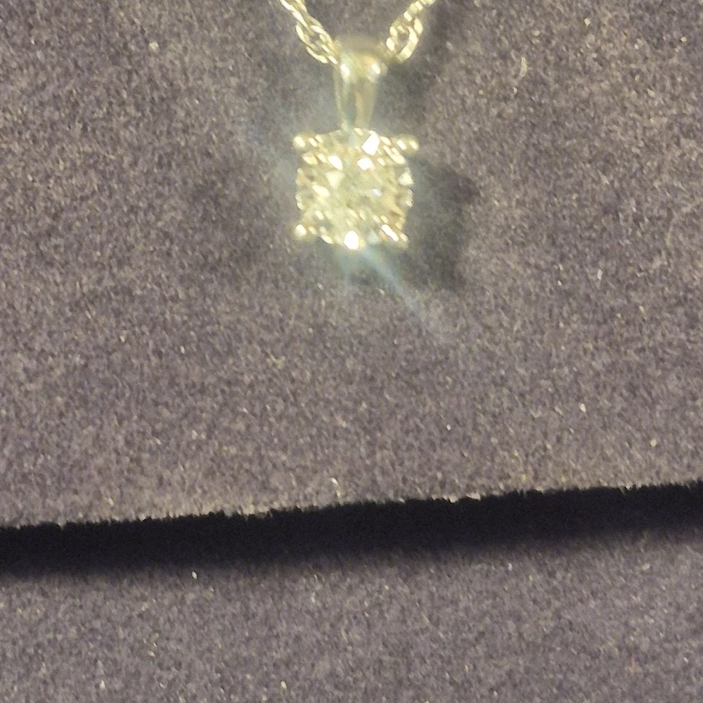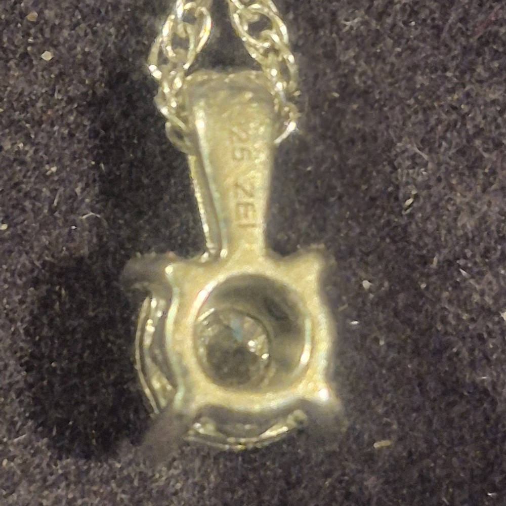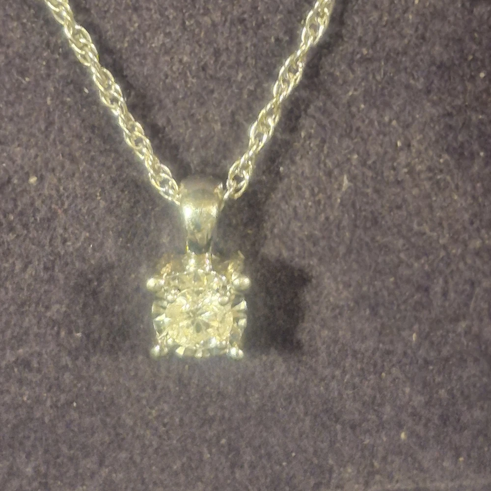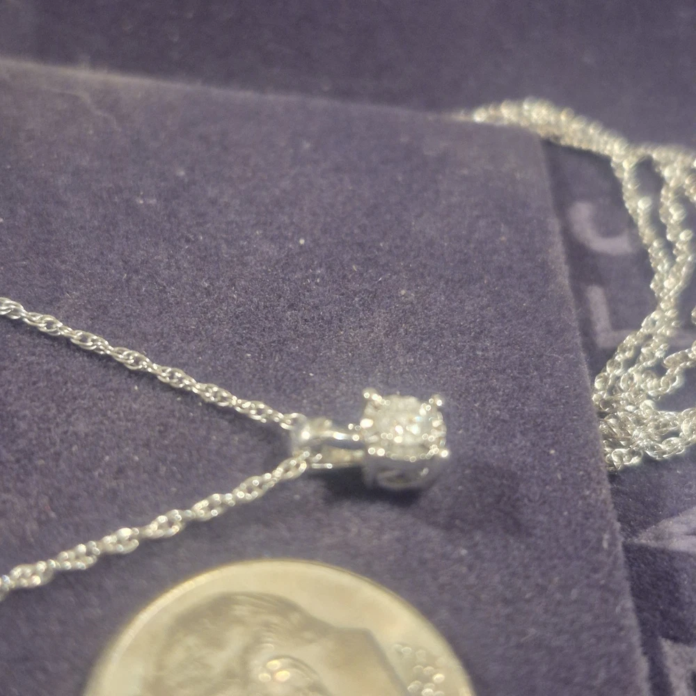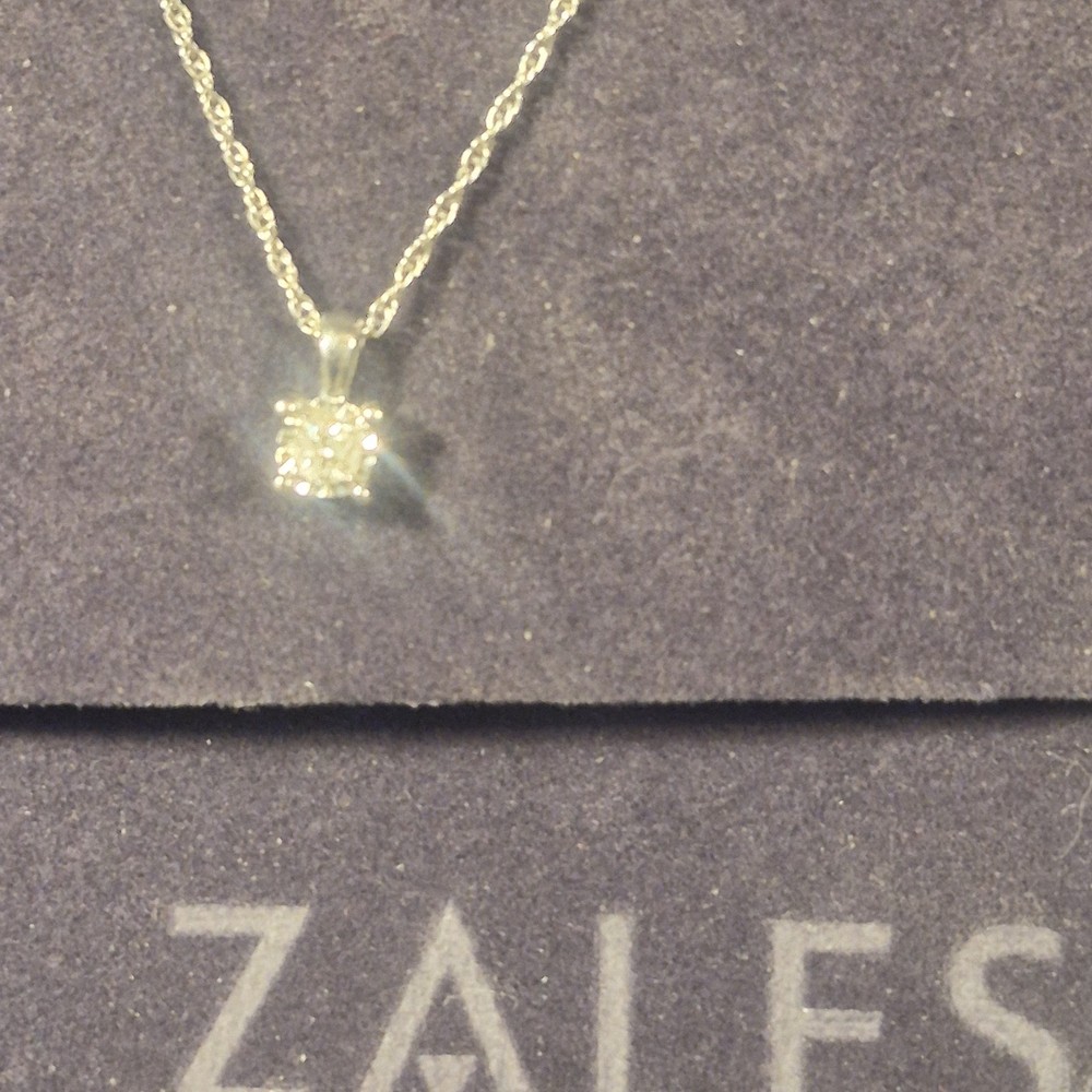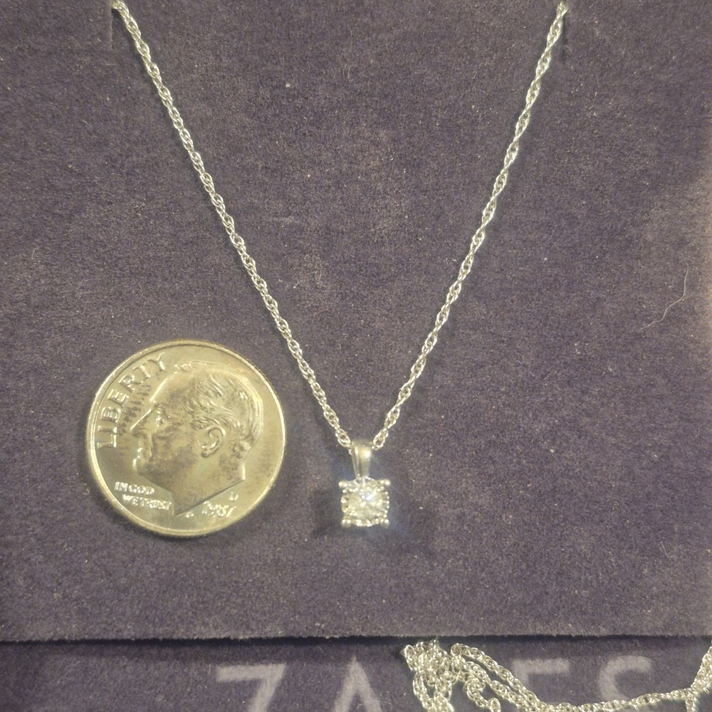 This ladies necklace features a stunning diamond pendant set in sterling silver, making it a perfect accessory for anniversaries. The pendant is signed by Zales and the necklace is 18 inches in length with a total carat weight of 1/10 carats. The elegant design includes a prong setting for the round white diamond, adding a touch of sophistication to any outfit. The chain style adds a classic touch to the charm pendant, making it a versatile piece that can be worn for any occasion. It is a very small diamond so its placed next to a dime for scale. It is new with box.