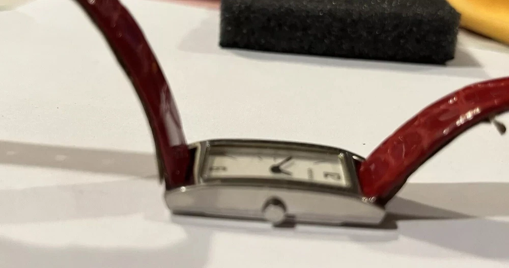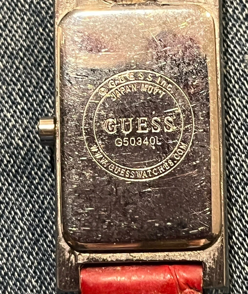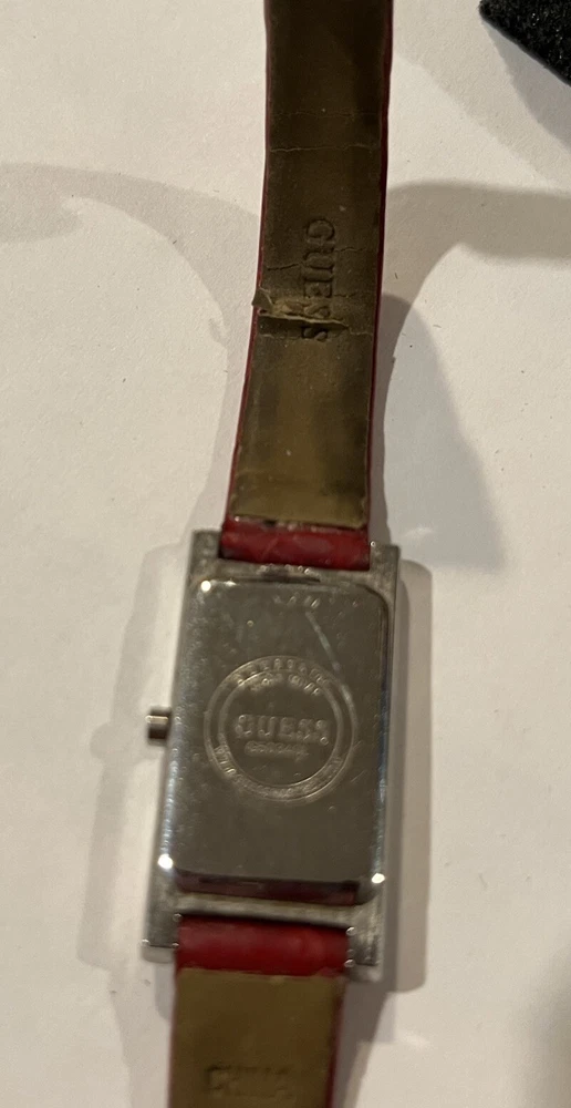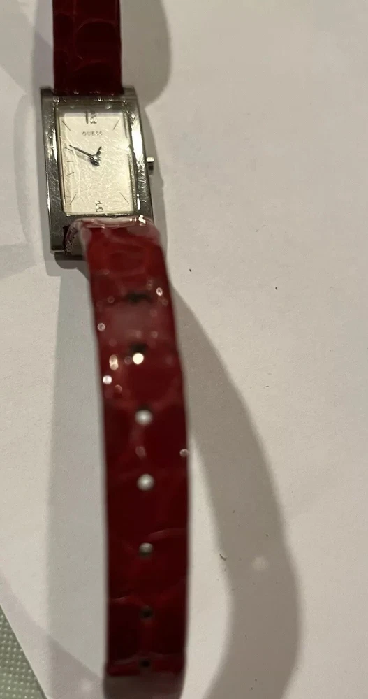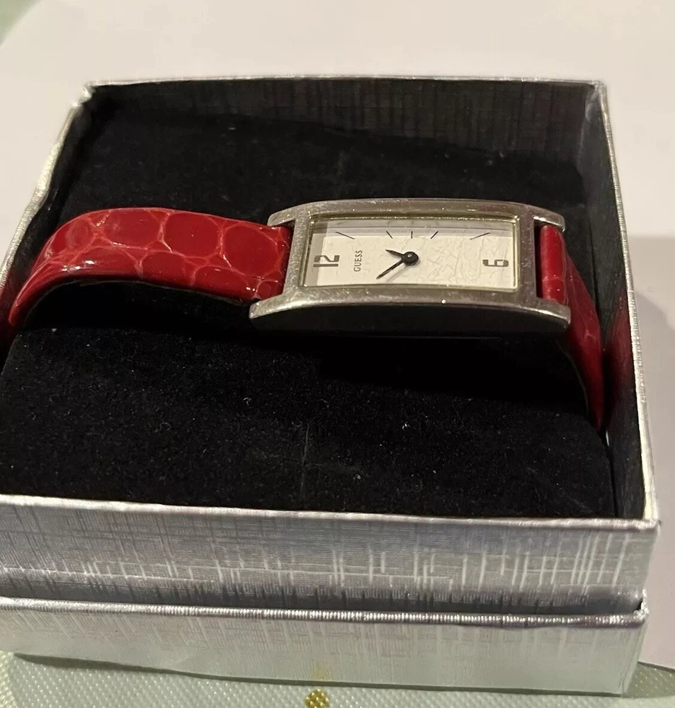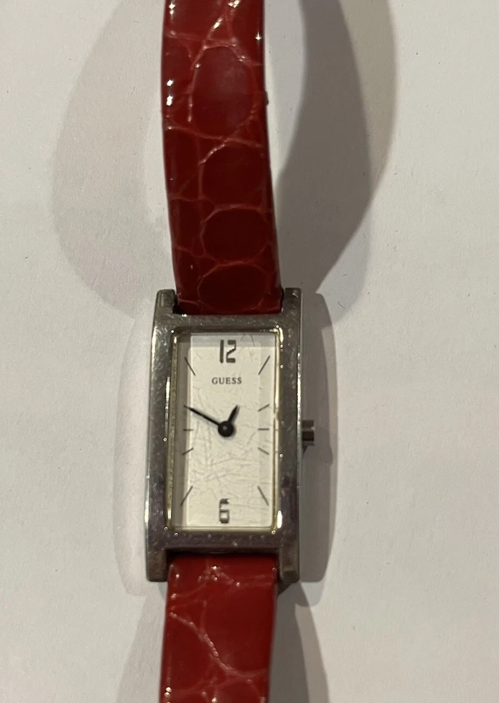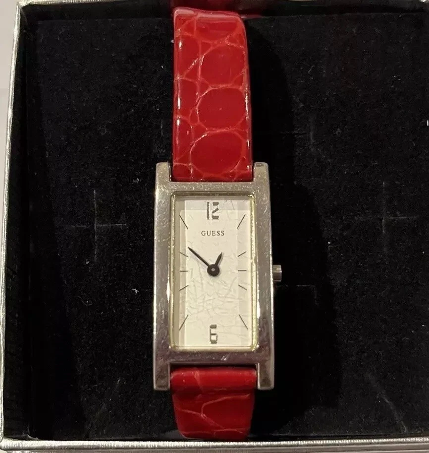 Ladies Vintage Analog Guess Watch, Red Leather Band , Silver tone Case, White Face, New Battery Works Great! Strap shows wear as you can see in photos but definitely wearable. Beautiful red color leather. Case measures approximately 28mm tall by 17mm wide