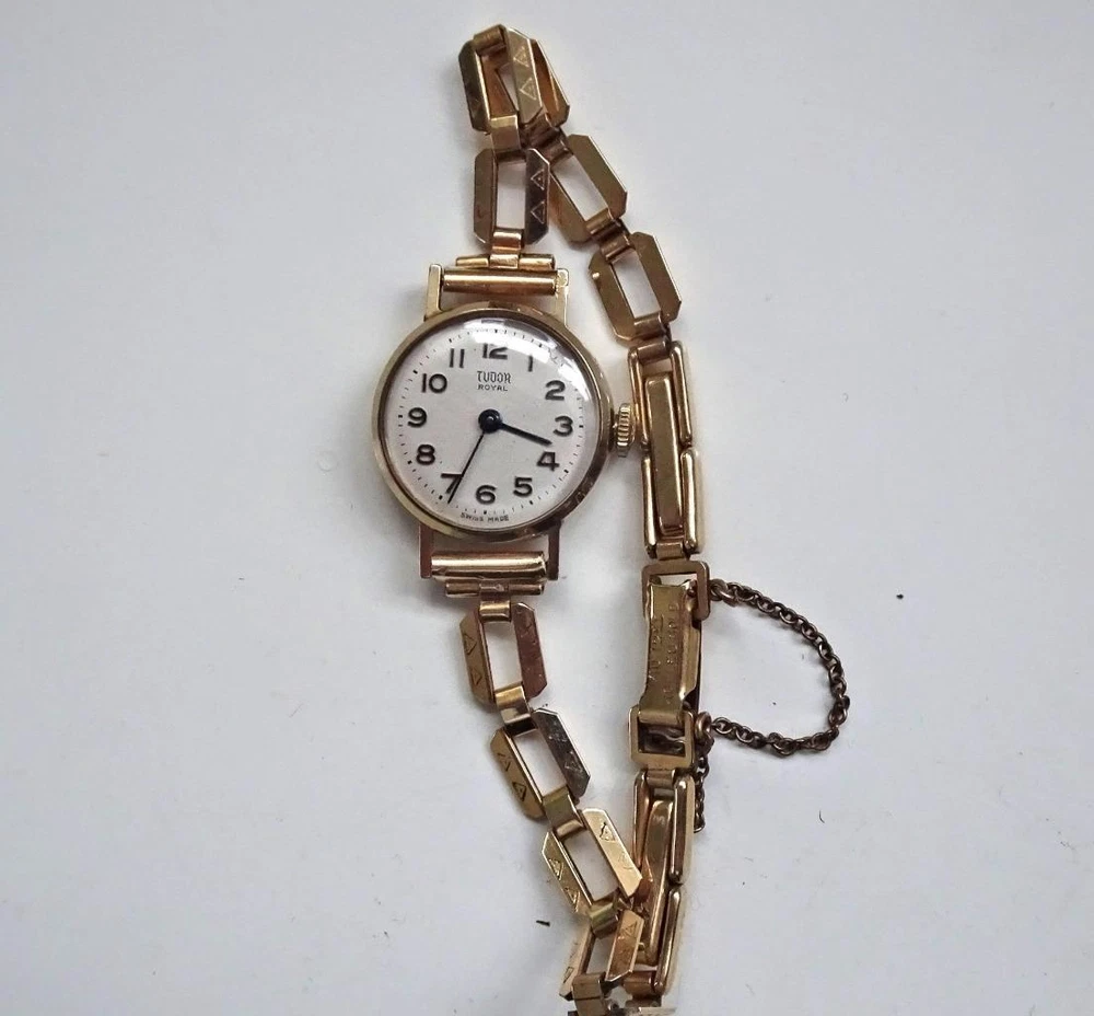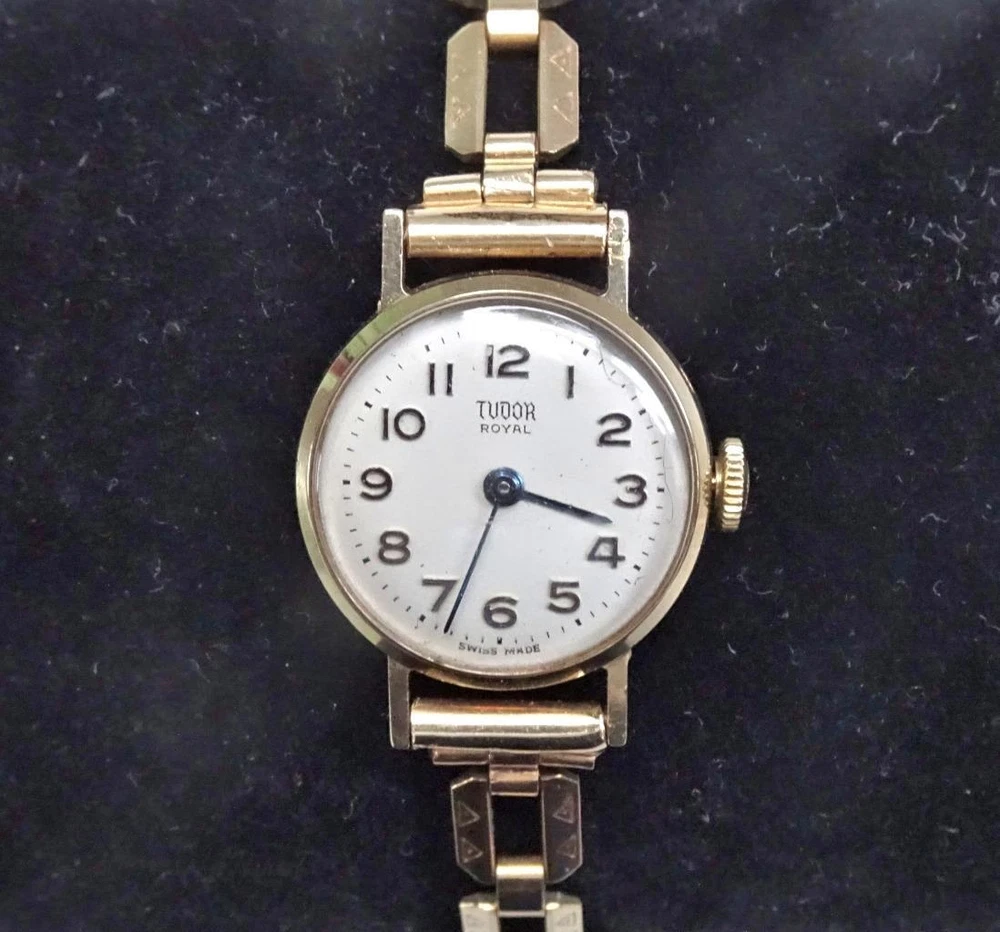 Year Manufactured: 1960-1969 Case Material: Yellow Gold Type: Wristwatch Bezel Colour: Gold EAN: Does not apply Customised: No Features: Swiss Made, Swiss Movement With Original Box/Packaging: No Case Colour: Gold Movement: Mechanical (Manual) Display: Analogue Strap Colour: Gold Model: TUDOR Royal Style: Dress/Formal gtin13: Does not apply Reference Number: Does not apply Dial Colour: Champagne Brand: TUDOR Strap Material: Gold Filled With Papers: No Department: Women
