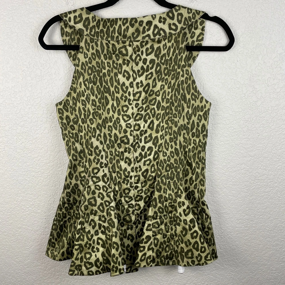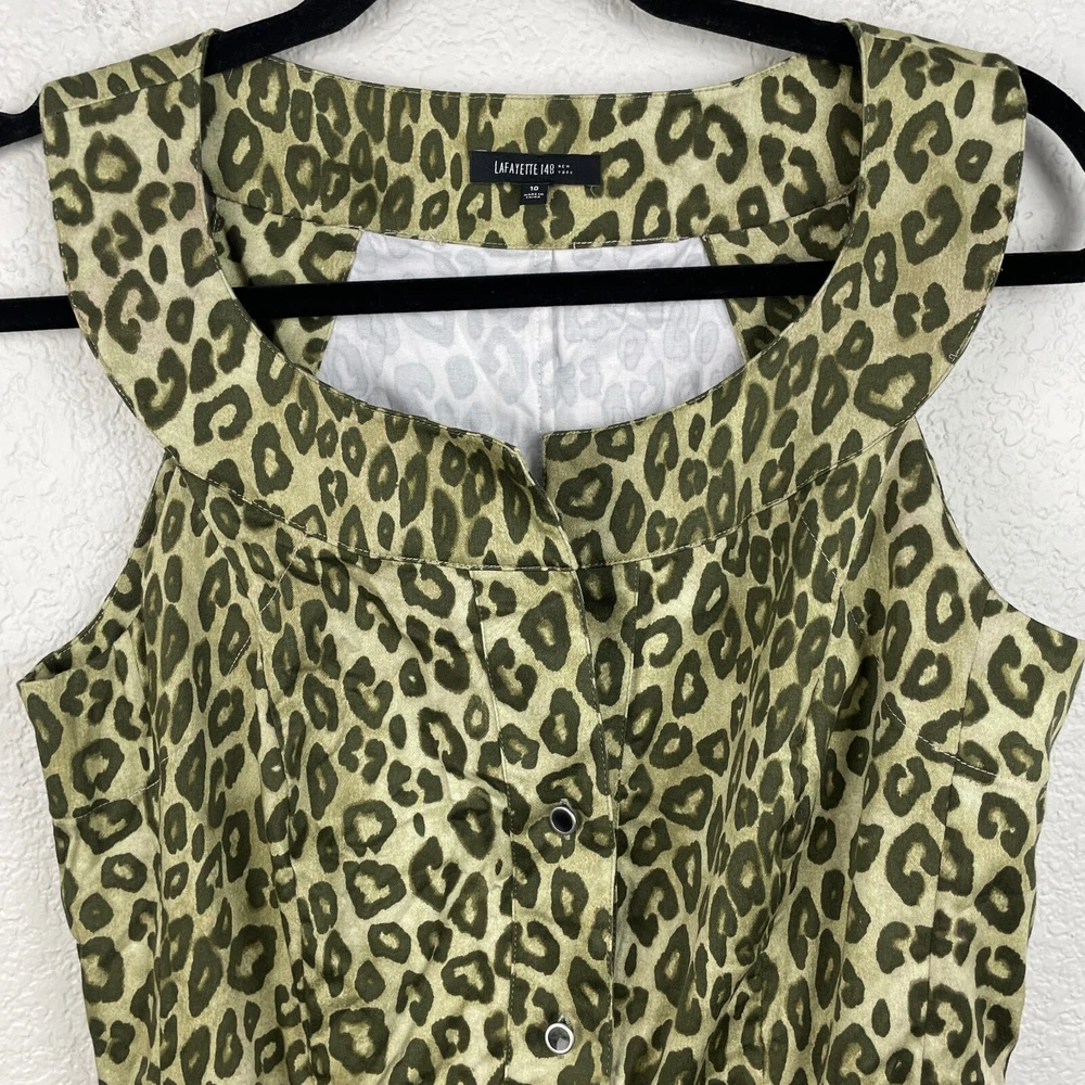 Theme: Art, Art to wear, Leopard, Staple, statement Accents: Button Sleeve Type: Sleeveless Color: Multicolor Size Type: Regular Occasion: Business, Formal, Party/Cocktail, Travel Size: 10 Type: Button-Up Pattern: Animal Print Fabric Type: Woven Material: Cotton, Cotton Blend, Elastane Country/Region of Manufacture: China Department: Women Features: All Seasons, Easy Care Vintage: No Neckline: Round Neck Fit: Regular Style: Basic Garment Care: Machine Washable Brand: Lafayette 148 New York Seller Notes: “very good pre-owned, see pictures. No known flaws” Season: Fall, Spring, Summer, Winter Closure: Button Sleeve Length: Sleeveless