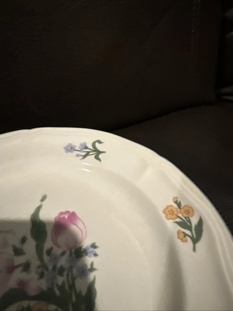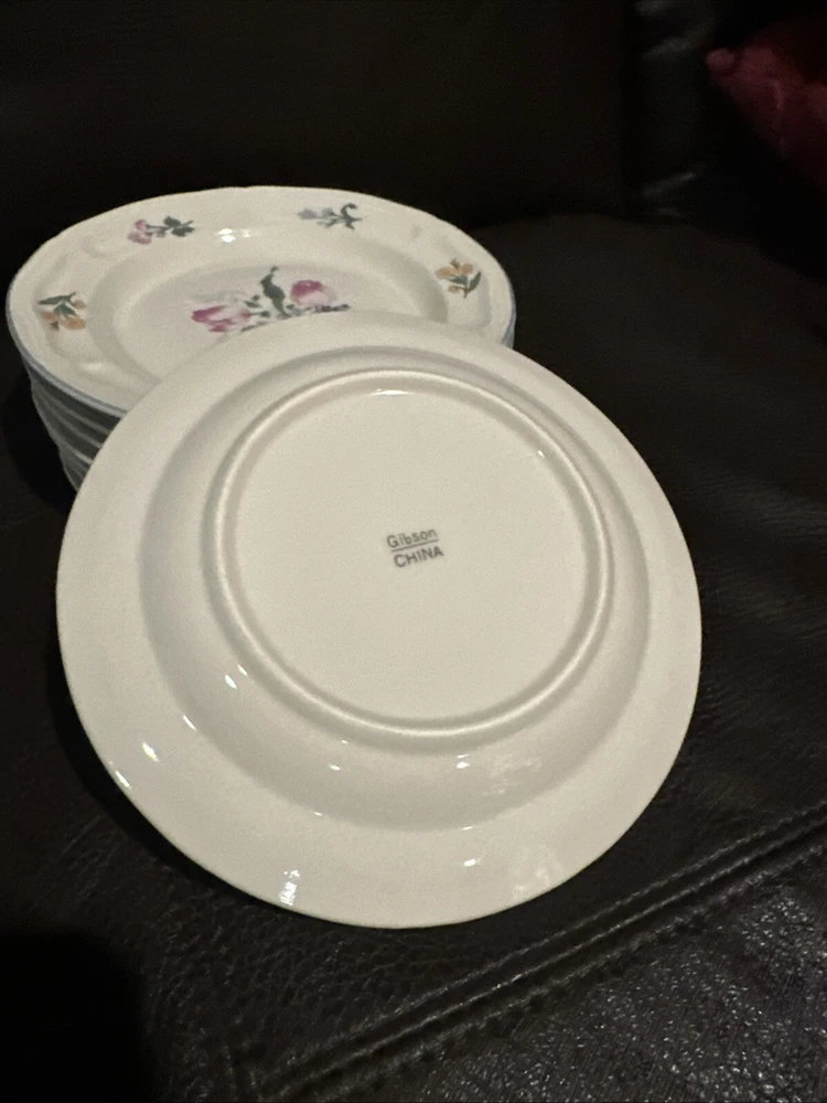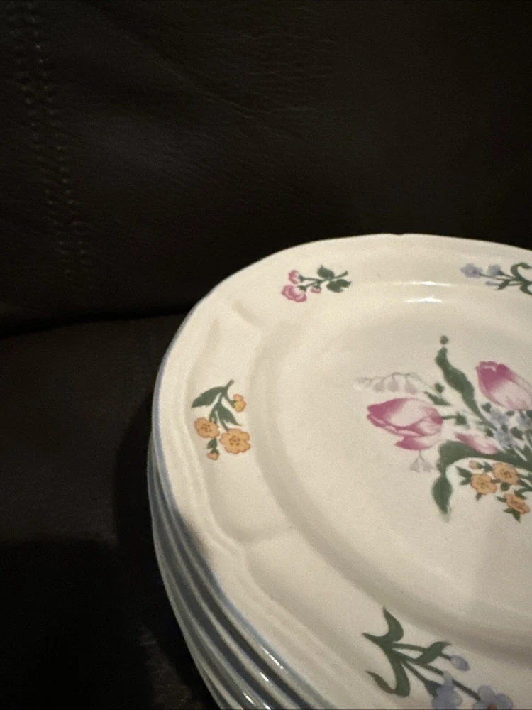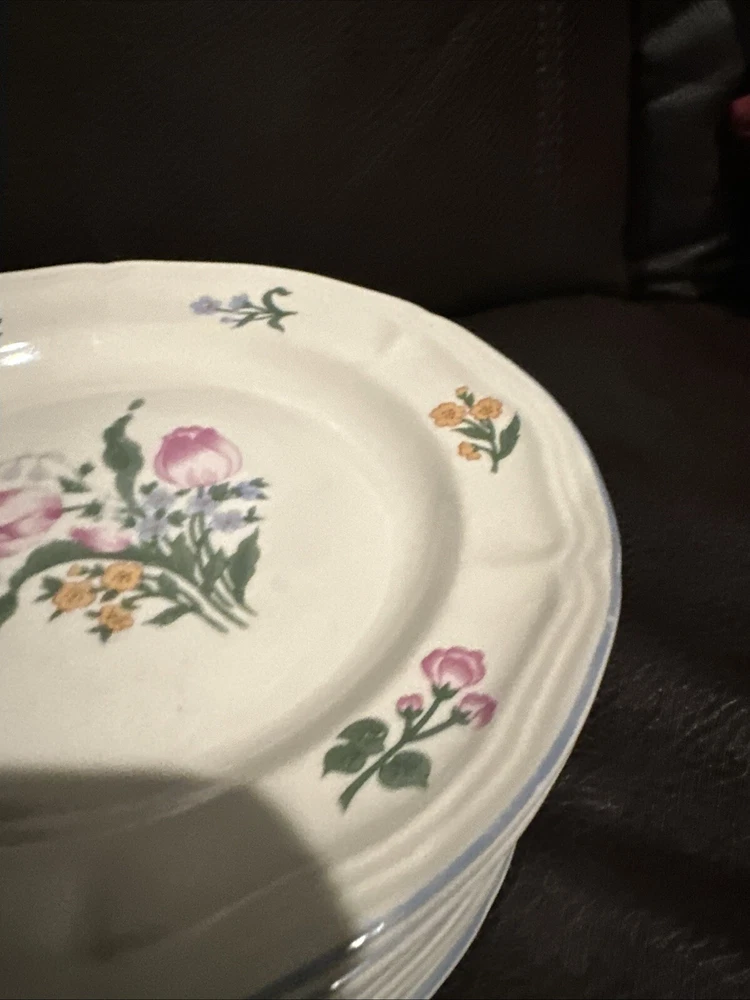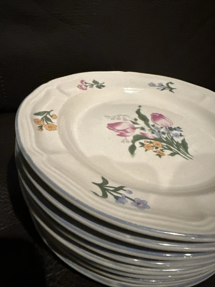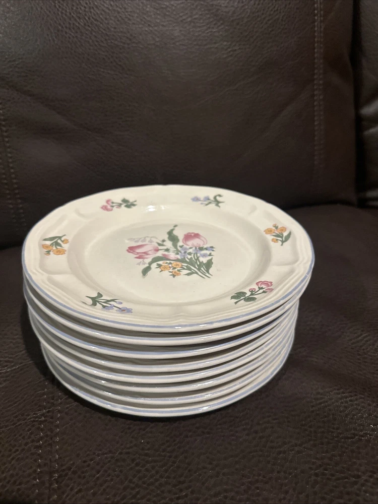 Add a touch of elegance to your table setting with these Lafayette by Gibson Tulip Floral Salad Lunch Plates. The eight-piece set includes round plates with a white ceramic material and blue trim, perfect for all occasions. These vintage plates are not only microwave, dishwasher, and oven-safe, but also feature a beautiful flower theme and a glossy finish. The set comes with both salad and dinner plates, making it ideal for any meal. The backstamp is printed and the plates are made in China. These original, licensed reproduction plates are sure to impress your guests and elevate your dining experience. Good used condition, normal wear chips or cracks!