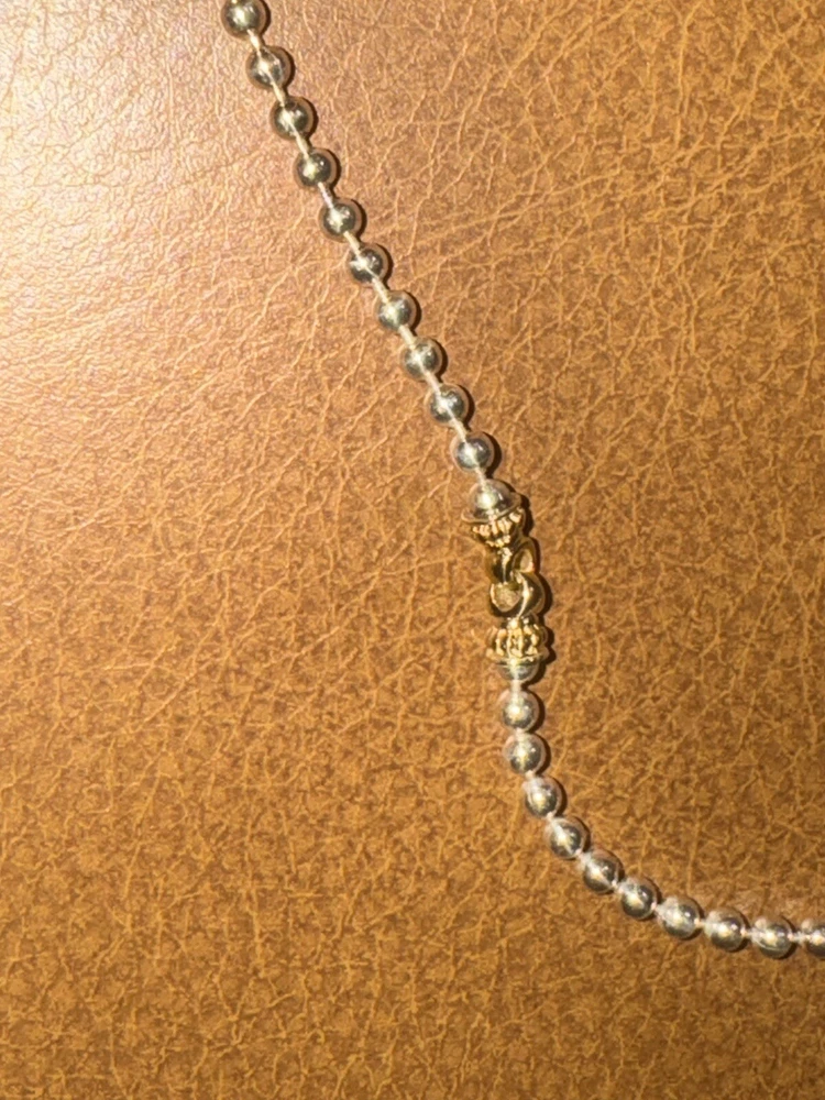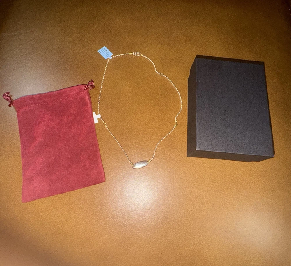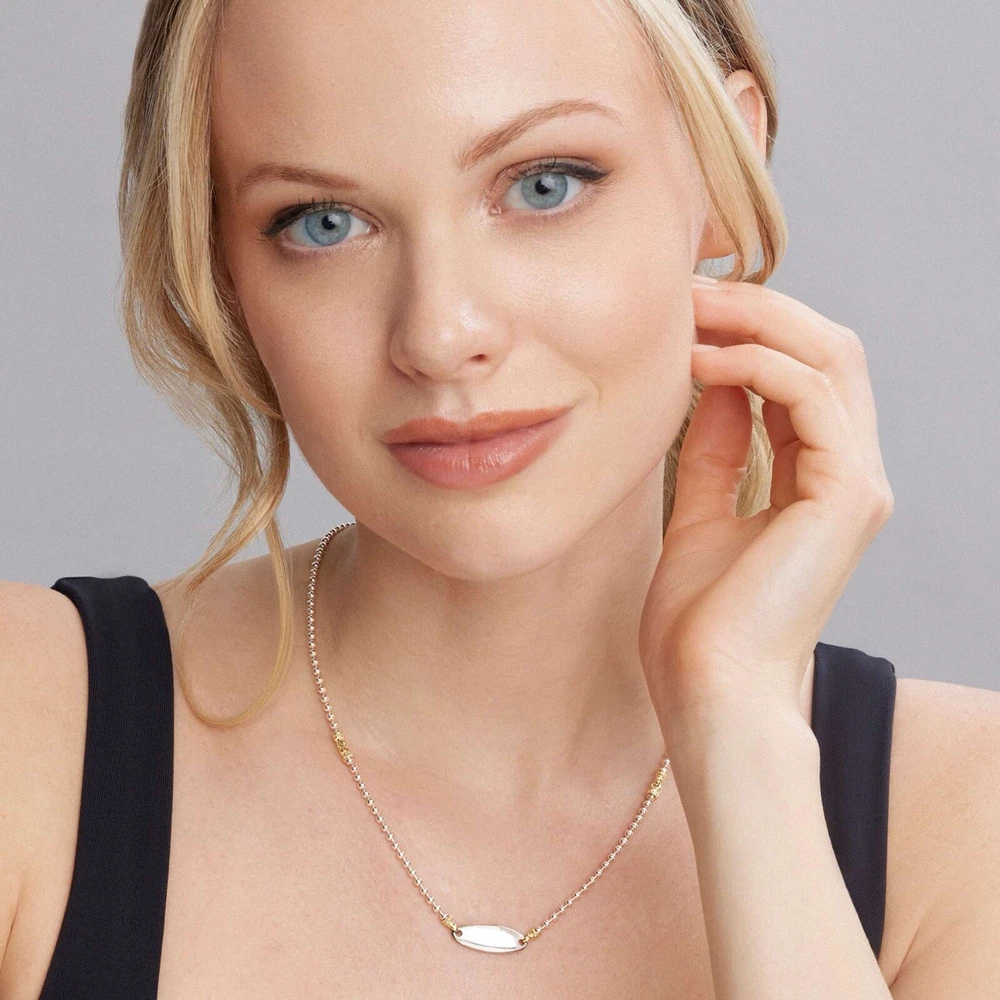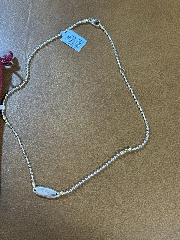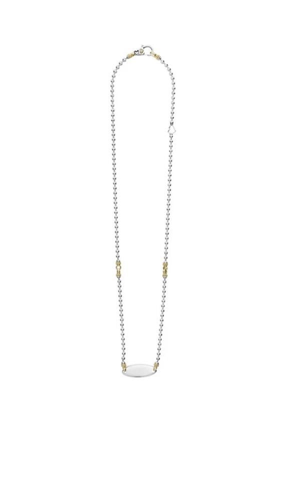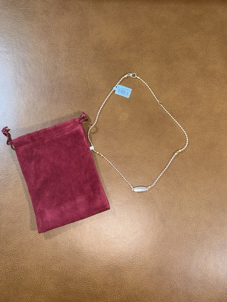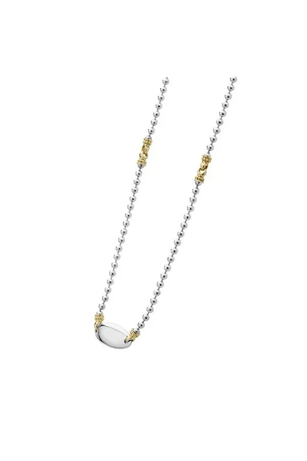 Type: Necklace Brand: Lagos Features: Adjustable Metal: Yellow Gold Main Stone: N/A Base Metal: Sterling Silver Closure: Lobster Color: Silver Pendant/Locket Type: Bar Pendant Shape: Oval Main Stone Shape: Oval Metal Purity: 18k Necklace Length: 18 in Style: Beaded, Statement