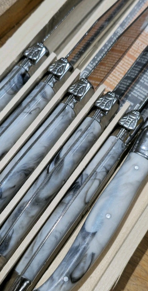 Retail $80 + tax Brand: Laguiole Type: Steak Knife Material: Stainless Steel Colour: Beige Handle Material: Composite Set Includes: Steak Knife Custom Bundle: No Features: Dishwasher SafeItem Height: 5 cm Item Width: 15 cm Item Length: 20 cm