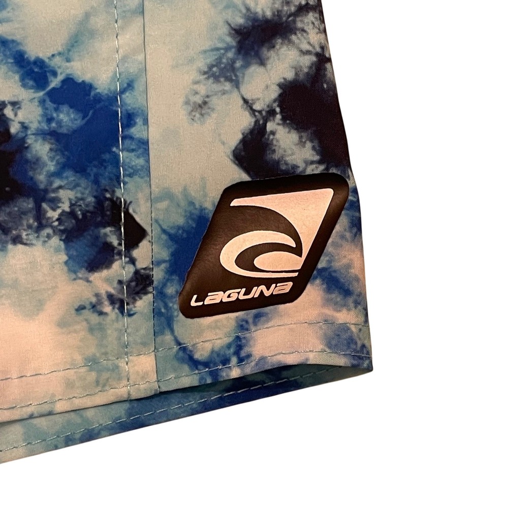 Dive into summer fun with these eye-catching Laguna swim trunks. A vibrant blue tie-dye pattern creates a splashy, modern look, perfect for making a statement at the beach or pool. The comfortable elastic waistband with a neon yellow drawstring ensures a secure and adjustable fit, while the convenient zipper pocket keeps your essentials safe and sound. These swim trunks are designed for both style and practicality, allowing you to move freely and confidently. Picture yourself lounging by the pool, playing beach volleyball, or enjoying a casual day at a water park in these stylish and functional swim trunks. Measurements: • Waist: 15.5 in • Inseam: 7.5 in Color: Blue Type: Bottom Swim Bottom Style: Swim Shorts Department: Men Pattern: Tie Dye Features: Elastic Waist, Drawstring, Pockets, Quick Dry Material: Polyester, Spandex Performance/Activity: Surfing, Recreational Keywords: mens swim trunks, swim shorts, blue tie dye, drawstring, zipper pocket, beachwear, pool attire, summer fashion, Laguna, large, swimwear, mens clothing, vacation, resort wear The Designer Clothing Exchange "Great Brands, Great Prices" - NEW ITEMS DAILY 5 STAR SELLER - FAST SHIPPING DAILY - AMBASSADOR II