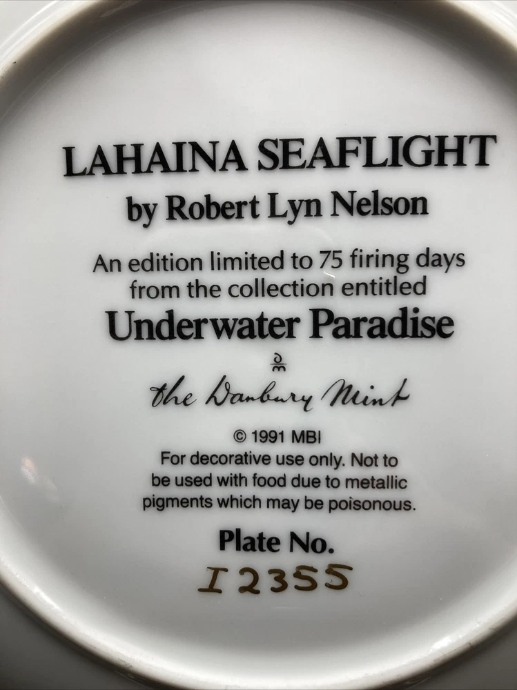 Lahaina Seaflight is a limited edition 8 1/8 inch collector plate from the Underwater Paradise Danbury Mint Collection. This plate is in excellent condition. See more limited edition collector plates, stained glass clocks and vases and Precious Moments collectibles at GiftyGold.com.