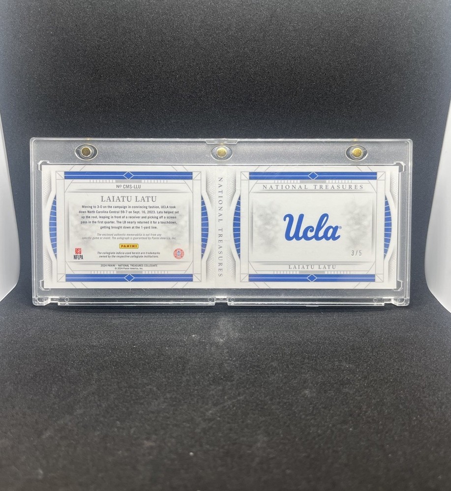 Elevate your collection with the Laiatu Latu UCLA Booklet Auto, a must-have for football aficionados and memorabilia collectors. This sports trading card features a coveted rookie autograph from Latu, complemented by an eye-catching UCLA logo patch. Limited to just 5 copies, this National Treasures piece is a unique treasure for fans and collectors alike. The card is ungraded, presenting an opportunity for enthusiasts to grade and potentially enhance its value. Showcasing Latu's potential and collegiate prowess, this card is a standout piece representing a promising athlete's early career. Add this exclusive item to your collection and own a piece of sports history.