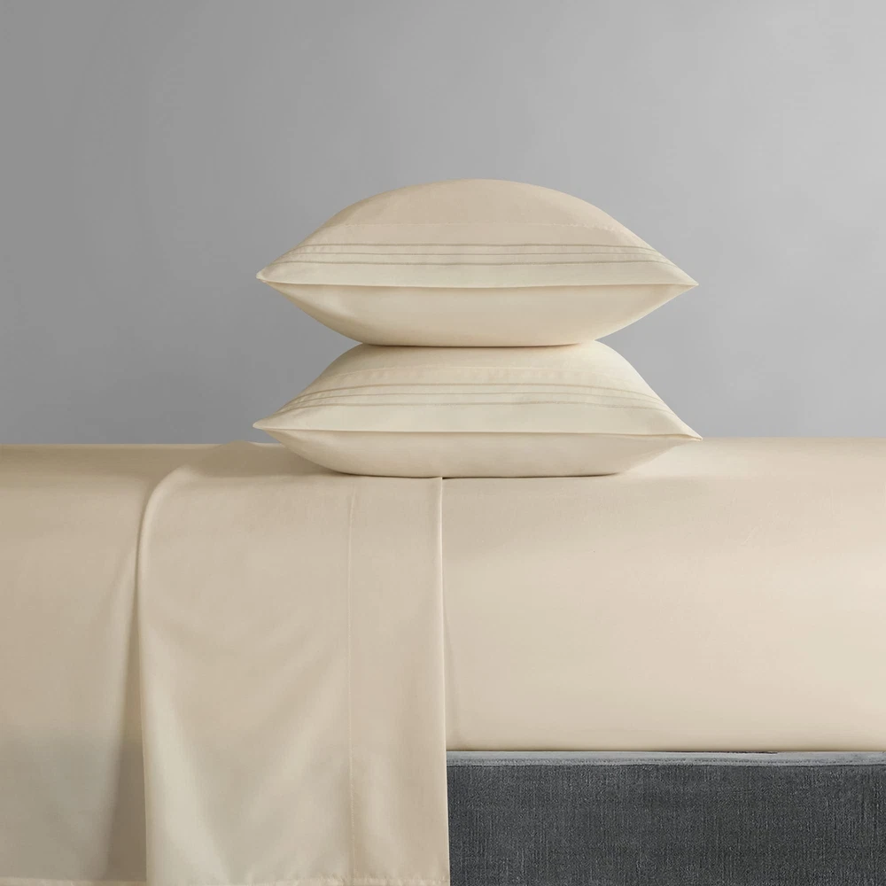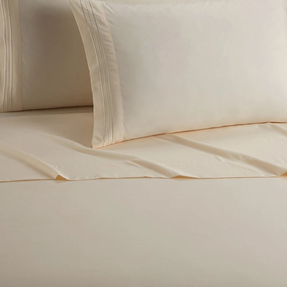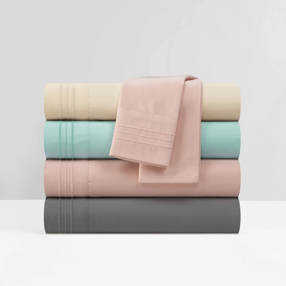 Nothing makes your bedroom feel more complete and put together than knowing you’ve got the perfect set of sheets to set a baseline. This cozy hotel quality set is available in a range of solid tones and features stripe embroidered details. Slip into a luxurious slumber with the Lain sheet set from complete with fitted sheet, flat sheet, and pillowcases. Specifications: • Size: Queen • Color Scheme: Beige • Piece Count: 4 • Set Includes: • 1pc Solid Color Fitted Sheet (60” x 80” + 14") • 1pc Solid Color Flat Sheet (90” x 102”) • 2pc Stripe Embroidered Pillowcases (20” x 30") • Materials: Luxuriously brushed microfiber fabric Fabric and Design: • Silky soft brushed microfiber fabric • Stripe embroidered details Features: • Luxuriously soft feel for a great night sleep with less tossing and turning • Built to last with premium fabrics and expert stitching Care Instructions Dry clean preferred. Machine washable, use front loader machine (or top loader without agitator) to avoid tearing, use cold water on gentle cycle, tumble dry low * Add 2 tennis balls to the dryer to speed up drying and add fluffiness The digital images we display have the most accurate color possible. However, due to differences in computer monitors, we cannot be responsible for variations in color between the actual product and your screen. LUXURIOUS SUPER SOFT PLUSH MICROFIBER - The sheet set is made with premium quality cotton-feel brushed microfiber for an amazing night’s sleep LIGHTWEIGHT - This sheet set is lightweight and ideal for all seasons STYLE AND COMFORT - This design coordinated flat and fitted sheet and pillowcase set is both a dream to look at and sleep on EMBROIDERED DESIGN - These cozy hotel quality set is available in a range of solid tones and features stripe embroidered pillowcases. Set includes fitted sheet, flat sheet, and pillowcases. MADE WITH YOU IN MIND - This sheet and pillowcase set is designed in the US and includes sheets and pillowcases