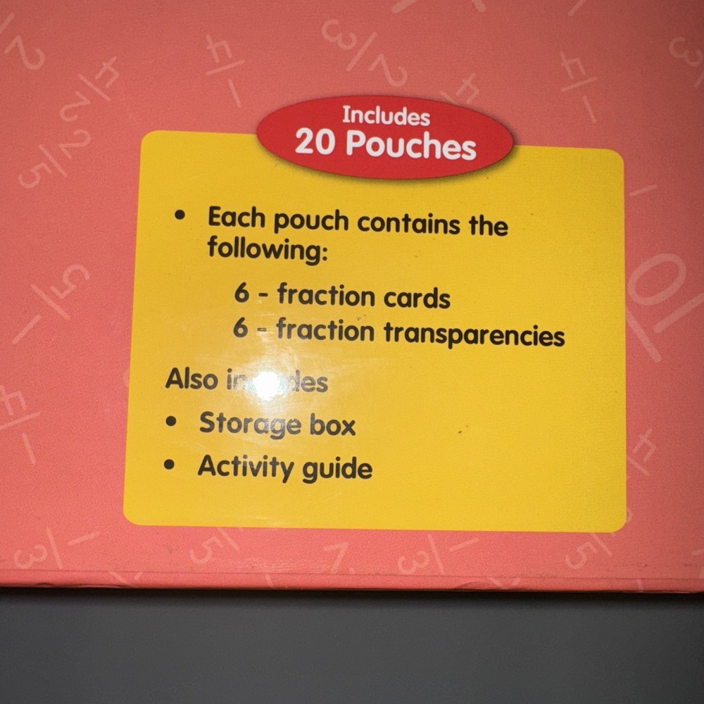 The Lakeshore Multiply Fractions Hands-On Kit is an educational toy designed for math learning in grade 5 students, specifically targeting those aged 8-11 years old. Made by the brand Lakeshore and manufactured in China, this hands-on kit provides a fun and interactive way for children to engage with mathematics. By using fractions in a tangible and visual manner, this toy helps students develop a deeper understanding of multiplication concepts, making it a valuable tool for educational growth and development. This item includes 19-20 pouches. Incomplete with 1 pouches missing. Open to offers