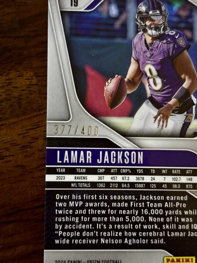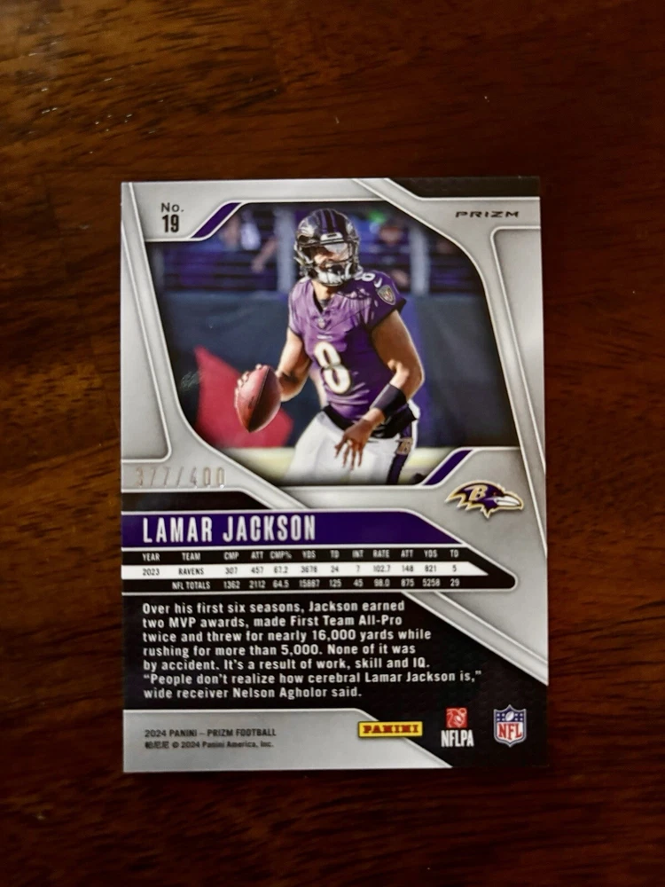 Team:Baltimore RavensSeason:2024Sport:FootballPlayer/Athlete:Lamar JacksonSet:2024 Panini PrizmType:Sports Trading CardCard Number:19Features:Exclusive, Parallel/Variety, Serial Numbered, Short PrintLeague:National Football League (NFL)Print Run:400Parallel/Variety:Pandora PrizmManufacturer:Panini