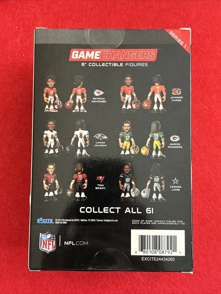 Player:Lamar JacksonTeam:Baltimore RavensProduct:Action FigureBrand:ExciteUPC:680108087921Country/Region of Manufacture:ChinaColor:WhiteOfficially Licensed:YesGender:MenSport:FootballLeague:National Football League (NFL)gtin13:680108087921Size:6