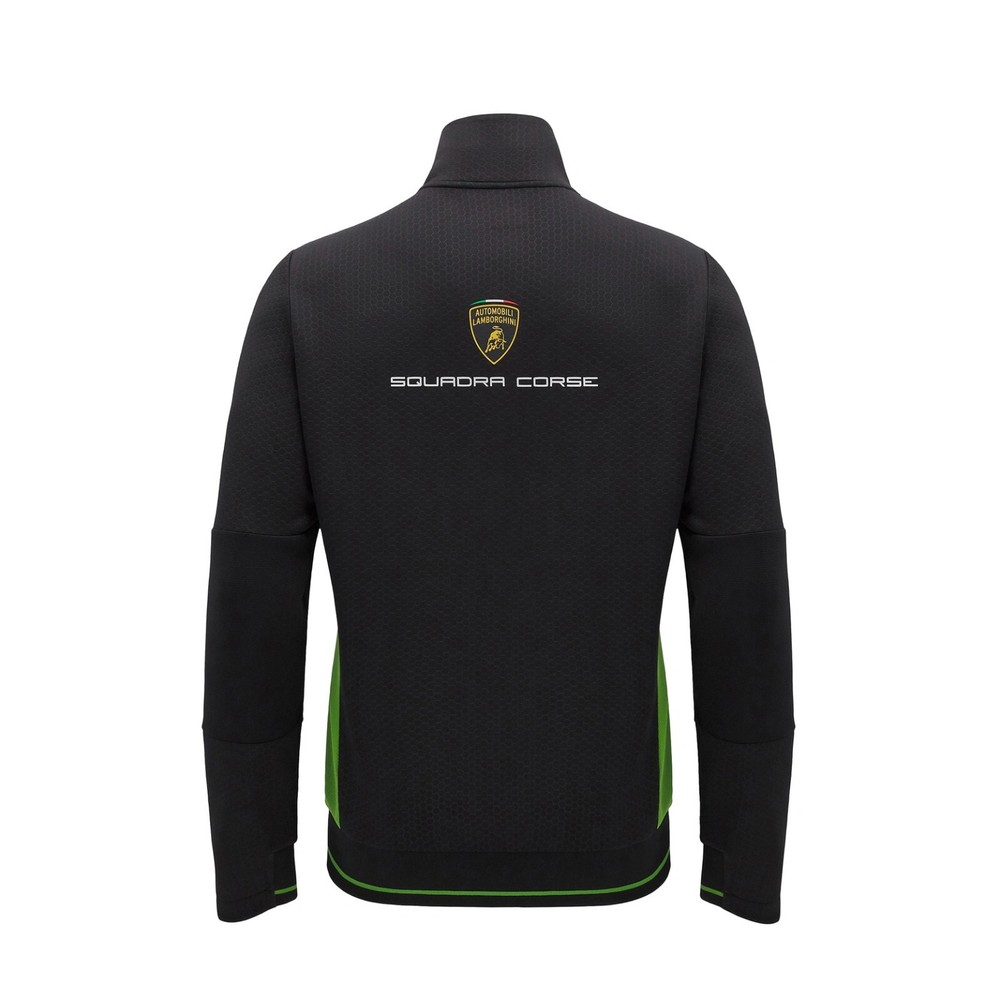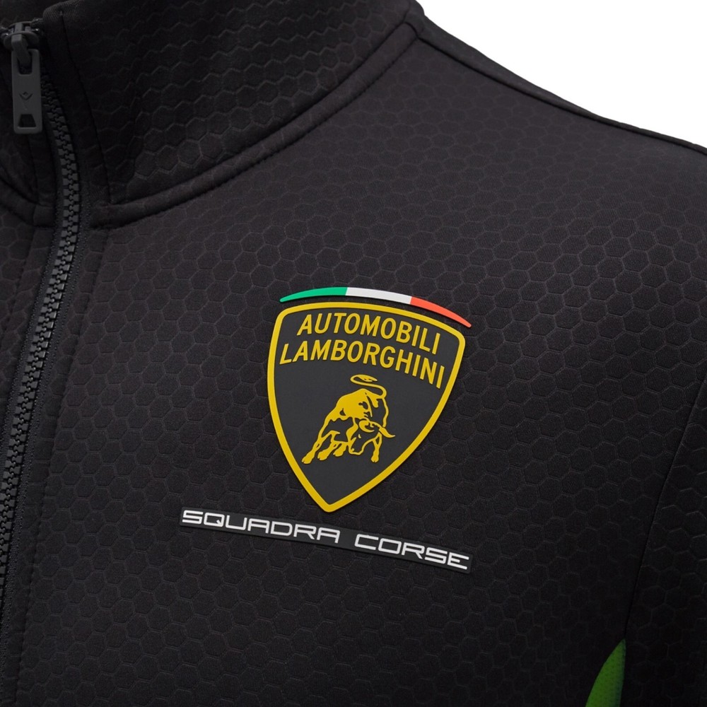 The Scuba light fabric and Jacquard workmanship offer excellent comfort to accompany you on any occasion. It features a practical central full zip and two comfortable side zip pockets. The high collar is designed to protect you from the cold. The Automobili Lamborghini Squadra Corse logo is applied on the left front. Further embellished by the colors and the official sponsors of the Racing Team. 91% Polyester 9% Elastane