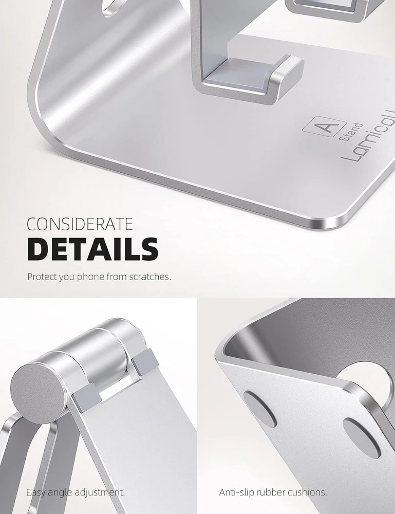 Lamicall Adjustable Cell Phone Stand, Desk Phone Holder, Cradle, Dock Brand Lamicall Color Silver Form Factor Case Compatible Devices Apple iPhone 14, iPhone 14 Plus, iPhone 14 pro, iPhone 14 pro max, iPhone 13 Mini, iPhone 13, iPhone 13 Pro, iPhone 13 Pro Max, iPhone 12 Mini, 12, 12 Pro, 12 Pro Max, iPhone 11, 11 Pro, 11 Pro Max, Xs, Xs Max, XR, X, 8, 7, 7 Plus, 6s, 6s Plus, 6, 6 plus, 5s, 5, Galaxy s22 s21 +, s21 ultra, s20, s10+, s10, s9, s8, a71, a52, a51, a32, a22, a12, a10e, a02s, 10e, note 20 ultra, note 10, 9, lg stylo 6, 5, k51, Velvet 5G, v60, c1, lenovo legion 5 5i 7 7i pro duel 2,Motorola one 5g ace, edge, plus, Moto g Play, google pixel 3, 3a, 4, 4a, 4 xl 5, 5a,huawei p20, p30, p40, mate 10, 20, pro, lite, Xiaomi, Nokia, Microsoft, Lumia, BlackBerry, 4-8" cellphone See more Compatible Phone Models Apple iPhone 14, iPhone 14 Plus, iPhone 14 pro, iPhone 14 pro max, iPhone 13 Mini, iPhone 13, iPhone 13 Pro, iPhone 13 Pro Max, iPhone 12 Mini, 12, 12 Pro, 12 Pro Max, iPhone 11, 11 Pro, 11 Pro Max, Xs, Xs Max, XR, X, 8, 7, 7 Plus, 6s, 6s Plus, 6, 6 plus, 5s, 5, Galaxy s22 s21 +, s21 ultra, s20, s10+, s10, s9, s8, a71, a52, a51, a32, a22, a12, a10e, a02s, 10e, note 20 ultra, note 10, 9, lg stylo 6, 5, k51, Velvet 5G, v60, c1, lenovo legion 5 5i 7 7i pro duel 2,Motorola one 5g ace, edge, plus, Moto g Play, google pixel 3, 3a, 4, 4a, 4 xl 5, 5a,huawei p20, p30, p40, mate 10, 20, pro, lite, Xiaomi, Nokia, Microsoft, Lumia, BlackBerry, 4-8" cellphone See more Product Dimensions 3 x 3 x 4 inches Item Weight 0.023 ounces Item model number A-Stand 02 Is Discontinued By Manufacturer No Special features Watch videos / Make Face-time Calls Other display features Wireless Department PHONE STAND Manufacturer Lamicall Features 【Warm Tips】The hook width of the mobile phone stand is 14mm, please make sure the thickness of your device is no more than 14mm (0.55 in). For a cell phone larger than 6 inches, kindly set it in landscape mode for more stability. 【Stable and Protective】This phone dock with a low gravity center can hold your phone stably. Besides, its rubber cushions protect the phone from scratches and sliding. 【Sleek and Elegant】Made of high-quality aluminum alloy, this desk phone holder has a smooth edge, a nice finish and beautiful metallic luster. It looks sleek and elegant on your desktop. 【Desktop Partner】Great desk accessories for office and home. A smartphone stand with perfect viewing angle for making phone calls, watching movies, viewing recipes and using facetime. 【Universal Compatibility】Lamicall cell phone stand can work with all smartphones from 4-8 inches, like Apple iPhone 12 Mini, 12, 12 Pro, 12 Pro Max, 11 Pro, 11, 11 Pro Max, SE 2020, XS, XS Max, XR, X, 8 7 6 Plus, Switch, Galaxy S21 Ultra, S20, S10, S9, S9 Plus, A71, A51, A11, Edge, Note 20 ultra Google Pixel,LG, LG,Nexus, HTC, Google Pixel, Huawei Mate Pro, Xiaomi Redmi, even with a case on. Our Business 100% Customer Satisfaction We go above and beyond to ensure you receive the best level of service. Returns We want you to be happy with your purchase, however in the rare occasion that you are not, please let us know and we will contact you to arrange either a collection or a refund. Please CONTACT US before leaving any negative feedback and we will promptly sort out any issue with your order. 6184648