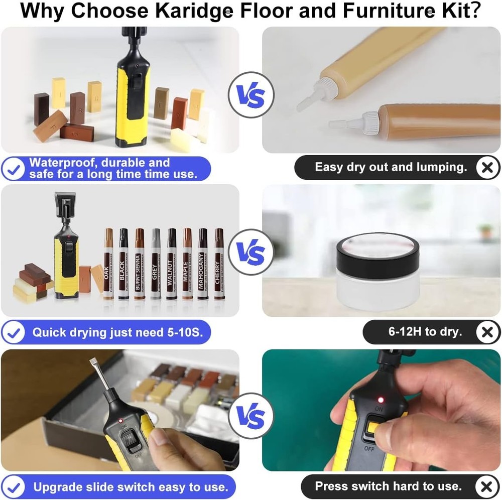 Free eBay listing template designed by dewiso.com Laminate Vinyl Floor Repair Kit with Heat Pen, 11 Colors Hardwood Floor Wax Wood Furniture Touch up Marker Linoleum Lvp Repair Kit Covers Scratches, Stains, Cracks, Holes for Floor, Door, Cabinet FREE AND FAST SHIPPING! Vinyl Floor Repair Kit: Say no to other complicated repair kits and steps, just need a wood floor repair kit for discoloration, stains, scratches, nicks, cracks, or holes on any wood floor and wood furniture luxury vinyl plank, laminate, bed, cabinet, table, frame, door, desk, etc. Your DIY repair work will become simple and professional, also save your time and money Upgraded Hardwood Floor Restoration Kit: After switching from "OFF" to "ON", the heat pen will be heated continuously, you don't need to press the button to heat all the time, after switching from "ON" to "OFF", the heat pen will go off. Anyone can use easily, even for left-handed people, and compared with wood filler and wood putty, our restoration hard wax bars is fast drying and waterproof, after curing, the wax is durable and abrasion resistant Wood and Laminate Floor Furniture Marker Repair Kit More Colors: 11 colors of hard wax strips and 8 wood repair markers can easily match your wooden furniture and floors, high-quality furniture repair repair markers can be used to repair surface scratches or draw wood grain. Apply from light to dark, pay attention to color changes, it is best to mark or blend colors as far as possible where they are not visible, or mix different colors to perfectly match the desired color with your wooden furniture, laminate flooring, vinyl flooring, and linoleum flooring Easy to Use Vinyl Floor Repair Kit: Just put the appropriate color of wax close to the damaged area of the melted wax until it overflows slightly. Wait for a while for the wax to dry, and then use a scraper to remove the excess wax. If necessary, you can use a lighter to speed up the heating of the wax. Excellent Customer Service: We provide a 100% satisfaction customer service team and support 1 year free replacement. If there are any issues with our laminate floor repair kit, we will respond to you within 24 hours Product We offer a 30-Day Return Policy on items which you are not completely satisfied with. You have the option for a full-refund or an exchange of the item. No returns are available on items shipped outside of the US . Shipping We offer Free Shipping to the US and ship within 2 business days of payment, usually sooner. We use UPS express shipping. That's why your products are usually delivered within 3 days . Contact We try our very best to make sure every customer is completely satisfied. If there's a problem , message us! We're happy to help. 24/7 live chat available.