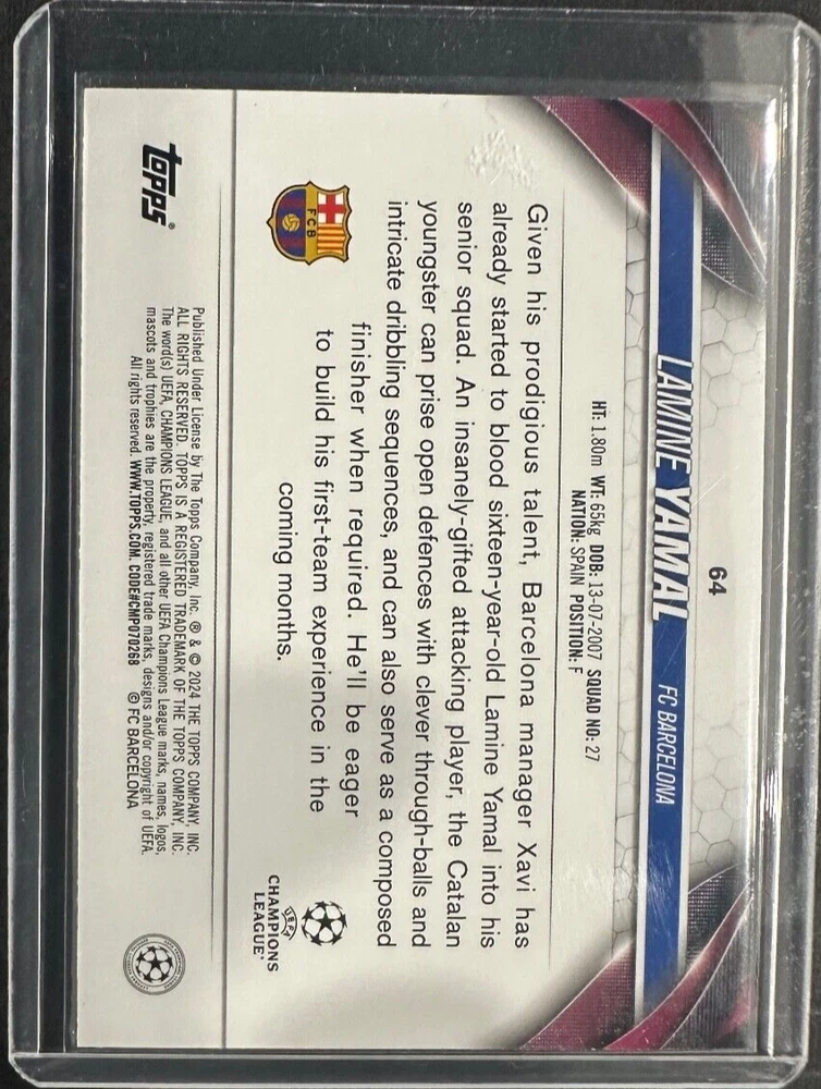 Get your hands on the highly sought-after Lamine Yamal 2024 Topps UEFA Club Competitions Gold Starball Rookie RC #64 trading card! This sports trading card features the promising soccer player and rookie Lamine Yamal, who is sure to make waves in the industry. The card is part of the 2024 Topps set and comes in a rare gold parallel/variety. Manufactured by Topps, this trading card is perfect for avid collectors and fans of the sport alike. With its sleek design and standout features, including the player's name, card number, and season, this card is a must-have for any serious collector. Don't miss out on the chance to add this coveted card to your collection and show your support for Lamine Yamal!