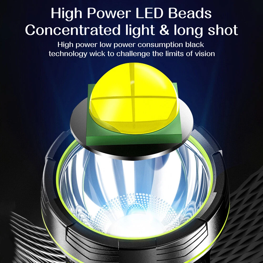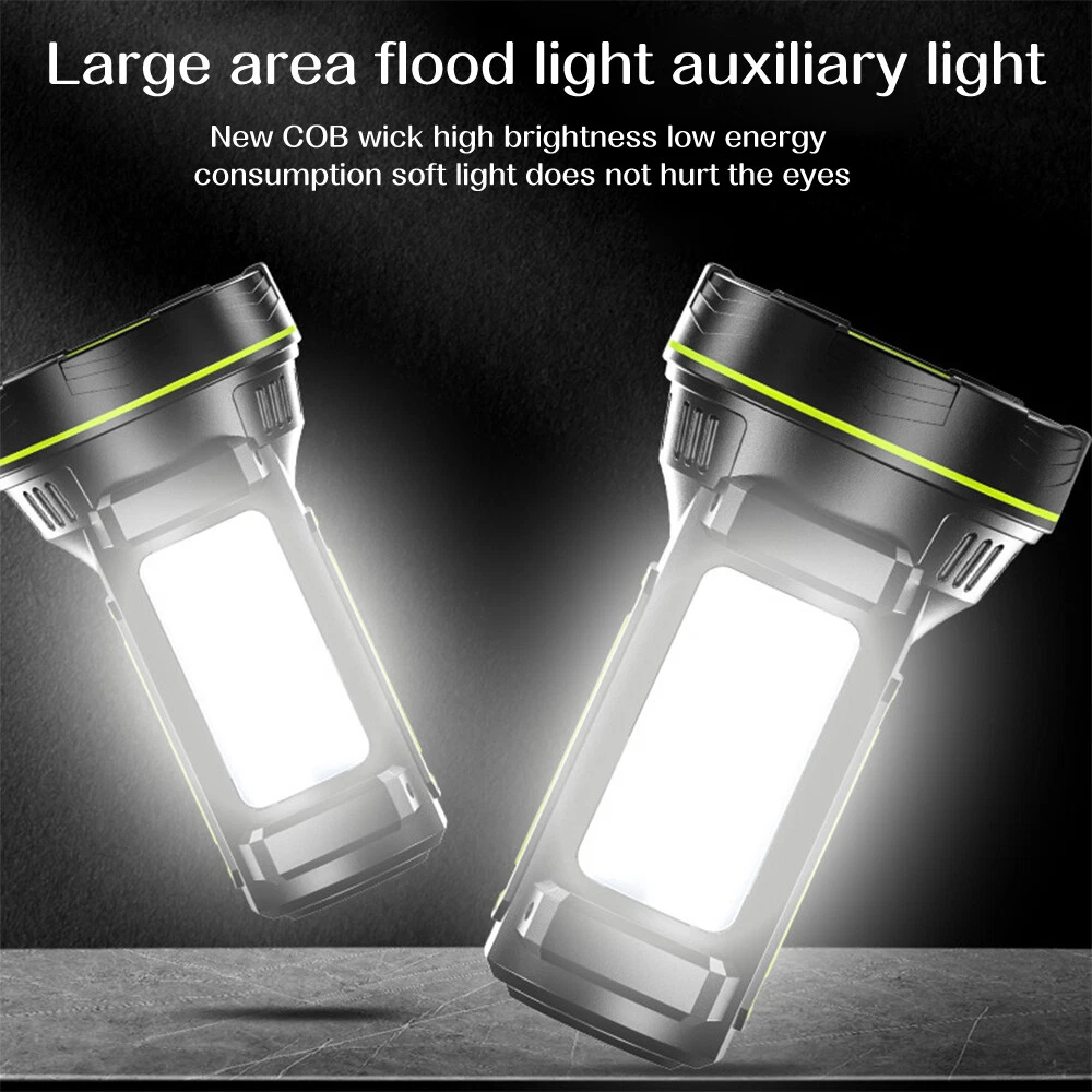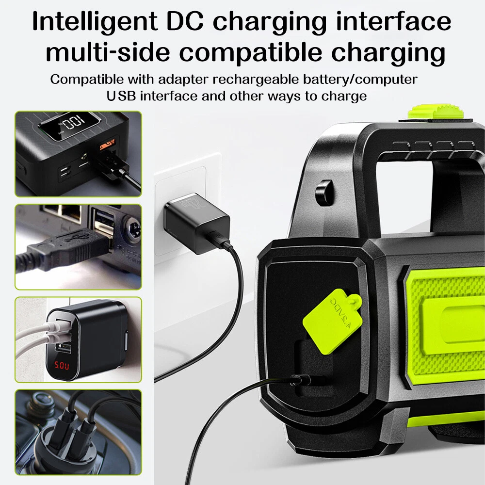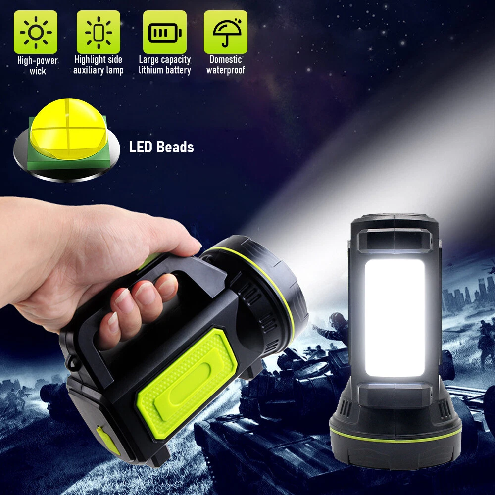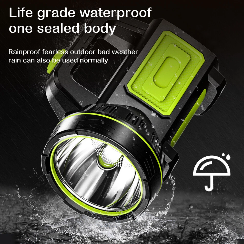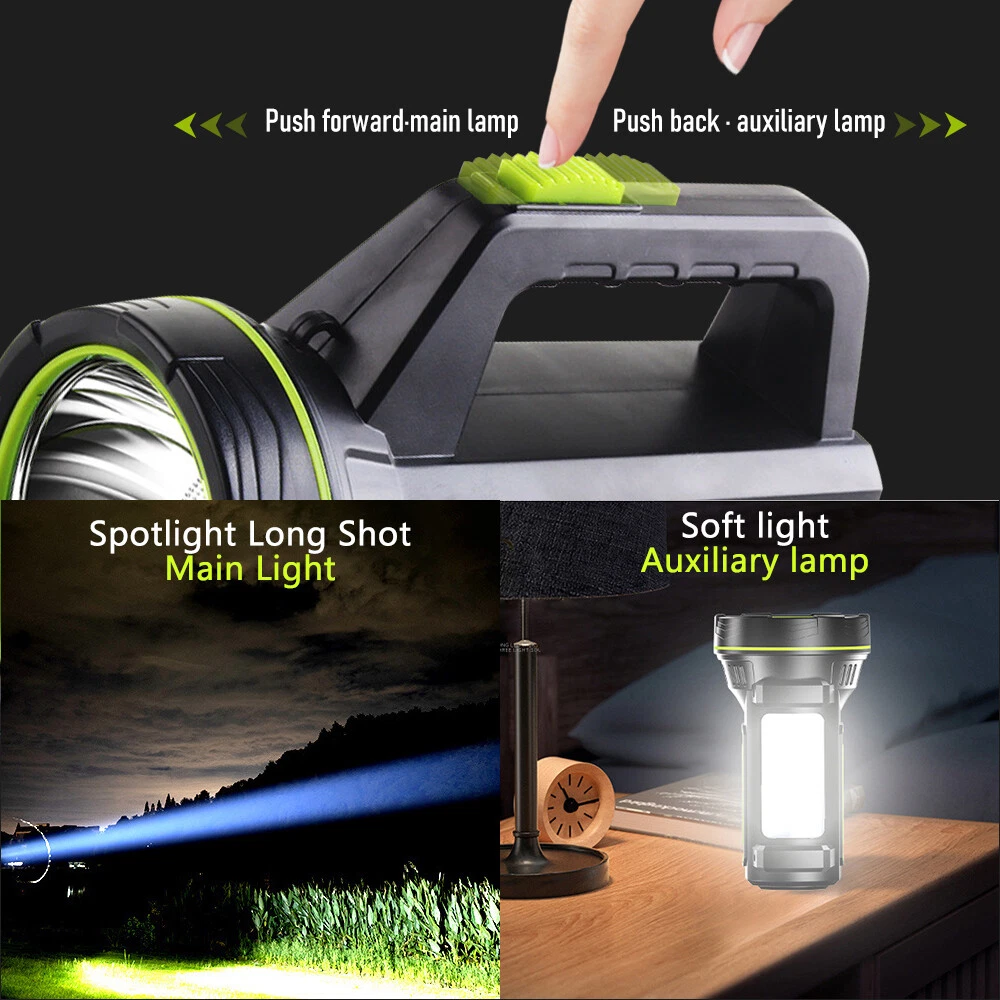 A:W5113 Flashlight with Bracket Features: Super Bright Searchlight: The most updated P90 Chip can generate up to 200000 lumens light output. Irradiation distance is about 1640 feet (500m). 6 Light Modes: front light (High -Medium- Strobe), side light (High-low-Safety warning light) which is a floodlight. You can use it for different lighting requirements. USB & Solar Charging: With built-in 9600mAh large-capacity rechargeable battery, it can be re-charged with the included USB cable for 4-5hrs, without the need of battery replacement. Also, equipped with a solar panel, it can be re-charged by Solar Power (10-20hrs). Waterproof & Durable: IPX5 Waterproof level allows you to use it in rains. Made of high-quality aluminum alloy and ABS material, it is skid-proof, explosion-proof and shockproof. Handy Spotlight: It has a large and anti-slip handle, making it very handy and applicable for hunting, boating, camping, searching, walking dogs, cave exploring, emergency time and home use. 4 Light Colors & Power Bank: White light, blue light, red light and yellow light can be switched easily by putting on the corresponding color lenses. It can also work as a power bank to charge your devices. Power Display: The three blue indicator lights show the BATTERY life(35%, 65%, 100%). Specifications : Type: LED Searchlight Material: ABS + Aluminum alloy Lumen: 200000Lm (high light mode) Waterproof Level: IPX5 (Don’t put it into water) Lifespan: Over 100,000 hours Main Light Mode: About 10 Hrs Sidelight Mode: About 24 Hrs Product battery: 3*3.7v Power Supply: Built-in rechargeable 9600mAh lithium battery (included) 3 Lighting Modes (main light): High/Medium/Strobe 3 Lighting Modes (side light): High/Low/Blue & Red Warning Light Package include: 1 x Searchlight 1 x Charging Cable 1 x Bracket =============================================================================== B :Super Bright Flashlight Feature: 1.USB Rechargeable: Micro USB charging port, supports multiple charging methods, making charging more convenient. 2.Four-level Real-time Power Display: Charging indication: the blue light flashes when charging and stops flashing after fully charged. 3.4 Lighting Modes: strong light-low light-strobe-COB side light. 4.Built-in Large-capacity Battery: 1200mAh lithium battery will allow this headlight to provide long lighting time. 5.Durable to Use with Great Performance: High-quality and high-strength ABS mater ial, large aluminum reflector, high light-gathering performance, enhanced long-distance effect, can emit comfortable and smooth spots. 6.Fast Heat Dissipation: Thick aluminum lamp cup, large area heat dissipation design. 7.Waterproof Design: Waterproof design allows this headlight to be suitable for outdoor use, especially in rainy days, but cannot be immersed in water. 8.Wide Application: It is suitable for outdoor activities, such as fishing, hunting, climbing and camping. Specification: Type: USB Rechargeable Camping Headlight Size: 145.5 * 57mm Waterproof Grade: IPX4 Battery Capacity: 1200mAh 4 Lighting Modes: strong light-low light-strobe-COB side light Micro USB charging port, supports multiple charging methods. Four-level real-time power display, charging indication: the blue light flashes during charging, stops flashing, charging is complete. Four lighting modes, strong light-low light strobe flash-core rod bright side light. Built-in large capacity rechargeable lithium-ion battery. High-quality high-strength absorbing material, large aluminum reflector, high light-gathering performance, enhanced long-distance effect, can emit a comfortable and soft spot. Transparent thick aluminum cup, large area heat dissipation design. Portable flashlight, size as picture, service life waterproof ipx4, not immersed in water. Package Included: 1 * Flashlight 1 * USB Charging Cable ========================================================================= C:Searchlight Torch Features: With side bright light. High quanlity botton - Waterp roof and durable. Long life span 100 thousand hours. Built-in high capacity rechargeable battery. To use energy saving, high effciency, long life time LED. Environmental energy-saving imported LED. Hand-held or stand rechargeable search light. Ultra-long illumination into the product. Product Specification : Type Rechargeable Searchlight Material ABS Plastic Size 15.5*8.5cm/6.1*3.35in Light Source White Light Shell Color Black+Green Waterproof Daily life waterproof (Can't dive) Irradiation Distance 656~1640ft(200~500m) Power: 10W Lumen: 400 LM 2 Lighting Models: Front Searchlight - Side Light Battery Operating Time: 10hs Power: Built-in rechargeable lithium battery 20 00mAH Package Includes : 1 x Rechargeable Searchlight (Battery included) 1 x USB Charging Cable