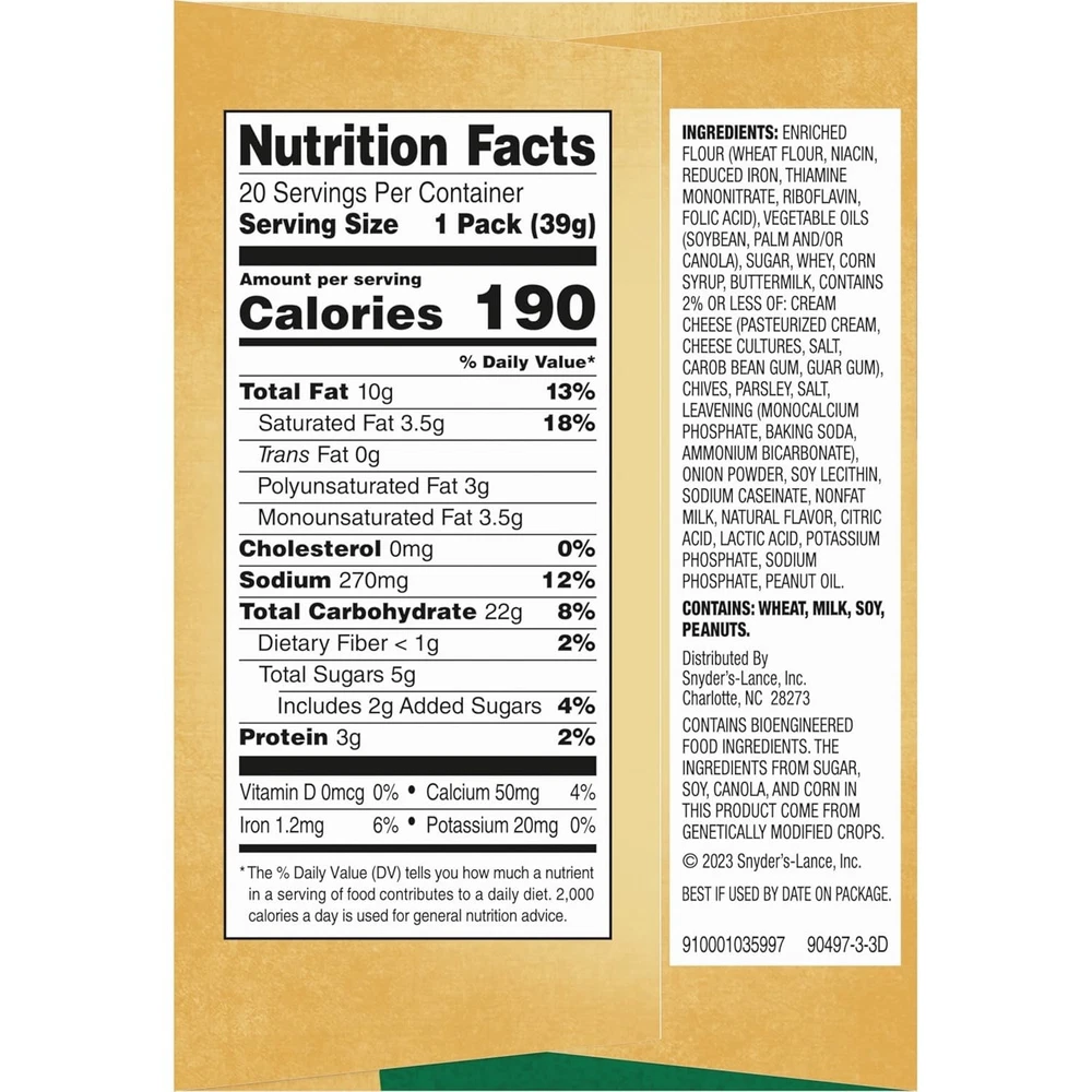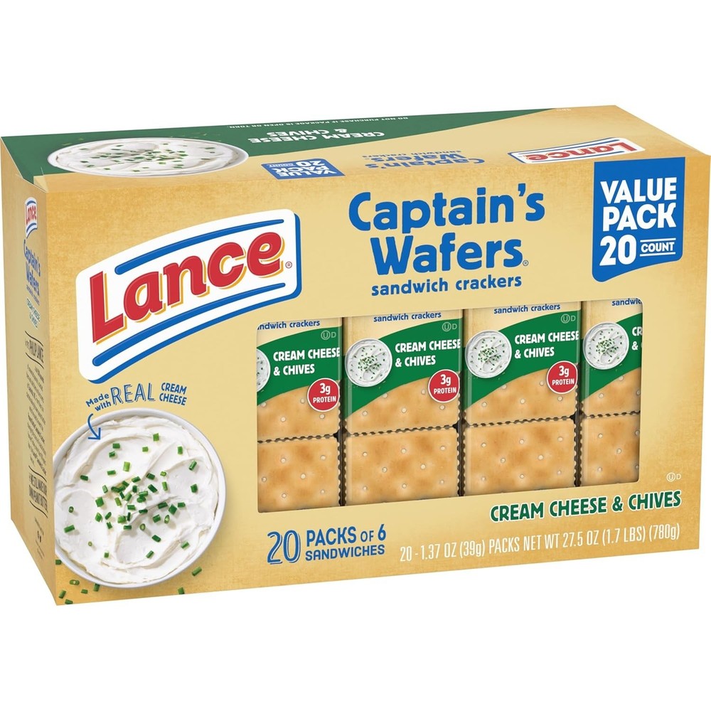 Product Description Get a delicious, full-flavored bite whenever the craving strikes. Lance Captain’s Wafers Cream Cheese and Chives filled Sandwich Crackers make a wonderful savory snack. They feature a delicious blend of ingredients, including real cream cheese, that delivers the full, rich flavor you want paired with the tang of chive. At Lance, sandwiches mean more: they aren’t just two somethings with whatever in the middle. A Lance sandwich is two awesomes with totally incredible in the middle — and we’ve made them that way for over 100 years. Of course, Lance Captain’s Wafers Cream Cheese and Chive-filled Sandwich Crackers are no different. Because every sandwich cracker means more, they’re made to taste incredible. These Captain’s Wafers crackers come in a convenient 20-count package with 6 sandwich crackers per pack, making them ideal for lunch boxes or your on-the-go bags. So, the next time you’re ready to take a moment or need a quick pick-me-up, make it your one and only Lance sandwich crackers, the king of all sandwich crackers. Bring it! Indulge in the classic, savory flavor of Lance Captain’s Wafers Cream Cheese & Chives Sandwich Crackers, a timeless snack that combines light, crispy crackers with a rich, creamy filling. Each sandwich pairs two buttery, flaky wafers with a smooth cream cheese spread expertly blended with fresh, vibrant chives, delivering a perfect balance of tangy and savory notes in every bite. This variety pack contains 20 individually wrapped packs, each holding 6 convenient sandwiches — making it easy to enjoy on the go, whether you’re packing lunches, heading to work or school, or simply need a quick snack to satisfy your hunger between meals. The resealable packs ensure freshness and portion control, helping you manage snacking without any mess or waste. Crafted with high-quality ingredients, Lance Captain’s Wafers are made to maintain their crisp texture and rich flavor, ensuring a consistently delicious experience every time. Whether you’re sharing with friends, family, or enjoying a moment for yourself, these crackers provide a perfect combination of taste, convenience, and satisfaction. Ideal for snack lovers of all ages, they’re a versatile treat that fits into any lifestyle. Elevate your snack game with Lance Captain’s Wafers Cream Cheese & Chives Sandwich Crackers — the perfect blend of creamy, crunchy, and flavorful, ready whenever you are. Features: Crispy, buttery crackers: Light and flaky wafers provide a delightful crunch with every bite. Cream cheese & chives filling: Smooth, tangy cream cheese blended with fresh chives for a flavorful twist. Individually wrapped packs: 20 convenient packs with 6 sandwiches each, perfect for on-the-go snacking. Made with quality ingredients: Crafted to maintain freshness, flavor, and crisp texture. Ideal portion size: Helps with portion control and mess-free snacking. Benefits: Convenient & portable: Individually wrapped packs make it easy to pack in lunches, carry to work, or enjoy anytime. Balanced flavor profile: Creamy and savory filling complements the light crunch of the crackers for a satisfying taste. Great for all ages: A versatile snack that appeals to kids, teens, and adults alike. Perfect anytime snack: Whether as a quick energy boost, party snack, or lunchbox addition, these crackers fit any occasion. Long shelf life: Sealed packaging keeps crackers fresh and crispy until you’re ready to enjoy them Ingredients Ingredients: Enriched Flour (Wheat Flour, Niacin, Reduced Iron, Thiamine Mononitrate, Riboflavin, Folic Acid), Vegetable Oils (Soybean, Palm And/Or Canola), Sugar, Whey, Corn Syrup, Buttermilk, Contains 2% Or Less Of: Cream Cheese (Pasteurized Cream, Cheese Cultures, Salt, Carob Bean Gum, Guar Gum), Chives, Parsley, Salt, Leavening (Monocalcium Phosphate, Baking Soda, Ammonium Bicarbonate), Onion Powder, Soy Lecithin, Sodium Caseinate, Nonfat Milk, Natural Flavor, Citric Acid, Lactic Acid, Potassium Phosphate, Sodium Phosphate, Peanut Oil. Contains: Wheat, Milk, Soy, Peanuts. About this item Flavor Cream Cheese and Chives Brand Lance Item Weight 27.51 Ounces Allergen Information Gluten, Dairy, Peanuts, Milk, Soy, Wheat Specialty No Artificial Flavor, No Artificial Color Cheese-filled sandwich crackers: classic Captain’s Wafers crackers with cream cheese and chive filling Made with real cheese: made with rich cream cheese filling and crispy crackers On-the-go snack: try these cracker packs for lunch breaks, afternoon snacks, and on the go Flavorful snack: Snack on these delicious sandwich crackers to help keep you satisfied 20 cracker packs: value pack of 20 single-serve cracker snack packs, 6 per pack Bring it!: portable snacks, so you’re good to go, wherever you go