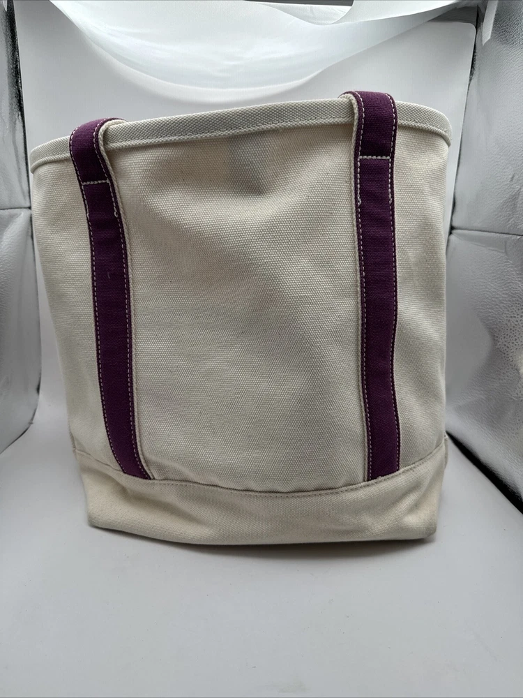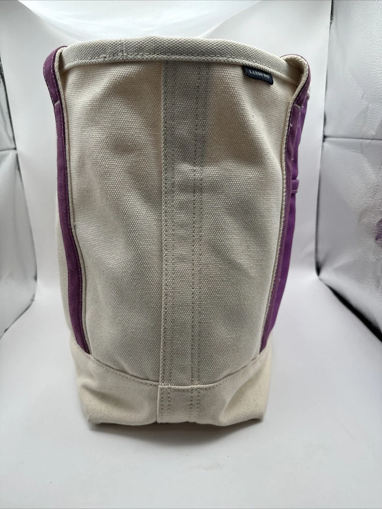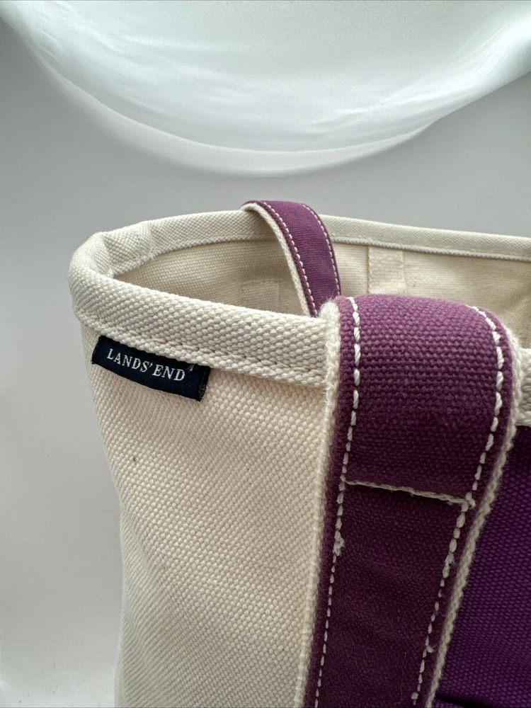 Hardware Color: Silver Accessories: Key Holder Theme: Beach, Classic UPC: Does not apply Exterior Color: Purple Handle/Strap Color: Purple Lining Color: Natural Product Line: Lands End Boat Bag Closure: Open Customized: No Seller Notes: “Pre-owned. Couple of spots as shown, cleaning left to buyer. See measurements and pictures.” Exterior Material: Canvas Vintage: No Size: Medium Style: Tote Brand: Lands' End Lining Material: Cotton Department: Women gtin13: Does not apply Occasion: Casual, Travel Handle Style: Double Handles Handle/Strap Material: Canvas Features: Pockets, Key Ring Finish: Canvas